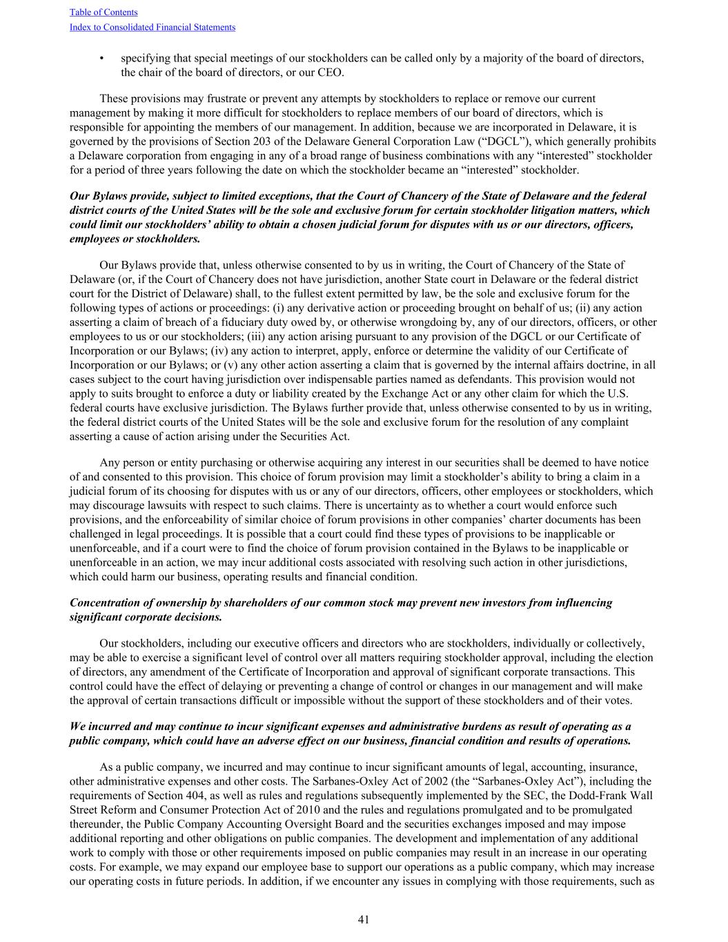 • specifying that special meetings of our stockholders can be called only by a majority of the board of directors, the chair of the board of directors, or our CEO. These provisions may frustrate or prevent any attempts by stockholders to replace or remove our current management by making it more difficult for stockholders to replace members of our board of directors, which is responsible for appointing the members of our management. In addition, because we are incorporated in Delaware, it is governed by the provisions of Section 203 of the Delaware General Corporation Law (“DGCL”), which generally prohibits a Delaware corporation from engaging in any of a broad range of business combinations with any “interested” stockholder for a period of three years following the date on which the stockholder became an “interested” stockholder. Our Bylaws provide, subject to limited exceptions, that the Court of Chancery of the State of Delaware and the federal district courts of the United States will be the sole and exclusive forum for certain stockholder litigation matters, which could limit our stockholders’ ability to obtain a chosen judicial forum for disputes with us or our directors, officers, employees or stockholders. Our Bylaws provide that, unless otherwise consented to by us in writing, the Court of Chancery of the State of Delaware (or, if the Court of Chancery does not have jurisdiction, another State court in Delaware or the federal district court for the District of Delaware) shall, to the fullest extent permitted by law, be the sole and exclusive forum for the following types of actions or proceedings: (i) any derivative action or proceeding brought on behalf of us; (ii) any action asserting a claim of breach of a fiduciary duty owed by, or otherwise wrongdoing by, any of our directors, officers, or other employees to us or our stockholders; (iii) any action arising pursuant to any provision of the DGCL or our Certificate of Incorporation or our Bylaws; (iv) any action to interpret, apply, enforce or determine the validity of our Certificate of Incorporation or our Bylaws; or (v) any other action asserting a claim that is governed by the internal affairs doctrine, in all cases subject to the court having jurisdiction over indispensable parties named as defendants. This provision would not apply to suits brought to enforce a duty or liability created by the Exchange Act or any other claim for which the U.S. federal courts have exclusive jurisdiction. The Bylaws further provide that, unless otherwise consented to by us in writing, the federal district courts of the United States will be the sole and exclusive forum for the resolution of any complaint asserting a cause of action arising under the Securities Act. Any person or entity purchasing or otherwise acquiring any interest in our securities shall be deemed to have notice of and consented to this provision. This choice of forum provision may limit a stockholder’s ability to bring a claim in a judicial forum of its choosing for disputes with us or any of our directors, officers, other employees or stockholders, which may discourage lawsuits with respect to such claims. There is uncertainty as to whether a court would enforce such provisions, and the enforceability of similar choice of forum provisions in other companies’ charter documents has been challenged in legal proceedings. It is possible that a court could find these types of provisions to be inapplicable or unenforceable, and if a court were to find the choice of forum provision contained in the Bylaws to be inapplicable or unenforceable in an action, we may incur additional costs associated with resolving such action in other jurisdictions, which could harm our business, operating results and financial condition. Concentration of ownership by shareholders of our common stock may prevent new investors from influencing significant corporate decisions. Our stockholders, including our executive officers and directors who are stockholders, individually or collectively, may be able to exercise a significant level of control over all matters requiring stockholder approval, including the election of directors, any amendment of the Certificate of Incorporation and approval of significant corporate transactions. This control could have the effect of delaying or preventing a change of control or changes in our management and will make the approval of certain transactions difficult or impossible without the support of these stockholders and of their votes. We incurred and may continue to incur significant expenses and administrative burdens as result of operating as a public company, which could have an adverse effect on our business, financial condition and results of operations. As a public company, we incurred and may continue to incur significant amounts of legal, accounting, insurance, other administrative expenses and other costs. The Sarbanes-Oxley Act of 2002 (the “Sarbanes-Oxley Act”), including the requirements of Section 404, as well as rules and regulations subsequently implemented by the SEC, the Dodd-Frank Wall Street Reform and Consumer Protection Act of 2010 and the rules and regulations promulgated and to be promulgated thereunder, the Public Company Accounting Oversight Board and the securities exchanges imposed and may impose additional reporting and other obligations on public companies. The development and implementation of any additional work to comply with those or other requirements imposed on public companies may result in an increase in our operating costs. For example, we may expand our employee base to support our operations as a public company, which may increase our operating costs in future periods. In addition, if we encounter any issues in complying with those requirements, such as Table of Contents Index to Consolidated Financial Statements 41