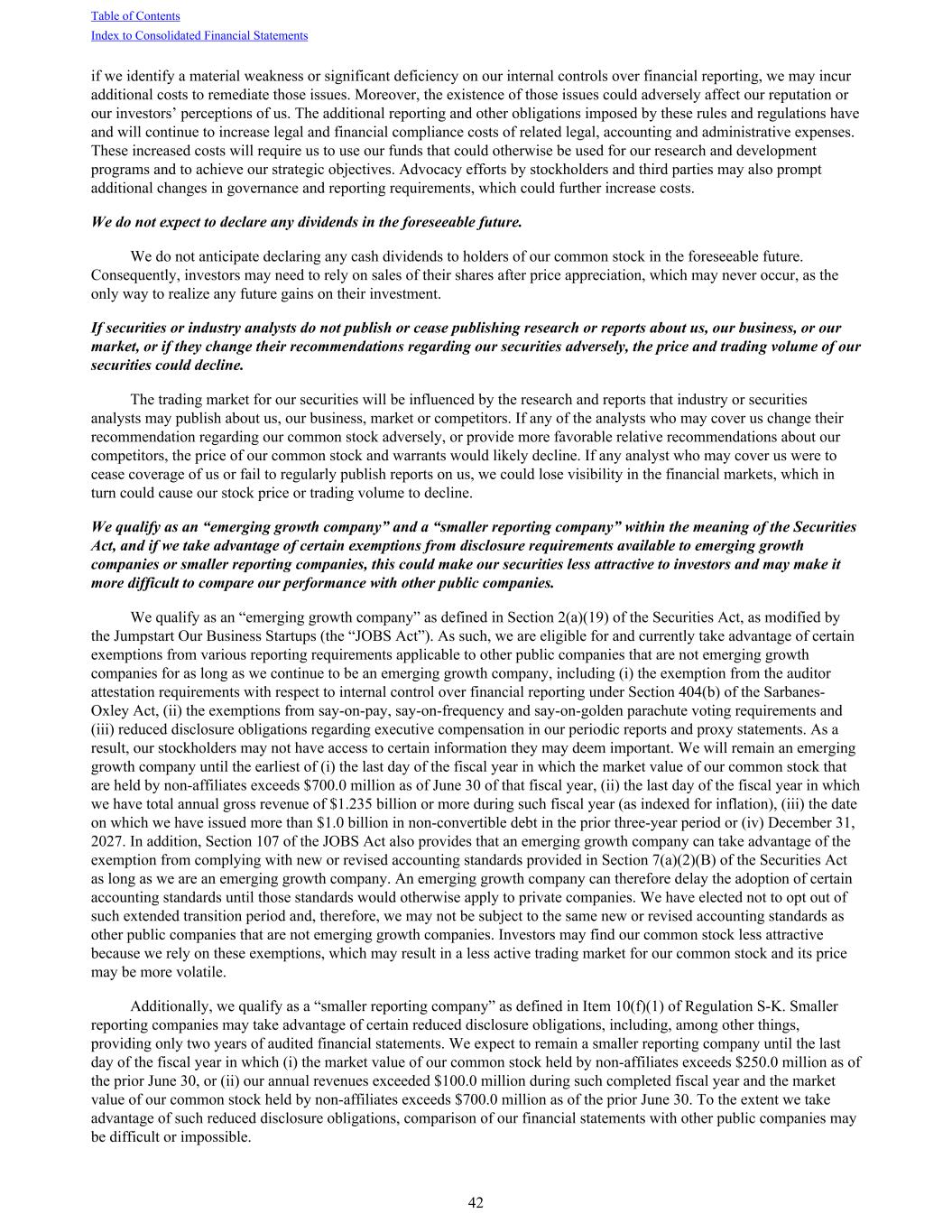 if we identify a material weakness or significant deficiency on our internal controls over financial reporting, we may incur additional costs to remediate those issues. Moreover, the existence of those issues could adversely affect our reputation or our investors’ perceptions of us. The additional reporting and other obligations imposed by these rules and regulations have and will continue to increase legal and financial compliance costs of related legal, accounting and administrative expenses. These increased costs will require us to use our funds that could otherwise be used for our research and development programs and to achieve our strategic objectives. Advocacy efforts by stockholders and third parties may also prompt additional changes in governance and reporting requirements, which could further increase costs. We do not expect to declare any dividends in the foreseeable future. We do not anticipate declaring any cash dividends to holders of our common stock in the foreseeable future. Consequently, investors may need to rely on sales of their shares after price appreciation, which may never occur, as the only way to realize any future gains on their investment. If securities or industry analysts do not publish or cease publishing research or reports about us, our business, or our market, or if they change their recommendations regarding our securities adversely, the price and trading volume of our securities could decline. The trading market for our securities will be influenced by the research and reports that industry or securities analysts may publish about us, our business, market or competitors. If any of the analysts who may cover us change their recommendation regarding our common stock adversely, or provide more favorable relative recommendations about our competitors, the price of our common stock and warrants would likely decline. If any analyst who may cover us were to cease coverage of us or fail to regularly publish reports on us, we could lose visibility in the financial markets, which in turn could cause our stock price or trading volume to decline. We qualify as an “emerging growth company” and a “smaller reporting company” within the meaning of the Securities Act, and if we take advantage of certain exemptions from disclosure requirements available to emerging growth companies or smaller reporting companies, this could make our securities less attractive to investors and may make it more difficult to compare our performance with other public companies. We qualify as an “emerging growth company” as defined in Section 2(a)(19) of the Securities Act, as modified by the Jumpstart Our Business Startups (the “JOBS Act”). As such, we are eligible for and currently take advantage of certain exemptions from various reporting requirements applicable to other public companies that are not emerging growth companies for as long as we continue to be an emerging growth company, including (i) the exemption from the auditor attestation requirements with respect to internal control over financial reporting under Section 404(b) of the Sarbanes- Oxley Act, (ii) the exemptions from say-on-pay, say-on-frequency and say-on-golden parachute voting requirements and (iii) reduced disclosure obligations regarding executive compensation in our periodic reports and proxy statements. As a result, our stockholders may not have access to certain information they may deem important. We will remain an emerging growth company until the earliest of (i) the last day of the fiscal year in which the market value of our common stock that are held by non-affiliates exceeds $700.0 million as of June 30 of that fiscal year, (ii) the last day of the fiscal year in which we have total annual gross revenue of $1.235 billion or more during such fiscal year (as indexed for inflation), (iii) the date on which we have issued more than $1.0 billion in non-convertible debt in the prior three-year period or (iv) December 31, 2027. In addition, Section 107 of the JOBS Act also provides that an emerging growth company can take advantage of the exemption from complying with new or revised accounting standards provided in Section 7(a)(2)(B) of the Securities Act as long as we are an emerging growth company. An emerging growth company can therefore delay the adoption of certain accounting standards until those standards would otherwise apply to private companies. We have elected not to opt out of such extended transition period and, therefore, we may not be subject to the same new or revised accounting standards as other public companies that are not emerging growth companies. Investors may find our common stock less attractive because we rely on these exemptions, which may result in a less active trading market for our common stock and its price may be more volatile. Additionally, we qualify as a “smaller reporting company” as defined in Item 10(f)(1) of Regulation S-K. Smaller reporting companies may take advantage of certain reduced disclosure obligations, including, among other things, providing only two years of audited financial statements. We expect to remain a smaller reporting company until the last day of the fiscal year in which (i) the market value of our common stock held by non-affiliates exceeds $250.0 million as of the prior June 30, or (ii) our annual revenues exceeded $100.0 million during such completed fiscal year and the market value of our common stock held by non-affiliates exceeds $700.0 million as of the prior June 30. To the extent we take advantage of such reduced disclosure obligations, comparison of our financial statements with other public companies may be difficult or impossible. Table of Contents Index to Consolidated Financial Statements 42