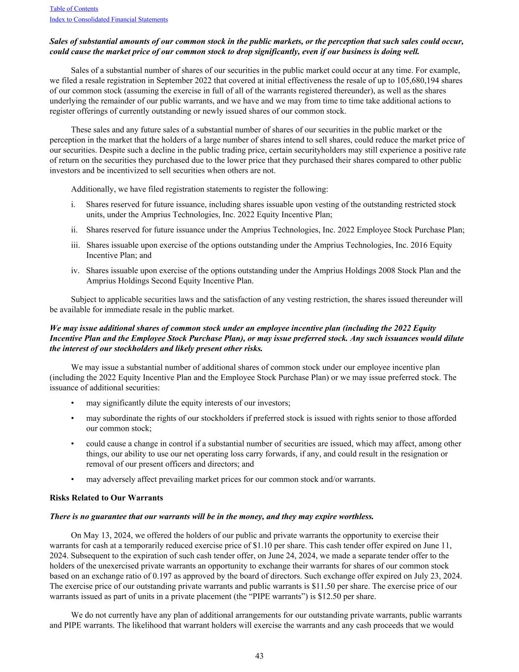 Sales of substantial amounts of our common stock in the public markets, or the perception that such sales could occur, could cause the market price of our common stock to drop significantly, even if our business is doing well. Sales of a substantial number of shares of our securities in the public market could occur at any time. For example, we filed a resale registration in September 2022 that covered at initial effectiveness the resale of up to 105,680,194 shares of our common stock (assuming the exercise in full of all of the warrants registered thereunder), as well as the shares underlying the remainder of our public warrants, and we have and we may from time to time take additional actions to register offerings of currently outstanding or newly issued shares of our common stock. These sales and any future sales of a substantial number of shares of our securities in the public market or the perception in the market that the holders of a large number of shares intend to sell shares, could reduce the market price of our securities. Despite such a decline in the public trading price, certain securityholders may still experience a positive rate of return on the securities they purchased due to the lower price that they purchased their shares compared to other public investors and be incentivized to sell securities when others are not. Additionally, we have filed registration statements to register the following: i. Shares reserved for future issuance, including shares issuable upon vesting of the outstanding restricted stock units, under the Amprius Technologies, Inc. 2022 Equity Incentive Plan; ii. Shares reserved for future issuance under the Amprius Technologies, Inc. 2022 Employee Stock Purchase Plan; iii. Shares issuable upon exercise of the options outstanding under the Amprius Technologies, Inc. 2016 Equity Incentive Plan; and iv. Shares issuable upon exercise of the options outstanding under the Amprius Holdings 2008 Stock Plan and the Amprius Holdings Second Equity Incentive Plan. Subject to applicable securities laws and the satisfaction of any vesting restriction, the shares issued thereunder will be available for immediate resale in the public market. We may issue additional shares of common stock under an employee incentive plan (including the 2022 Equity Incentive Plan and the Employee Stock Purchase Plan), or may issue preferred stock. Any such issuances would dilute the interest of our stockholders and likely present other risks. We may issue a substantial number of additional shares of common stock under our employee incentive plan (including the 2022 Equity Incentive Plan and the Employee Stock Purchase Plan) or we may issue preferred stock. The issuance of additional securities: • may significantly dilute the equity interests of our investors; • may subordinate the rights of our stockholders if preferred stock is issued with rights senior to those afforded our common stock; • could cause a change in control if a substantial number of securities are issued, which may affect, among other things, our ability to use our net operating loss carry forwards, if any, and could result in the resignation or removal of our present officers and directors; and • may adversely affect prevailing market prices for our common stock and/or warrants. Risks Related to Our Warrants There is no guarantee that our warrants will be in the money, and they may expire worthless. On May 13, 2024, we offered the holders of our public and private warrants the opportunity to exercise their warrants for cash at a temporarily reduced exercise price of $1.10 per share. This cash tender offer expired on June 11, 2024. Subsequent to the expiration of such cash tender offer, on June 24, 2024, we made a separate tender offer to the holders of the unexercised private warrants an opportunity to exchange their warrants for shares of our common stock based on an exchange ratio of 0.197 as approved by the board of directors. Such exchange offer expired on July 23, 2024. The exercise price of our outstanding private warrants and public warrants is $11.50 per share. The exercise price of our warrants issued as part of units in a private placement (the “PIPE warrants”) is $12.50 per share. We do not currently have any plan of additional arrangements for our outstanding private warrants, public warrants and PIPE warrants. The likelihood that warrant holders will exercise the warrants and any cash proceeds that we would Table of Contents Index to Consolidated Financial Statements 43