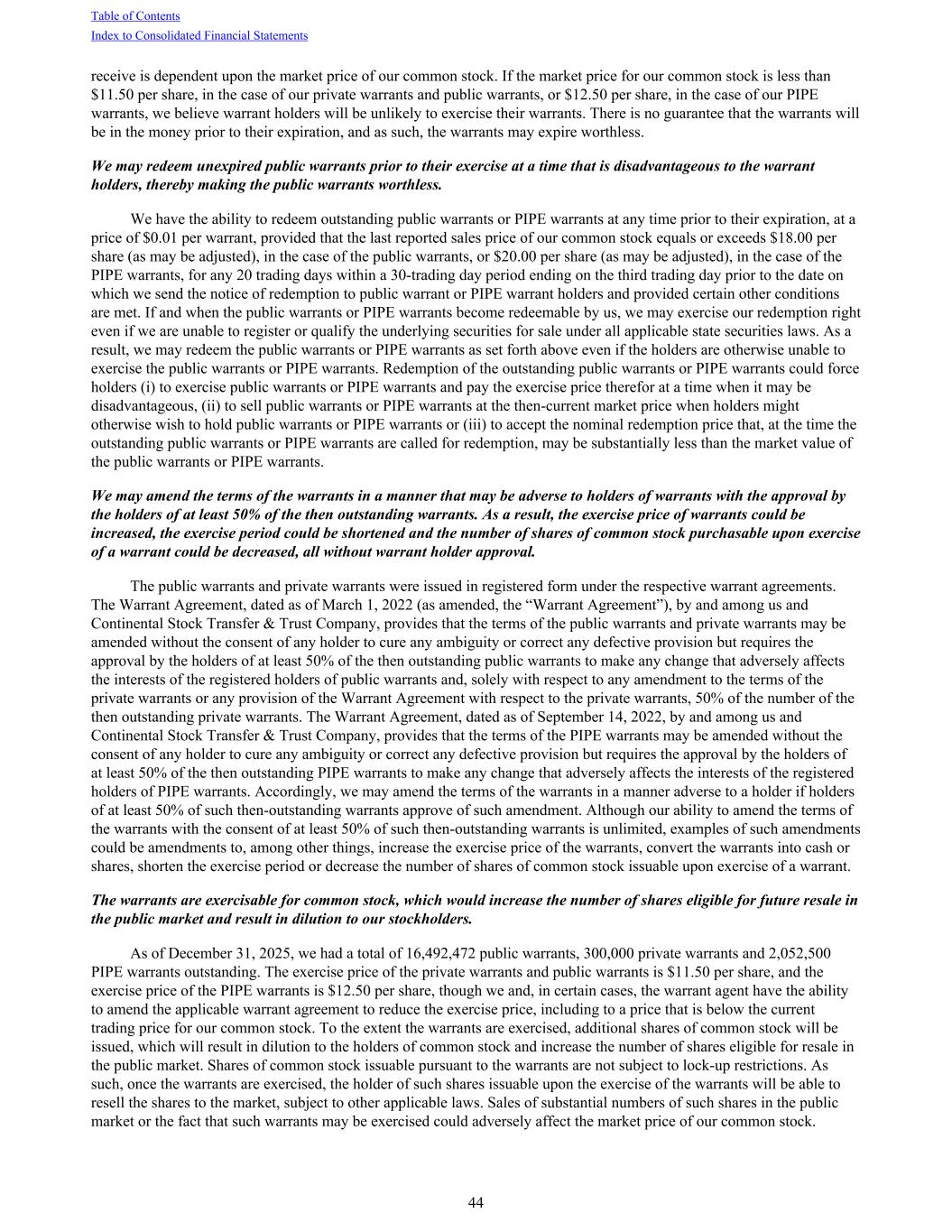 receive is dependent upon the market price of our common stock. If the market price for our common stock is less than $11.50 per share, in the case of our private warrants and public warrants, or $12.50 per share, in the case of our PIPE warrants, we believe warrant holders will be unlikely to exercise their warrants. There is no guarantee that the warrants will be in the money prior to their expiration, and as such, the warrants may expire worthless. We may redeem unexpired public warrants prior to their exercise at a time that is disadvantageous to the warrant holders, thereby making the public warrants worthless. We have the ability to redeem outstanding public warrants or PIPE warrants at any time prior to their expiration, at a price of $0.01 per warrant, provided that the last reported sales price of our common stock equals or exceeds $18.00 per share (as may be adjusted), in the case of the public warrants, or $20.00 per share (as may be adjusted), in the case of the PIPE warrants, for any 20 trading days within a 30-trading day period ending on the third trading day prior to the date on which we send the notice of redemption to public warrant or PIPE warrant holders and provided certain other conditions are met. If and when the public warrants or PIPE warrants become redeemable by us, we may exercise our redemption right even if we are unable to register or qualify the underlying securities for sale under all applicable state securities laws. As a result, we may redeem the public warrants or PIPE warrants as set forth above even if the holders are otherwise unable to exercise the public warrants or PIPE warrants. Redemption of the outstanding public warrants or PIPE warrants could force holders (i) to exercise public warrants or PIPE warrants and pay the exercise price therefor at a time when it may be disadvantageous, (ii) to sell public warrants or PIPE warrants at the then-current market price when holders might otherwise wish to hold public warrants or PIPE warrants or (iii) to accept the nominal redemption price that, at the time the outstanding public warrants or PIPE warrants are called for redemption, may be substantially less than the market value of the public warrants or PIPE warrants. We may amend the terms of the warrants in a manner that may be adverse to holders of warrants with the approval by the holders of at least 50% of the then outstanding warrants. As a result, the exercise price of warrants could be increased, the exercise period could be shortened and the number of shares of common stock purchasable upon exercise of a warrant could be decreased, all without warrant holder approval. The public warrants and private warrants were issued in registered form under the respective warrant agreements. The Warrant Agreement, dated as of March 1, 2022 (as amended, the “Warrant Agreement”), by and among us and Continental Stock Transfer & Trust Company, provides that the terms of the public warrants and private warrants may be amended without the consent of any holder to cure any ambiguity or correct any defective provision but requires the approval by the holders of at least 50% of the then outstanding public warrants to make any change that adversely affects the interests of the registered holders of public warrants and, solely with respect to any amendment to the terms of the private warrants or any provision of the Warrant Agreement with respect to the private warrants, 50% of the number of the then outstanding private warrants. The Warrant Agreement, dated as of September 14, 2022, by and among us and Continental Stock Transfer & Trust Company, provides that the terms of the PIPE warrants may be amended without the consent of any holder to cure any ambiguity or correct any defective provision but requires the approval by the holders of at least 50% of the then outstanding PIPE warrants to make any change that adversely affects the interests of the registered holders of PIPE warrants. Accordingly, we may amend the terms of the warrants in a manner adverse to a holder if holders of at least 50% of such then-outstanding warrants approve of such amendment. Although our ability to amend the terms of the warrants with the consent of at least 50% of such then-outstanding warrants is unlimited, examples of such amendments could be amendments to, among other things, increase the exercise price of the warrants, convert the warrants into cash or shares, shorten the exercise period or decrease the number of shares of common stock issuable upon exercise of a warrant. The warrants are exercisable for common stock, which would increase the number of shares eligible for future resale in the public market and result in dilution to our stockholders. As of December 31, 2025, we had a total of 16,492,472 public warrants, 300,000 private warrants and 2,052,500 PIPE warrants outstanding. The exercise price of the private warrants and public warrants is $11.50 per share, and the exercise price of the PIPE warrants is $12.50 per share, though we and, in certain cases, the warrant agent have the ability to amend the applicable warrant agreement to reduce the exercise price, including to a price that is below the current trading price for our common stock. To the extent the warrants are exercised, additional shares of common stock will be issued, which will result in dilution to the holders of common stock and increase the number of shares eligible for resale in the public market. Shares of common stock issuable pursuant to the warrants are not subject to lock-up restrictions. As such, once the warrants are exercised, the holder of such shares issuable upon the exercise of the warrants will be able to resell the shares to the market, subject to other applicable laws. Sales of substantial numbers of such shares in the public market or the fact that such warrants may be exercised could adversely affect the market price of our common stock. Table of Contents Index to Consolidated Financi