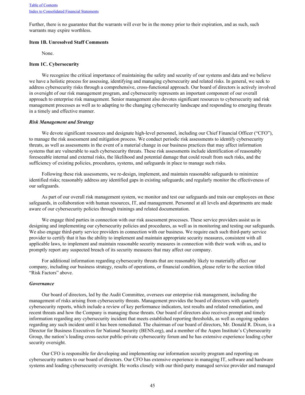 Further, there is no guarantee that the warrants will ever be in the money prior to their expiration, and as such, such warrants may expire worthless. Item 1B. Unresolved Staff Comments None. Item 1C. Cybersecurity We recognize the critical importance of maintaining the safety and security of our systems and data and we believe we have a holistic process for assessing, identifying and managing cybersecurity and related risks. In general, we seek to address cybersecurity risks through a comprehensive, cross-functional approach. Our board of directors is actively involved in oversight of our risk management program, and cybersecurity represents an important component of our overall approach to enterprise risk management. Senior management also devotes significant resources to cybersecurity and risk management processes as well as to adapting to the changing cybersecurity landscape and responding to emerging threats in a timely and effective manner. Risk Management and Strategy We devote significant resources and designate high-level personnel, including our Chief Financial Officer (“CFO”), to manage the risk assessment and mitigation process. We conduct periodic risk assessments to identify cybersecurity threats, as well as assessments in the event of a material change in our business practices that may affect information systems that are vulnerable to such cybersecurity threats. These risk assessments include identification of reasonably foreseeable internal and external risks, the likelihood and potential damage that could result from such risks, and the sufficiency of existing policies, procedures, systems, and safeguards in place to manage such risks. Following these risk assessments, we re-design, implement, and maintain reasonable safeguards to minimize identified risks; reasonably address any identified gaps in existing safeguards; and regularly monitor the effectiveness of our safeguards. As part of our overall risk management system, we monitor and test our safeguards and train our employees on these safeguards, in collaboration with human resources, IT, and management. Personnel at all levels and departments are made aware of our cybersecurity policies through trainings and related documentation. We engage third parties in connection with our risk assessment processes. These service providers assist us in designing and implementing our cybersecurity policies and procedures, as well as in monitoring and testing our safeguards. We also engage third-party service providers in connection with our business. We require each such third-party service provider to certify that it has the ability to implement and maintain appropriate security measures, consistent with all applicable laws, to implement and maintain reasonable security measures in connection with their work with us, and to promptly report any suspected breach of its security measures that may affect our company. For additional information regarding cybersecurity threats that are reasonably likely to materially affect our company, including our business strategy, results of operations, or financial condition, please refer to the section titled “Risk Factors” above. Governance Our board of directors, led by the Audit Committee, oversees our enterprise risk management, including the management of risks arising from cybersecurity threats. Management provides the board of directors with quarterly cybersecurity reports, which include a review of key performance indicators, test results and related remediation, and recent threats and how the Company is managing those threats. Our board of directors also receives prompt and timely information regarding any cybersecurity incident that meets established reporting thresholds, as well as ongoing updates regarding any such incident until it has been remediated. The chairman of our board of directors, Mr. Donald R. Dixon, is a Director for Business Executives for National Security (BENS.org), and a member of the Aspen Institute’s Cybersecurity Group, the nation’s leading cross-sector public-private cybersecurity forum and he has extensive experience leading cyber security oversight. Our CFO is responsible for developing and implementing our information security program and reporting on cybersecurity matters to our board of directors. Our CFO has extensive experience in managing IT, software and hardware systems and leading cybersecurity oversight. He works closely with our third-party managed service provider and managed Table of Contents Index to Consolidated Financial Statements 45