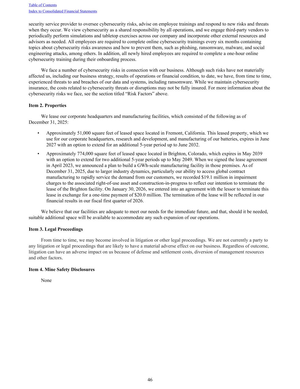 security service provider to oversee cybersecurity risks, advise on employee trainings and respond to new risks and threats when they occur. We view cybersecurity as a shared responsibility by all operations, and we engage third-party vendors to periodically perform simulations and tabletop exercises across our company and incorporate other external resources and advisors as needed. All employees are required to complete online cybersecurity trainings every six months containing topics about cybersecurity risks awareness and how to prevent them, such as phishing, ransomware, malware, and social engineering attacks, among others. In addition, all newly hired employees are required to complete a one-hour online cybersecurity training during their onboarding process. We face a number of cybersecurity risks in connection with our business. Although such risks have not materially affected us, including our business strategy, results of operations or financial condition, to date, we have, from time to time, experienced threats to and breaches of our data and systems, including ransomware. While we maintain cybersecurity insurance, the costs related to cybersecurity threats or disruptions may not be fully insured. For more information about the cybersecurity risks we face, see the section titled “Risk Factors” above. Item 2. Properties We lease our corporate headquarters and manufacturing facilities, which consisted of the following as of December 31, 2025: • Approximately 51,000 square feet of leased space located in Fremont, California. This leased property, which we use for our corporate headquarters, research and development, and manufacturing of our batteries, expires in June 2027 with an option to extend for an additional 5-year period up to June 2032. • Approximately 774,000 square feet of leased space located in Brighton, Colorado, which expires in May 2039 with an option to extend for two additional 5-year periods up to May 2049. When we signed the lease agreement in April 2023, we announced a plan to build a GWh-scale manufacturing facility in those premises. As of December 31, 2025, due to larger industry dynamics, particularly our ability to access global contract manufacturing to rapidly service the demand from our customers, we recorded $19.1 million in impairment charges to the associated right-of-use asset and construction-in-progress to reflect our intention to terminate the lease of the Brighton facility. On January 30, 2026, we entered into an agreement with the lessor to terminate this lease in exchange for a one-time payment of $20.0 million. The termination of the lease will be reflected in our financial results in our fiscal first quarter of 2026. We believe that our facilities are adequate to meet our needs for the immediate future, and that, should it be needed, suitable additional space will be available to accommodate any such expansion of our operations. Item 3. Legal Proceedings From time to time, we may become involved in litigation or other legal proceedings. We are not currently a party to any litigation or legal proceedings that are likely to have a material adverse effect on our business. Regardless of outcome, litigation can have an adverse impact on us because of defense and settlement costs, diversion of management resources and other factors. Item 4. Mine Safety Disclosures None Table of Contents Index to Consolidated Financial Statements 46
