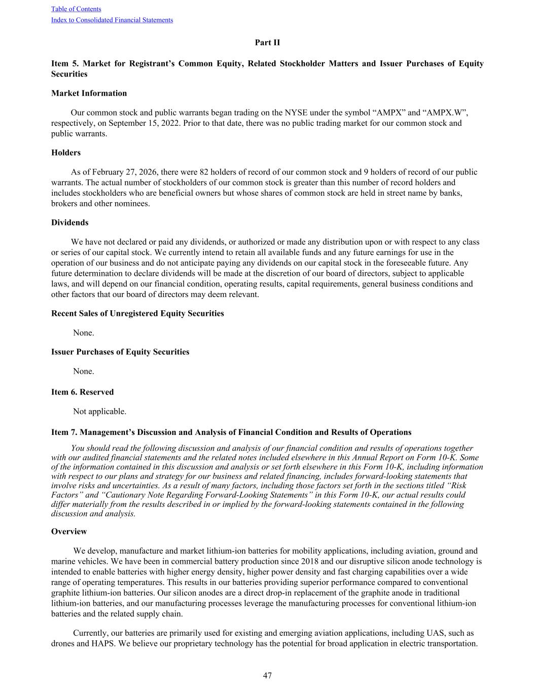 Part II Item 5. Market for Registrant’s Common Equity, Related Stockholder Matters and Issuer Purchases of Equity Securities Market Information Our common stock and public warrants began trading on the NYSE under the symbol “AMPX” and “AMPX.W”, respectively, on September 15, 2022. Prior to that date, there was no public trading market for our common stock and public warrants. Holders As of February 27, 2026, there were 82 holders of record of our common stock and 9 holders of record of our public warrants. The actual number of stockholders of our common stock is greater than this number of record holders and includes stockholders who are beneficial owners but whose shares of common stock are held in street name by banks, brokers and other nominees. Dividends We have not declared or paid any dividends, or authorized or made any distribution upon or with respect to any class or series of our capital stock. We currently intend to retain all available funds and any future earnings for use in the operation of our business and do not anticipate paying any dividends on our capital stock in the foreseeable future. Any future determination to declare dividends will be made at the discretion of our board of directors, subject to applicable laws, and will depend on our financial condition, operating results, capital requirements, general business conditions and other factors that our board of directors may deem relevant. Recent Sales of Unregistered Equity Securities None. Issuer Purchases of Equity Securities None. Item 6. Reserved Not applicable. Item 7. Management’s Discussion and Analysis of Financial Condition and Results of Operations You should read the following discussion and analysis of our financial condition and results of operations together with our audited financial statements and the related notes included elsewhere in this Annual Report on Form 10-K. Some of the information contained in this discussion and analysis or set forth elsewhere in this Form 10-K, including information with respect to our plans and strategy for our business and related financing, includes forward-looking statements that involve risks and uncertainties. As a result of many factors, including those factors set forth in the sections titled “Risk Factors” and “Cautionary Note Regarding Forward-Looking Statements” in this Form 10-K, our actual results could differ materially from the results described in or implied by the forward-looking statements contained in the following discussion and analysis. Overview We develop, manufacture and market lithium-ion batteries for mobility applications, including aviation, ground and marine vehicles. We have been in commercial battery production since 2018 and our disruptive silicon anode technology is intended to enable batteries with higher energy density, higher power density and fast charging capabilities over a wide range of operating temperatures. This results in our batteries providing superior performance compared to conventional graphite lithium-ion batteries. Our silicon anodes are a direct drop-in replacement of the graphite anode in traditional lithium-ion batteries, and our manufacturing processes leverage the manufacturing processes for conventional lithium-ion batteries and the related supply chain. Currently, our batteries are primarily used for existing and emerging aviation applications, including UAS, such as drones and HAPS. We believe our proprietary technology has the potential for broad application in electric transportation. Table of Contents Index to Consolidated Financial Statements 47