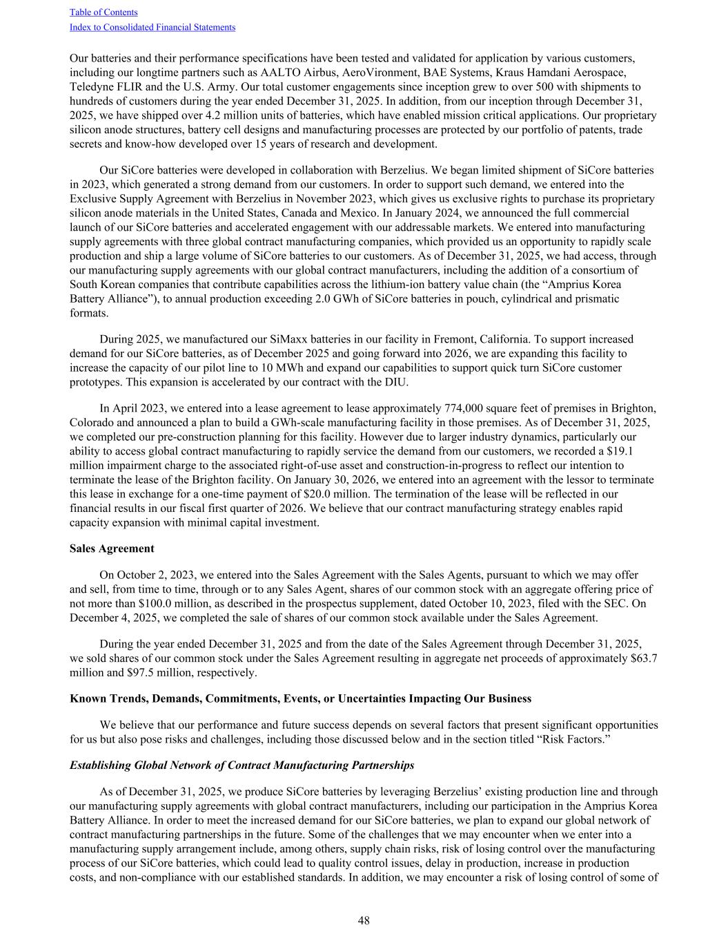Our batteries and their performance specifications have been tested and validated for application by various customers, including our longtime partners such as AALTO Airbus, AeroVironment, BAE Systems, Kraus Hamdani Aerospace, Teledyne FLIR and the U.S. Army. Our total customer engagements since inception grew to over 500 with shipments to hundreds of customers during the year ended December 31, 2025. In addition, from our inception through December 31, 2025, we have shipped over 4.2 million units of batteries, which have enabled mission critical applications. Our proprietary silicon anode structures, battery cell designs and manufacturing processes are protected by our portfolio of patents, trade secrets and know-how developed over 15 years of research and development. Our SiCore batteries were developed in collaboration with Berzelius. We began limited shipment of SiCore batteries in 2023, which generated a strong demand from our customers. In order to support such demand, we entered into the Exclusive Supply Agreement with Berzelius in November 2023, which gives us exclusive rights to purchase its proprietary silicon anode materials in the United States, Canada and Mexico. In January 2024, we announced the full commercial launch of our SiCore batteries and accelerated engagement with our addressable markets. We entered into manufacturing supply agreements with three global contract manufacturing companies, which provided us an opportunity to rapidly scale production and ship a large volume of SiCore batteries to our customers. As of December 31, 2025, we had access, through our manufacturing supply agreements with our global contract manufacturers, including the addition of a consortium of South Korean companies that contribute capabilities across the lithium-ion battery value chain (the “Amprius Korea Battery Alliance”), to annual production exceeding 2.0 GWh of SiCore batteries in pouch, cylindrical and prismatic formats. During 2025, we manufactured our SiMaxx batteries in our facility in Fremont, California. To support increased demand for our SiCore batteries, as of December 2025 and going forward into 2026, we are expanding this facility to increase the capacity of our pilot line to 10 MWh and expand our capabilities to support quick turn SiCore customer prototypes. This expansion is accelerated by our contract with the DIU. In April 2023, we entered into a lease agreement to lease approximately 774,000 square feet of premises in Brighton, Colorado and announced a plan to build a GWh-scale manufacturing facility in those premises. As of December 31, 2025, we completed our pre-construction planning for this facility. However due to larger industry dynamics, particularly our ability to access global contract manufacturing to rapidly service the demand from our customers, we recorded a $19.1 million impairment charge to the associated right-of-use asset and construction-in-progress to reflect our intention to terminate the lease of the Brighton facility. On January 30, 2026, we entered into an agreement with the lessor to terminate this lease in exchange for a one-time payment of $20.0 million. The termination of the lease will be reflected in our financial results in our fiscal first quarter of 2026. We believe that our contract manufacturing strategy enables rapid capacity expansion with minimal capital investment. Sales Agreement On October 2, 2023, we entered into the Sales Agreement with the Sales Agents, pursuant to which we may offer and sell, from time to time, through or to any Sales Agent, shares of our common stock with an aggregate offering price of not more than $100.0 million, as described in the prospectus supplement, dated October 10, 2023, filed with the SEC. On December 4, 2025, we completed the sale of shares of our common stock available under the Sales Agreement. During the year ended December 31, 2025 and from the date of the Sales Agreement through December 31, 2025, we sold shares of our common stock under the Sales Agreement resulting in aggregate net proceeds of approximately $63.7 million and $97.5 million, respectively. Known Trends, Demands, Commitments, Events, or Uncertainties Impacting Our Business We believe that our performance and future success depends on several factors that present significant opportunities for us but also pose risks and challenges, including those discussed below and in the section titled “Risk Factors.” Establishing Global Network of Contract Manufacturing Partnerships As of December 31, 2025, we produce SiCore batteries by leveraging Berzelius’ existing production line and through our manufacturing supply agreements with global contract manufacturers, including our participation in the Amprius Korea Battery Alliance. In order to meet the increased demand for our SiCore batteries, we plan to expand our global network of contract manufacturing partnerships in the future. Some of the challenges that we may encounter when we enter into a manufacturing supply arrangement include, among others, supply chain risks, risk of losing control over the manufacturing process of our SiCore batteries, which could lead to quality control issues, delay in production, increase in production costs, and non-compliance with our established standards. In addition, we may encounter a risk of losing control of some of Table of Contents Index to Consolidated Financial Statements 48