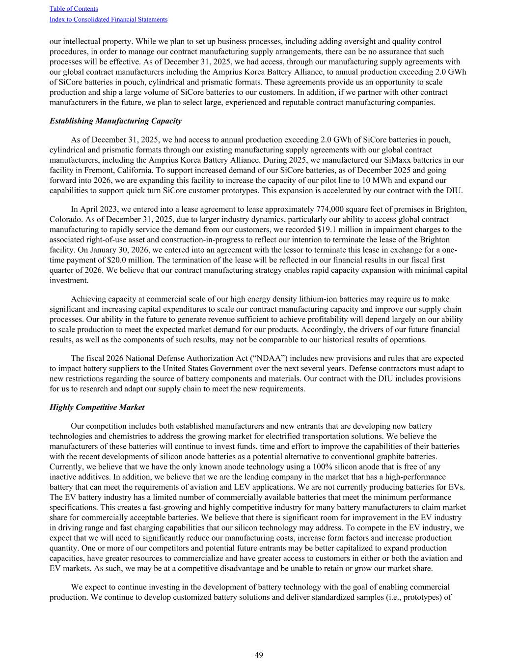 our intellectual property. While we plan to set up business processes, including adding oversight and quality control procedures, in order to manage our contract manufacturing supply arrangements, there can be no assurance that such processes will be effective. As of December 31, 2025, we had access, through our manufacturing supply agreements with our global contract manufacturers including the Amprius Korea Battery Alliance, to annual production exceeding 2.0 GWh of SiCore batteries in pouch, cylindrical and prismatic formats. These agreements provide us an opportunity to scale production and ship a large volume of SiCore batteries to our customers. In addition, if we partner with other contract manufacturers in the future, we plan to select large, experienced and reputable contract manufacturing companies. Establishing Manufacturing Capacity As of December 31, 2025, we had access to annual production exceeding 2.0 GWh of SiCore batteries in pouch, cylindrical and prismatic formats through our existing manufacturing supply agreements with our global contract manufacturers, including the Amprius Korea Battery Alliance. During 2025, we manufactured our SiMaxx batteries in our facility in Fremont, California. To support increased demand of our SiCore batteries, as of December 2025 and going forward into 2026, we are expanding this facility to increase the capacity of our pilot line to 10 MWh and expand our capabilities to support quick turn SiCore customer prototypes. This expansion is accelerated by our contract with the DIU. In April 2023, we entered into a lease agreement to lease approximately 774,000 square feet of premises in Brighton, Colorado. As of December 31, 2025, due to larger industry dynamics, particularly our ability to access global contract manufacturing to rapidly service the demand from our customers, we recorded $19.1 million in impairment charges to the associated right-of-use asset and construction-in-progress to reflect our intention to terminate the lease of the Brighton facility. On January 30, 2026, we entered into an agreement with the lessor to terminate this lease in exchange for a one- time payment of $20.0 million. The termination of the lease will be reflected in our financial results in our fiscal first quarter of 2026. We believe that our contract manufacturing strategy enables rapid capacity expansion with minimal capital investment. Achieving capacity at commercial scale of our high energy density lithium-ion batteries may require us to make significant and increasing capital expenditures to scale our contract manufacturing capacity and improve our supply chain processes. Our ability in the future to generate revenue sufficient to achieve profitability will depend largely on our ability to scale production to meet the expected market demand for our products. Accordingly, the drivers of our future financial results, as well as the components of such results, may not be comparable to our historical results of operations. The fiscal 2026 National Defense Authorization Act (“NDAA”) includes new provisions and rules that are expected to impact battery suppliers to the United States Government over the next several years. Defense contractors must adapt to new restrictions regarding the source of battery components and materials. Our contract with the DIU includes provisions for us to research and adapt our supply chain to meet the new requirements. Highly Competitive Market Our competition includes both established manufacturers and new entrants that are developing new battery technologies and chemistries to address the growing market for electrified transportation solutions. We believe the manufacturers of these batteries will continue to invest funds, time and effort to improve the capabilities of their batteries with the recent developments of silicon anode batteries as a potential alternative to conventional graphite batteries. Currently, we believe that we have the only known anode technology using a 100% silicon anode that is free of any inactive additives. In addition, we believe that we are the leading company in the market that has a high-performance battery that can meet the requirements of aviation and LEV applications. We are not currently producing batteries for EVs. The EV battery industry has a limited number of commercially available batteries that meet the minimum performance specifications. This creates a fast-growing and highly competitive industry for many battery manufacturers to claim market share for commercially acceptable batteries. We believe that there is significant room for improvement in the EV industry in driving range and fast charging capabilities that our silicon technology may address. To compete in the EV industry, we expect that we will need to significantly reduce our manufacturing costs, increase form factors and increase production quantity. One or more of our competitors and potential future entrants may be better capitalized to expand production capacities, have greater resources to commercialize and have greater access to customers in either or both the aviation and EV markets. As such, we may be at a competitive disadvantage and be unable to retain or grow our market share. We expect to continue investing in the development of battery technology with the goal of enabling commercial production. We continue to develop customized battery solutions and deliver standardized samples (i.e., prototypes) of Table of Contents Index to Consolidated Financial Statements 49