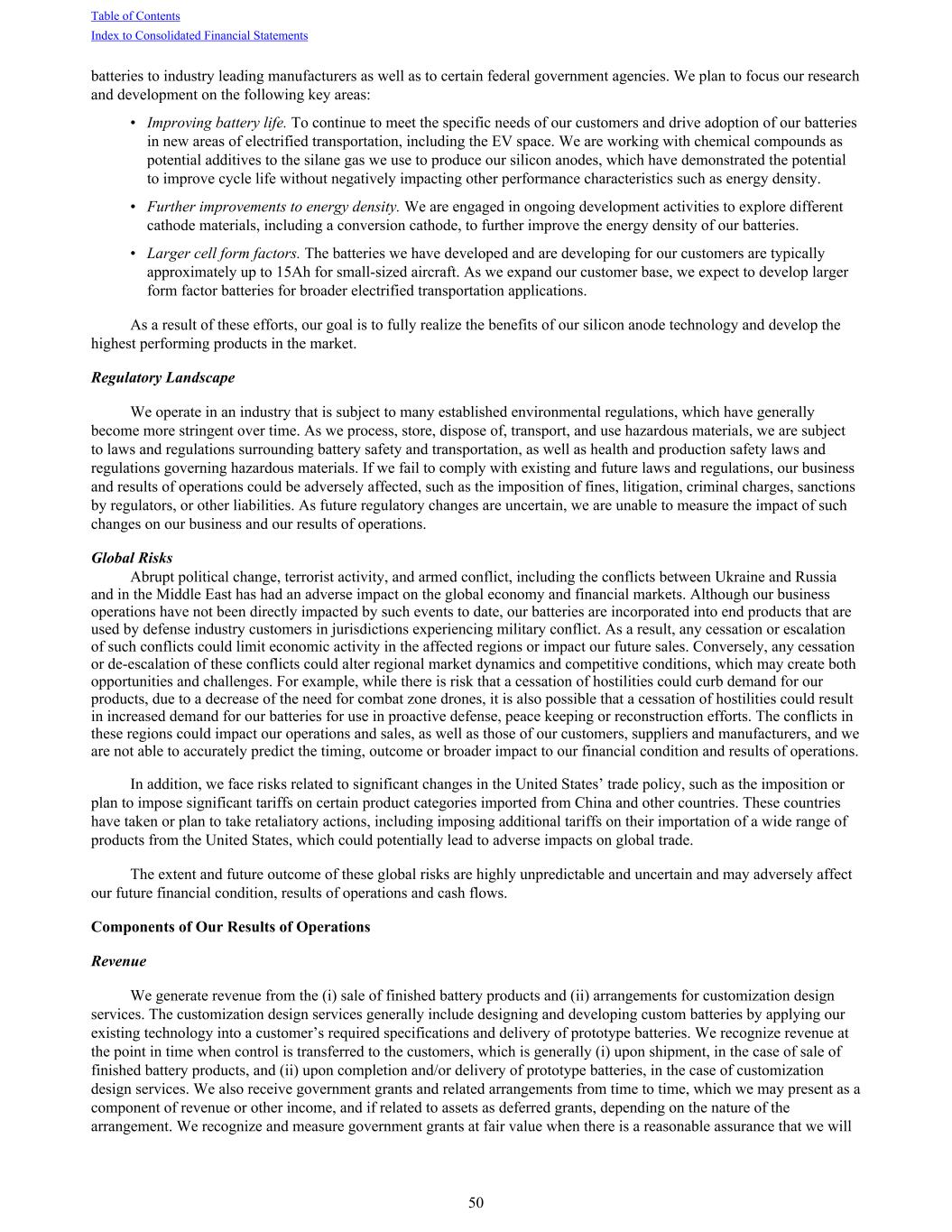 batteries to industry leading manufacturers as well as to certain federal government agencies. We plan to focus our research and development on the following key areas: • Improving battery life. To continue to meet the specific needs of our customers and drive adoption of our batteries in new areas of electrified transportation, including the EV space. We are working with chemical compounds as potential additives to the silane gas we use to produce our silicon anodes, which have demonstrated the potential to improve cycle life without negatively impacting other performance characteristics such as energy density. • Further improvements to energy density. We are engaged in ongoing development activities to explore different cathode materials, including a conversion cathode, to further improve the energy density of our batteries. • Larger cell form factors. The batteries we have developed and are developing for our customers are typically approximately up to 15Ah for small-sized aircraft. As we expand our customer base, we expect to develop larger form factor batteries for broader electrified transportation applications. As a result of these efforts, our goal is to fully realize the benefits of our silicon anode technology and develop the highest performing products in the market. Regulatory Landscape We operate in an industry that is subject to many established environmental regulations, which have generally become more stringent over time. As we process, store, dispose of, transport, and use hazardous materials, we are subject to laws and regulations surrounding battery safety and transportation, as well as health and production safety laws and regulations governing hazardous materials. If we fail to comply with existing and future laws and regulations, our business and results of operations could be adversely affected, such as the imposition of fines, litigation, criminal charges, sanctions by regulators, or other liabilities. As future regulatory changes are uncertain, we are unable to measure the impact of such changes on our business and our results of operations. Global Risks Abrupt political change, terrorist activity, and armed conflict, including the conflicts between Ukraine and Russia and in the Middle East has had an adverse impact on the global economy and financial markets. Although our business operations have not been directly impacted by such events to date, our batteries are incorporated into end products that are used by defense industry customers in jurisdictions experiencing military conflict. As a result, any cessation or escalation of such conflicts could limit economic activity in the affected regions or impact our future sales. Conversely, any cessation or de-escalation of these conflicts could alter regional market dynamics and competitive conditions, which may create both opportunities and challenges. For example, while there is risk that a cessation of hostilities could curb demand for our products, due to a decrease of the need for combat zone drones, it is also possible that a cessation of hostilities could result in increased demand for our batteries for use in proactive defense, peace keeping or reconstruction efforts. The conflicts in these regions could impact our operations and sales, as well as those of our customers, suppliers and manufacturers, and we are not able to accurately predict the timing, outcome or broader impact to our financial condition and results of operations. In addition, we face risks related to significant changes in the United States’ trade policy, such as the imposition or plan to impose significant tariffs on certain product categories imported from China and other countries. These countries have taken or plan to take retaliatory actions, including imposing additional tariffs on their importation of a wide range of products from the United States, which could potentially lead to adverse impacts on global trade. The extent and future outcome of these global risks are highly unpredictable and uncertain and may adversely affect our future financial condition, results of operations and cash flows. Components of Our Results of Operations Revenue We generate revenue from the (i) sale of finished battery products and (ii) arrangements for customization design services. The customization design services generally include designing and developing custom batteries by applying our existing technology into a customer’s required specifications and delivery of prototype batteries. We recognize revenue at the point in time when control is transferred to the customers, which is generally (i) upon shipment, in the case of sale of finished battery products, and (ii) upon completion and/or delivery of prototype batteries, in the case of customization design services. We also receive government grants and related arrangements from time to time, which we may present as a component of revenue or other income, and if related to assets as deferred grants, depending on the nature of the arrangement. We recognize and measure government grants at fair value when there is a reasonable assurance that we will Table of Contents Index to Consolidated Financial Statements 50