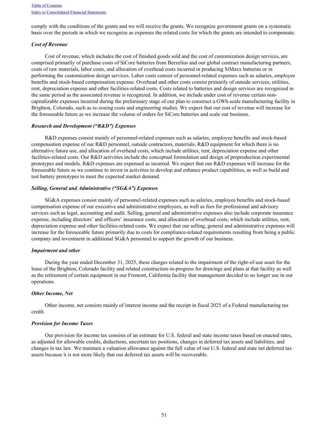 comply with the conditions of the grants and we will receive the grants. We recognize government grants on a systematic basis over the periods in which we recognize as expenses the related costs for which the grants are intended to compensate. Cost of Revenue Cost of revenue, which includes the cost of finished goods sold and the cost of customization design services, are comprised primarily of purchase costs of SiCore batteries from Berzelius and our global contract manufacturing partners, costs of raw materials, labor costs, and allocation of overhead costs incurred in producing SiMaxx batteries or in performing the customization design services. Labor costs consist of personnel-related expenses such as salaries, employee benefits and stock-based compensation expense. Overhead and other costs consist primarily of outside services, utilities, rent, depreciation expense and other facilities-related costs. Costs related to batteries and design services are recognized in the same period as the associated revenue is recognized. In addition, we include under cost of revenue certain non- capitalizable expenses incurred during the preliminary stage of our plan to construct a GWh-scale manufacturing facility in Brighton, Colorado, such as re-zoning costs and engineering studies. We expect that our cost of revenue will increase for the foreseeable future as we increase the volume of orders for SiCore batteries and scale our business. Research and Development (“R&D”) Expenses R&D expenses consist mainly of personnel-related expenses such as salaries, employee benefits and stock-based compensation expense of our R&D personnel, outside contractors, materials, R&D equipment for which there is no alternative future use, and allocation of overhead costs, which include utilities, rent, depreciation expense and other facilities-related costs. Our R&D activities include the conceptual formulation and design of preproduction experimental prototypes and models. R&D expenses are expensed as incurred. We expect that our R&D expenses will increase for the foreseeable future as we continue to invest in activities to develop and enhance product capabilities, as well as build and test battery prototypes to meet the expected market demand. Selling, General and Administrative (“SG&A”) Expenses SG&A expenses consist mainly of personnel-related expenses such as salaries, employee benefits and stock-based compensation expense of our executive and administrative employees, as well as fees for professional and advisory services such as legal, accounting and audit. Selling, general and administrative expenses also include corporate insurance expense, including directors’ and officers’ insurance costs, and allocation of overhead costs, which include utilities, rent, depreciation expense and other facilities-related costs. We expect that our selling, general and administrative expenses will increase for the foreseeable future primarily due to costs for compliance-related requirements resulting from being a public company and investment in additional SG&A personnel to support the growth of our business. Impairment and other During the year ended December 31, 2025, these charges related to the impairment of the right-of-use asset for the lease of the Brighton, Colorado facility and related construction-in-progress for drawings and plans at that facility as well as the retirement of certain equipment in our Fremont, California facility that management decided to no longer use in our operations. Other Income, Net Other income, net consists mainly of interest income and the receipt in fiscal 2025 of a Federal manufacturing tax credit. Provision for Income Taxes Our provision for income tax consists of an estimate for U.S. federal and state income taxes based on enacted rates, as adjusted for allowable credits, deductions, uncertain tax positions, changes in deferred tax assets and liabilities, and changes in tax law. We maintain a valuation allowance against the full value of our U.S. federal and state net deferred tax assets because it is not more likely that our deferred tax assets will be recoverable. Table of Contents Index to Consolidated Financial Statements 51