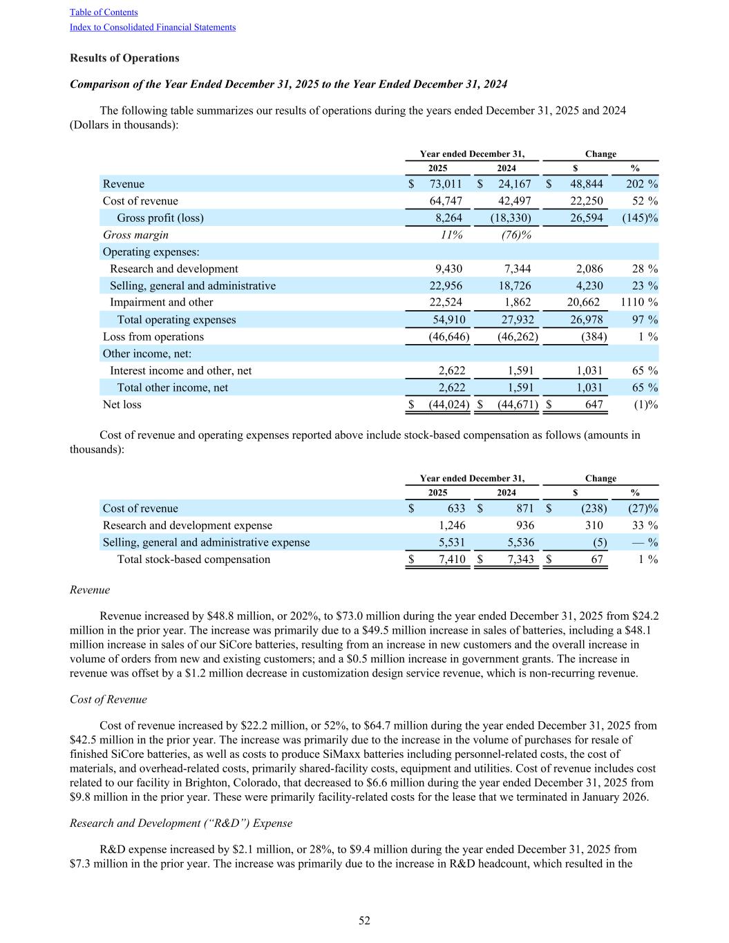Results of Operations Comparison of the Year Ended December 31, 2025 to the Year Ended December 31, 2024 The following table summarizes our results of operations during the years ended December 31, 2025 and 2024 (Dollars in thousands): Year ended December 31, Change 2025 2024 $ % Revenue $ 73,011 $ 24,167 $ 48,844 202 % Cost of revenue 64,747 42,497 22,250 52 % Gross profit (loss) 8,264 (18,330) 26,594 (145) % Gross margin 11 % (76) % Operating expenses: Research and development 9,430 7,344 2,086 28 % Selling, general and administrative 22,956 18,726 4,230 23 % Impairment and other 22,524 1,862 20,662 1110 % Total operating expenses 54,910 27,932 26,978 97 % Loss from operations (46,646) (46,262) (384) 1 % Other income, net: Interest income and other, net 2,622 1,591 1,031 65 % Total other income, net 2,622 1,591 1,031 65 % Net loss $ (44,024) $ (44,671) $ 647 (1) % Cost of revenue and operating expenses reported above include stock-based compensation as follows (amounts in thousands): Year ended December 31, Change 2025 2024 $ % Cost of revenue $ 633 $ 871 $ (238) (27) % Research and development expense 1,246 936 310 33 % Selling, general and administrative expense 5,531 5,536 (5) — % Total stock-based compensation $ 7,410 $ 7,343 $ 67 1 % Revenue Revenue increased by $48.8 million, or 202%, to $73.0 million during the year ended December 31, 2025 from $24.2 million in the prior year. The increase was primarily due to a $49.5 million increase in sales of batteries, including a $48.1 million increase in sales of our SiCore batteries, resulting from an increase in new customers and the overall increase in volume of orders from new and existing customers; and a $0.5 million increase in government grants. The increase in revenue was offset by a $1.2 million decrease in customization design service revenue, which is non-recurring revenue. Cost of Revenue Cost of revenue increased by $22.2 million, or 52%, to $64.7 million during the year ended December 31, 2025 from $42.5 million in the prior year. The increase was primarily due to the increase in the volume of purchases for resale of finished SiCore batteries, as well as costs to produce SiMaxx batteries including personnel-related costs, the cost of materials, and overhead-related costs, primarily shared-facility costs, equipment and utilities. Cost of revenue includes cost related to our facility in Brighton, Colorado, that decreased to $6.6 million during the year ended December 31, 2025 from $9.8 million in the prior year. These were primarily facility-related costs for the lease that we terminated in January 2026. Research and Development (“R&D”) Expense R&D expense increased by $2.1 million, or 28%, to $9.4 million during the year ended December 31, 2025 from $7.3 million in the prior year. The increase was primarily due to the increase in R&D headcount, which resulted in the Table of Contents Index to Consolidated Financial Statements 52