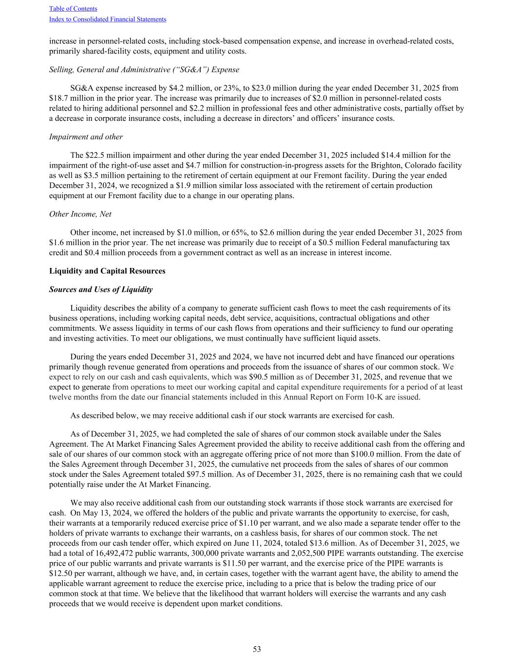 increase in personnel-related costs, including stock-based compensation expense, and increase in overhead-related costs, primarily shared-facility costs, equipment and utility costs. Selling, General and Administrative (“SG&A”) Expense SG&A expense increased by $4.2 million, or 23%, to $23.0 million during the year ended December 31, 2025 from $18.7 million in the prior year. The increase was primarily due to increases of $2.0 million in personnel-related costs related to hiring additional personnel and $2.2 million in professional fees and other administrative costs, partially offset by a decrease in corporate insurance costs, including a decrease in directors’ and officers’ insurance costs. Impairment and other The $22.5 million impairment and other during the year ended December 31, 2025 included $14.4 million for the impairment of the right-of-use asset and $4.7 million for construction-in-progress assets for the Brighton, Colorado facility as well as $3.5 million pertaining to the retirement of certain equipment at our Fremont facility. During the year ended December 31, 2024, we recognized a $1.9 million similar loss associated with the retirement of certain production equipment at our Fremont facility due to a change in our operating plans. Other Income, Net Other income, net increased by $1.0 million, or 65%, to $2.6 million during the year ended December 31, 2025 from $1.6 million in the prior year. The net increase was primarily due to receipt of a $0.5 million Federal manufacturing tax credit and $0.4 million proceeds from a government contract as well as an increase in interest income. Liquidity and Capital Resources Sources and Uses of Liquidity Liquidity describes the ability of a company to generate sufficient cash flows to meet the cash requirements of its business operations, including working capital needs, debt service, acquisitions, contractual obligations and other commitments. We assess liquidity in terms of our cash flows from operations and their sufficiency to fund our operating and investing activities. To meet our obligations, we must continually have sufficient liquid assets. During the years ended December 31, 2025 and 2024, we have not incurred debt and have financed our operations primarily though revenue generated from operations and proceeds from the issuance of shares of our common stock. We expect to rely on our cash and cash equivalents, which was $90.5 million as of December 31, 2025, and revenue that we expect to generate from operations to meet our working capital and capital expenditure requirements for a period of at least twelve months from the date our financial statements included in this Annual Report on Form 10-K are issued. As described below, we may receive additional cash if our stock warrants are exercised for cash. As of December 31, 2025, we had completed the sale of shares of our common stock available under the Sales Agreement. The At Market Financing Sales Agreement provided the ability to receive additional cash from the offering and sale of our shares of our common stock with an aggregate offering price of not more than $100.0 million. From the date of the Sales Agreement through December 31, 2025, the cumulative net proceeds from the sales of shares of our common stock under the Sales Agreement totaled $97.5 million. As of December 31, 2025, there is no remaining cash that we could potentially raise under the At Market Financing. We may also receive additional cash from our outstanding stock warrants if those stock warrants are exercised for cash. On May 13, 2024, we offered the holders of the public and private warrants the opportunity to exercise, for cash, their warrants at a temporarily reduced exercise price of $1.10 per warrant, and we also made a separate tender offer to the holders of private warrants to exchange their warrants, on a cashless basis, for shares of our common stock. The net proceeds from our cash tender offer, which expired on June 11, 2024, totaled $13.6 million. As of December 31, 2025, we had a total of 16,492,472 public warrants, 300,000 private warrants and 2,052,500 PIPE warrants outstanding. The exercise price of our public warrants and private warrants is $11.50 per warrant, and the exercise price of the PIPE warrants is $12.50 per warrant, although we have, and, in certain cases, together with the warrant agent have, the ability to amend the applicable warrant agreement to reduce the exercise price, including to a price that is below the trading price of our common stock at that time. We believe that the likelihood that warrant holders will exercise the warrants and any cash proceeds that we would receive is dependent upon market conditions. Table of Contents Index to Consolidated Financial Statements 53