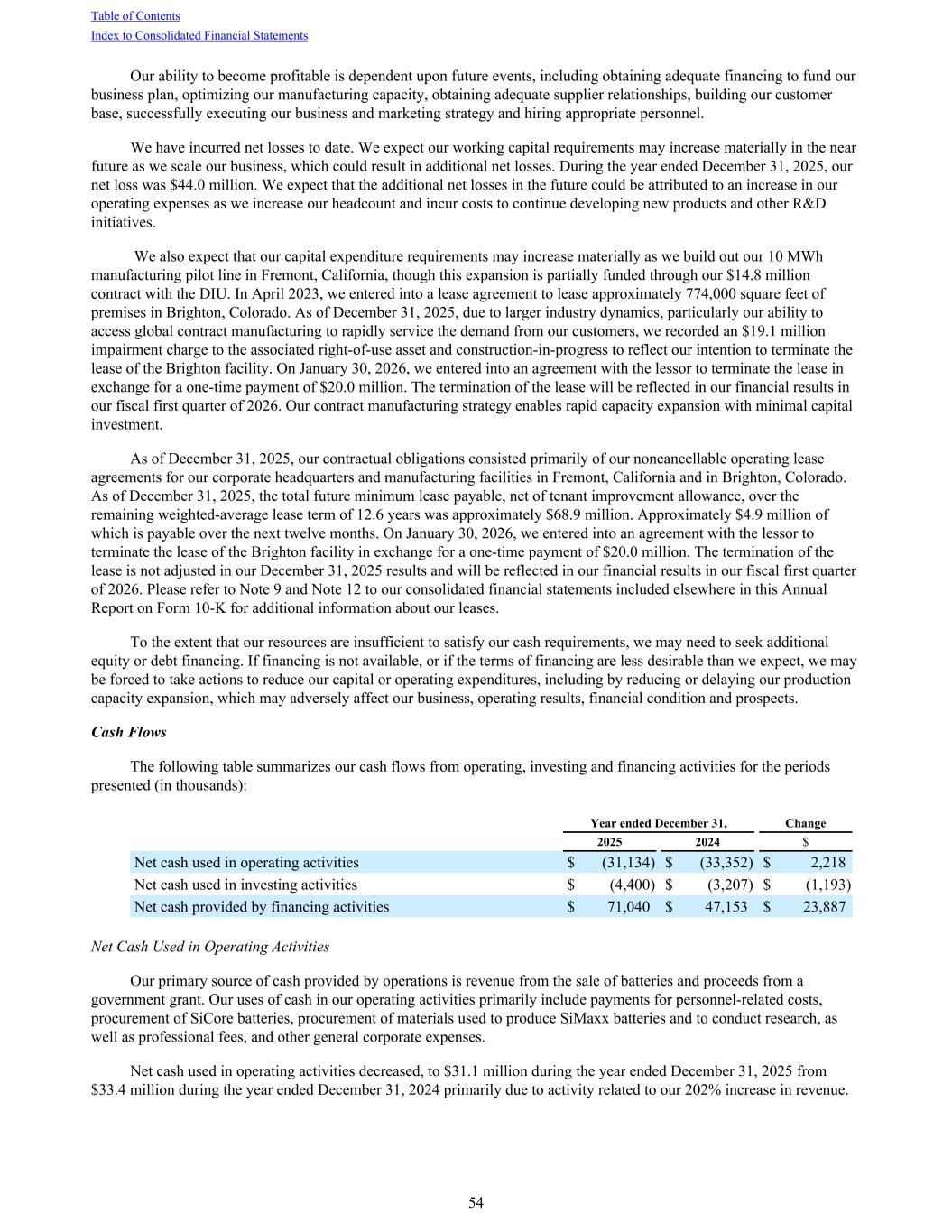 Our ability to become profitable is dependent upon future events, including obtaining adequate financing to fund our business plan, optimizing our manufacturing capacity, obtaining adequate supplier relationships, building our customer base, successfully executing our business and marketing strategy and hiring appropriate personnel. We have incurred net losses to date. We expect our working capital requirements may increase materially in the near future as we scale our business, which could result in additional net losses. During the year ended December 31, 2025, our net loss was $44.0 million. We expect that the additional net losses in the future could be attributed to an increase in our operating expenses as we increase our headcount and incur costs to continue developing new products and other R&D initiatives. We also expect that our capital expenditure requirements may increase materially as we build out our 10 MWh manufacturing pilot line in Fremont, California, though this expansion is partially funded through our $14.8 million contract with the DIU. In April 2023, we entered into a lease agreement to lease approximately 774,000 square feet of premises in Brighton, Colorado. As of December 31, 2025, due to larger industry dynamics, particularly our ability to access global contract manufacturing to rapidly service the demand from our customers, we recorded an $19.1 million impairment charge to the associated right-of-use asset and construction-in-progress to reflect our intention to terminate the lease of the Brighton facility. On January 30, 2026, we entered into an agreement with the lessor to terminate the lease in exchange for a one-time payment of $20.0 million. The termination of the lease will be reflected in our financial results in our fiscal first quarter of 2026. Our contract manufacturing strategy enables rapid capacity expansion with minimal capital investment. As of December 31, 2025, our contractual obligations consisted primarily of our noncancellable operating lease agreements for our corporate headquarters and manufacturing facilities in Fremont, California and in Brighton, Colorado. As of December 31, 2025, the total future minimum lease payable, net of tenant improvement allowance, over the remaining weighted-average lease term of 12.6 years was approximately $68.9 million. Approximately $4.9 million of which is payable over the next twelve months. On January 30, 2026, we entered into an agreement with the lessor to terminate the lease of the Brighton facility in exchange for a one-time payment of $20.0 million. The termination of the lease is not adjusted in our December 31, 2025 results and will be reflected in our financial results in our fiscal first quarter of 2026. Please refer to Note 9 and Note 12 to our consolidated financial statements included elsewhere in this Annual Report on Form 10-K for additional information about our leases. To the extent that our resources are insufficient to satisfy our cash requirements, we may need to seek additional equity or debt financing. If financing is not available, or if the terms of financing are less desirable than we expect, we may be forced to take actions to reduce our capital or operating expenditures, including by reducing or delaying our production capacity expansion, which may adversely affect our business, operating results, financial condition and prospects. Cash Flows The following table summarizes our cash flows from operating, investing and financing activities for the periods presented (in thousands): Year ended December 31, Change 2025 2024 $ Net cash used in operating activities $ (31,134) $ (33,352) $ 2,218 Net cash used in investing activities $ (4,400) $ (3,207) $ (1,193) Net cash provided by financing activities $ 71,040 $ 47,153 $ 23,887 Net Cash Used in Operating Activities Our primary source of cash provided by operations is revenue from the sale of batteries and proceeds from a government grant. Our uses of cash in our operating activities primarily include payments for personnel-related costs, procurement of SiCore batteries, procurement of materials used to produce SiMaxx batteries and to conduct research, as well as professional fees, and other general corporate expenses. Net cash used in operating activities decreased, to $31.1 million during the year ended December 31, 2025 from $33.4 million during the year ended December 31, 2024 primarily due to activity related to our 202% increase in revenue. Table of Contents Index to Consolidated Financial Statements 54