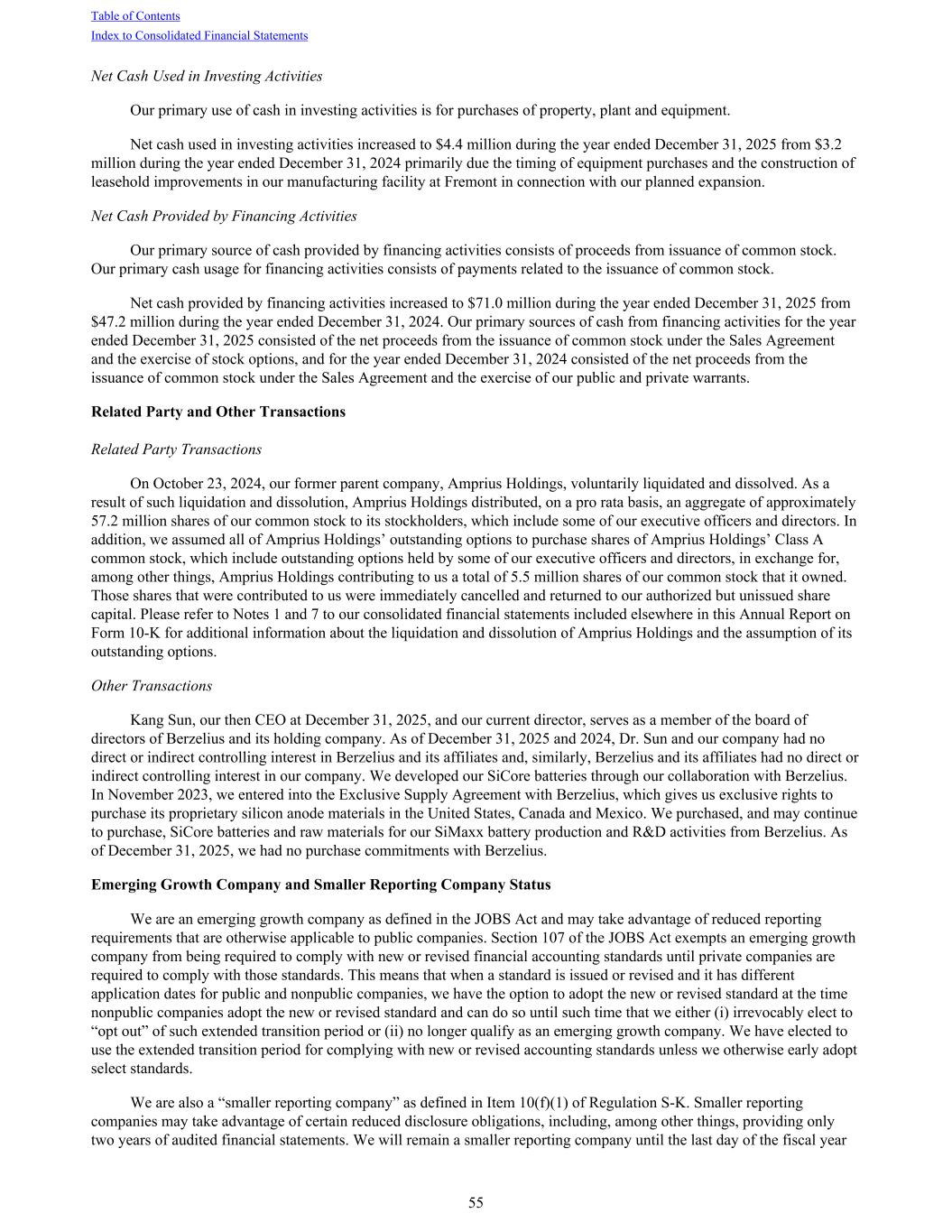 Net Cash Used in Investing Activities Our primary use of cash in investing activities is for purchases of property, plant and equipment. Net cash used in investing activities increased to $4.4 million during the year ended December 31, 2025 from $3.2 million during the year ended December 31, 2024 primarily due the timing of equipment purchases and the construction of leasehold improvements in our manufacturing facility at Fremont in connection with our planned expansion. Net Cash Provided by Financing Activities Our primary source of cash provided by financing activities consists of proceeds from issuance of common stock. Our primary cash usage for financing activities consists of payments related to the issuance of common stock. Net cash provided by financing activities increased to $71.0 million during the year ended December 31, 2025 from $47.2 million during the year ended December 31, 2024. Our primary sources of cash from financing activities for the year ended December 31, 2025 consisted of the net proceeds from the issuance of common stock under the Sales Agreement and the exercise of stock options, and for the year ended December 31, 2024 consisted of the net proceeds from the issuance of common stock under the Sales Agreement and the exercise of our public and private warrants. Related Party and Other Transactions Related Party Transactions On October 23, 2024, our former parent company, Amprius Holdings, voluntarily liquidated and dissolved. As a result of such liquidation and dissolution, Amprius Holdings distributed, on a pro rata basis, an aggregate of approximately 57.2 million shares of our common stock to its stockholders, which include some of our executive officers and directors. In addition, we assumed all of Amprius Holdings’ outstanding options to purchase shares of Amprius Holdings’ Class A common stock, which include outstanding options held by some of our executive officers and directors, in exchange for, among other things, Amprius Holdings contributing to us a total of 5.5 million shares of our common stock that it owned. Those shares that were contributed to us were immediately cancelled and returned to our authorized but unissued share capital. Please refer to Notes 1 and 7 to our consolidated financial statements included elsewhere in this Annual Report on Form 10-K for additional information about the liquidation and dissolution of Amprius Holdings and the assumption of its outstanding options. Other Transactions Kang Sun, our then CEO at December 31, 2025, and our current director, serves as a member of the board of directors of Berzelius and its holding company. As of December 31, 2025 and 2024, Dr. Sun and our company had no direct or indirect controlling interest in Berzelius and its affiliates and, similarly, Berzelius and its affiliates had no direct or indirect controlling interest in our company. We developed our SiCore batteries through our collaboration with Berzelius. In November 2023, we entered into the Exclusive Supply Agreement with Berzelius, which gives us exclusive rights to purchase its proprietary silicon anode materials in the United States, Canada and Mexico. We purchased, and may continue to purchase, SiCore batteries and raw materials for our SiMaxx battery production and R&D activities from Berzelius. As of December 31, 2025, we had no purchase commitments with Berzelius. Emerging Growth Company and Smaller Reporting Company Status We are an emerging growth company as defined in the JOBS Act and may take advantage of reduced reporting requirements that are otherwise applicable to public companies. Section 107 of the JOBS Act exempts an emerging growth company from being required to comply with new or revised financial accounting standards until private companies are required to comply with those standards. This means that when a standard is issued or revised and it has different application dates for public and nonpublic companies, we have the option to adopt the new or revised standard at the time nonpublic companies adopt the new or revised standard and can do so until such time that we either (i) irrevocably elect to “opt out” of such extended transition period or (ii) no longer qualify as an emerging growth company. We have elected to use the extended transition period for complying with new or revised accounting standards unless we otherwise early adopt select standards. We are also a “smaller reporting company” as defined in Item 10(f)(1) of Regulation S-K. Smaller reporting companies may take advantage of certain reduced disclosure obligations, including, among other things, providing only two years of audited financial statements. We will remain a smaller reporting company until the last day of the fiscal year Table of Contents Index to Consolidated Financial Statements 55