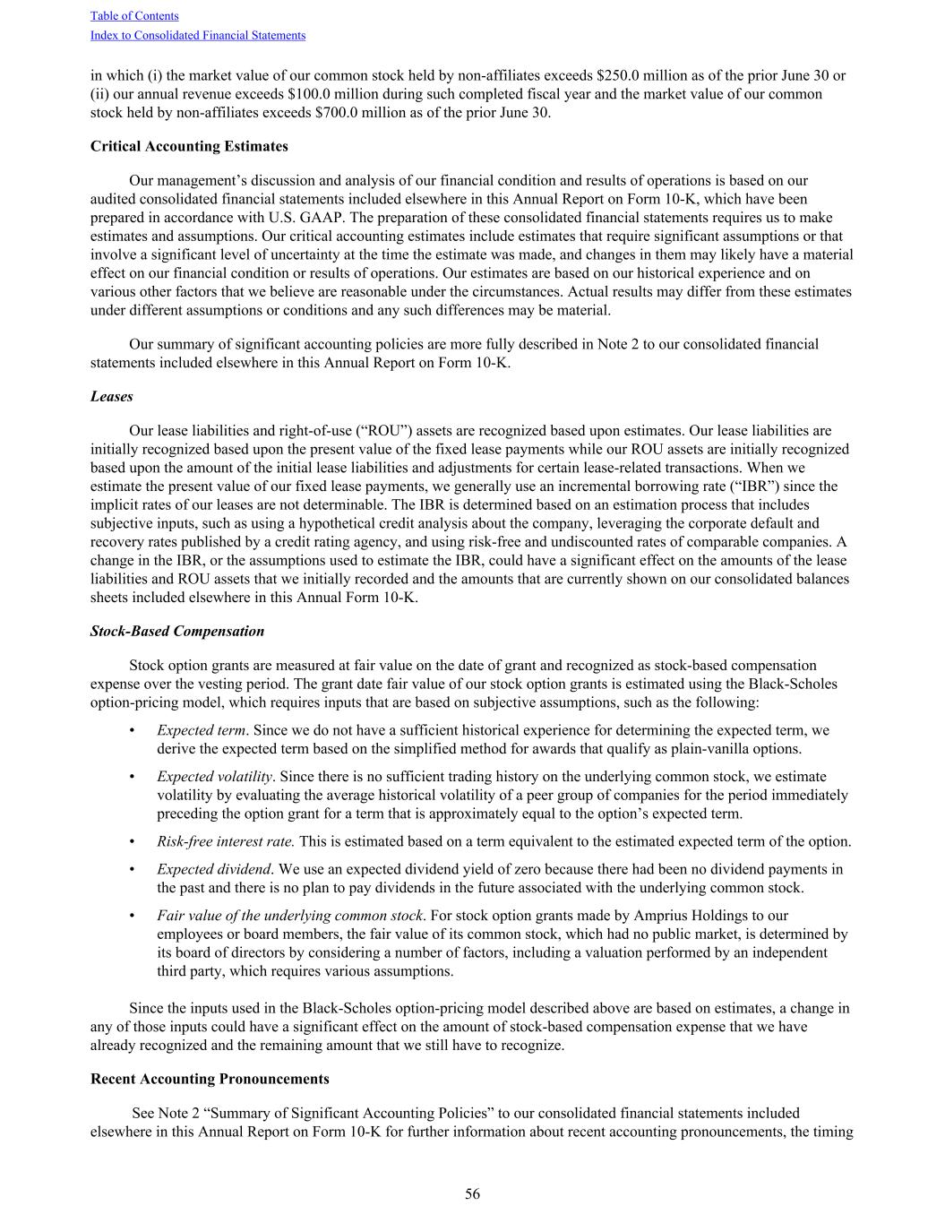 in which (i) the market value of our common stock held by non-affiliates exceeds $250.0 million as of the prior June 30 or (ii) our annual revenue exceeds $100.0 million during such completed fiscal year and the market value of our common stock held by non-affiliates exceeds $700.0 million as of the prior June 30. Critical Accounting Estimates Our management’s discussion and analysis of our financial condition and results of operations is based on our audited consolidated financial statements included elsewhere in this Annual Report on Form 10-K, which have been prepared in accordance with U.S. GAAP. The preparation of these consolidated financial statements requires us to make estimates and assumptions. Our critical accounting estimates include estimates that require significant assumptions or that involve a significant level of uncertainty at the time the estimate was made, and changes in them may likely have a material effect on our financial condition or results of operations. Our estimates are based on our historical experience and on various other factors that we believe are reasonable under the circumstances. Actual results may differ from these estimates under different assumptions or conditions and any such differences may be material. Our summary of significant accounting policies are more fully described in Note 2 to our consolidated financial statements included elsewhere in this Annual Report on Form 10-K. Leases Our lease liabilities and right-of-use (“ROU”) assets are recognized based upon estimates. Our lease liabilities are initially recognized based upon the present value of the fixed lease payments while our ROU assets are initially recognized based upon the amount of the initial lease liabilities and adjustments for certain lease-related transactions. When we estimate the present value of our fixed lease payments, we generally use an incremental borrowing rate (“IBR”) since the implicit rates of our leases are not determinable. The IBR is determined based on an estimation process that includes subjective inputs, such as using a hypothetical credit analysis about the company, leveraging the corporate default and recovery rates published by a credit rating agency, and using risk-free and undiscounted rates of comparable companies. A change in the IBR, or the assumptions used to estimate the IBR, could have a significant effect on the amounts of the lease liabilities and ROU assets that we initially recorded and the amounts that are currently shown on our consolidated balances sheets included elsewhere in this Annual Form 10-K. Stock-Based Compensation Stock option grants are measured at fair value on the date of grant and recognized as stock-based compensation expense over the vesting period. The grant date fair value of our stock option grants is estimated using the Black-Scholes option-pricing model, which requires inputs that are based on subjective assumptions, such as the following: • Expected term. Since we do not have a sufficient historical experience for determining the expected term, we derive the expected term based on the simplified method for awards that qualify as plain-vanilla options. • Expected volatility. Since there is no sufficient trading history on the underlying common stock, we estimate volatility by evaluating the average historical volatility of a peer group of companies for the period immediately preceding the option grant for a term that is approximately equal to the option’s expected term. • Risk-free interest rate. This is estimated based on a term equivalent to the estimated expected term of the option. • Expected dividend. We use an expected dividend yield of zero because there had been no dividend payments in the past and there is no plan to pay dividends in the future associated with the underlying common stock. • Fair value of the underlying common stock. For stock option grants made by Amprius Holdings to our employees or board members, the fair value of its common stock, which had no public market, is determined by its board of directors by considering a number of factors, including a valuation performed by an independent third party, which requires various assumptions. Since the inputs used in the Black-Scholes option-pricing model described above are based on estimates, a change in any of those inputs could have a significant effect on the amount of stock-based compensation expense that we have already recognized and the remaining amount that we still have to recognize. Recent Accounting Pronouncements See Note 2 “Summary of Significant Accounting Policies” to our consolidated financial statements included elsewhere in this Annual Report on Form 10-K for further information about recent accounting pronouncements, the timing Table of Contents Index to Consolidated Financial Statements 56