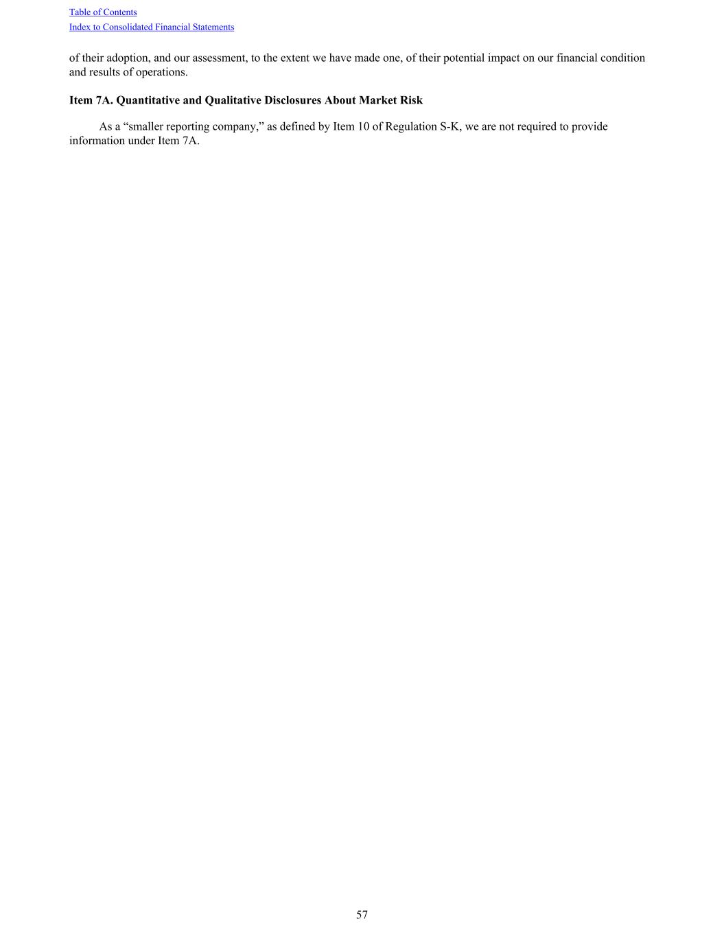 of their adoption, and our assessment, to the extent we have made one, of their potential impact on our financial condition and results of operations. Item 7A. Quantitative and Qualitative Disclosures About Market Risk As a “smaller reporting company,” as defined by Item 10 of Regulation S-K, we are not required to provide information under Item 7A. Table of Contents Index to Consolidated Financial Statements 57