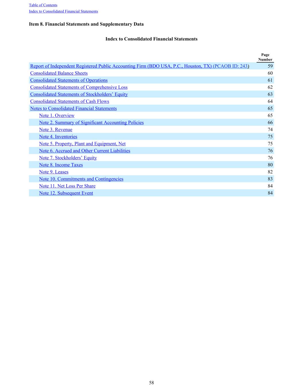 Item 8. Financial Statements and Supplementary Data Index to Consolidated Financial Statements Page Number Report of Independent Registered Public Accounting Firm (BDO USA, P.C., Houston, TX) (PCAOB ID: 243) 59 Consolidated Balance Sheets 60 Consolidated Statements of Operations 61 Consolidated Statements of Comprehensive Loss 62 Consolidated Statements of Stockholders’ Equity 63 Consolidated Statements of Cash Flows 64 Notes to Consolidated Financial Statements 65 Note 1. Overview 65 Note 2. Summary of Significant Accounting Policies 66 Note 3. Revenue 74 Note 4. Inventories 75 Note 5. Property, Plant and Equipment, Net 75 Note 6. Accrued and Other Current Liabilities 76 Note 7. Stockholders’ Equity 76 Note 8. Income Taxes 80 Note 9. Leases 82 Note 10. Commitments and Contingencies 83 Note 11. Net Loss Per Share 84 Note 12. Subsequent Event 84 Table of Contents Index to Consolidated Financial Statements 58