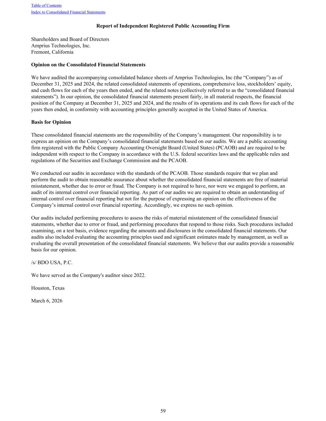 Report of Independent Registered Public Accounting Firm Shareholders and Board of Directors Amprius Technologies, Inc. Fremont, California Opinion on the Consolidated Financial Statements We have audited the accompanying consolidated balance sheets of Amprius Technologies, Inc (the “Company”) as of December 31, 2025 and 2024, the related consolidated statements of operations, comprehensive loss, stockholders’ equity, and cash flows for each of the years then ended, and the related notes (collectively referred to as the “consolidated financial statements”). In our opinion, the consolidated financial statements present fairly, in all material respects, the financial position of the Company at December 31, 2025 and 2024, and the results of its operations and its cash flows for each of the years then ended, in conformity with accounting principles generally accepted in the United States of America. Basis for Opinion These consolidated financial statements are the responsibility of the Company’s management. Our responsibility is to express an opinion on the Company’s consolidated financial statements based on our audits. We are a public accounting firm registered with the Public Company Accounting Oversight Board (United States) (PCAOB) and are required to be independent with respect to the Company in accordance with the U.S. federal securities laws and the applicable rules and regulations of the Securities and Exchange Commission and the PCAOB. We conducted our audits in accordance with the standards of the PCAOB. Those standards require that we plan and perform the audit to obtain reasonable assurance about whether the consolidated financial statements are free of material misstatement, whether due to error or fraud. The Company is not required to have, nor were we engaged to perform, an audit of its internal control over financial reporting. As part of our audits we are required to obtain an understanding of internal control over financial reporting but not for the purpose of expressing an opinion on the effectiveness of the Company’s internal control over financial reporting. Accordingly, we express no such opinion. Our audits included performing procedures to assess the risks of material misstatement of the consolidated financial statements, whether due to error or fraud, and performing procedures that respond to those risks. Such procedures included examining, on a test basis, evidence regarding the amounts and disclosures in the consolidated financial statements. Our audits also included evaluating the accounting principles used and significant estimates made by management, as well as evaluating the overall presentation of the consolidated financial statements. We believe that our audits provide a reasonable basis for our opinion. /s/ BDO USA, P.C. We have served as the Company's auditor since 2022. Houston, Texas March 6, 2026 Table of Contents Index to Consolidated Financial Statements 59