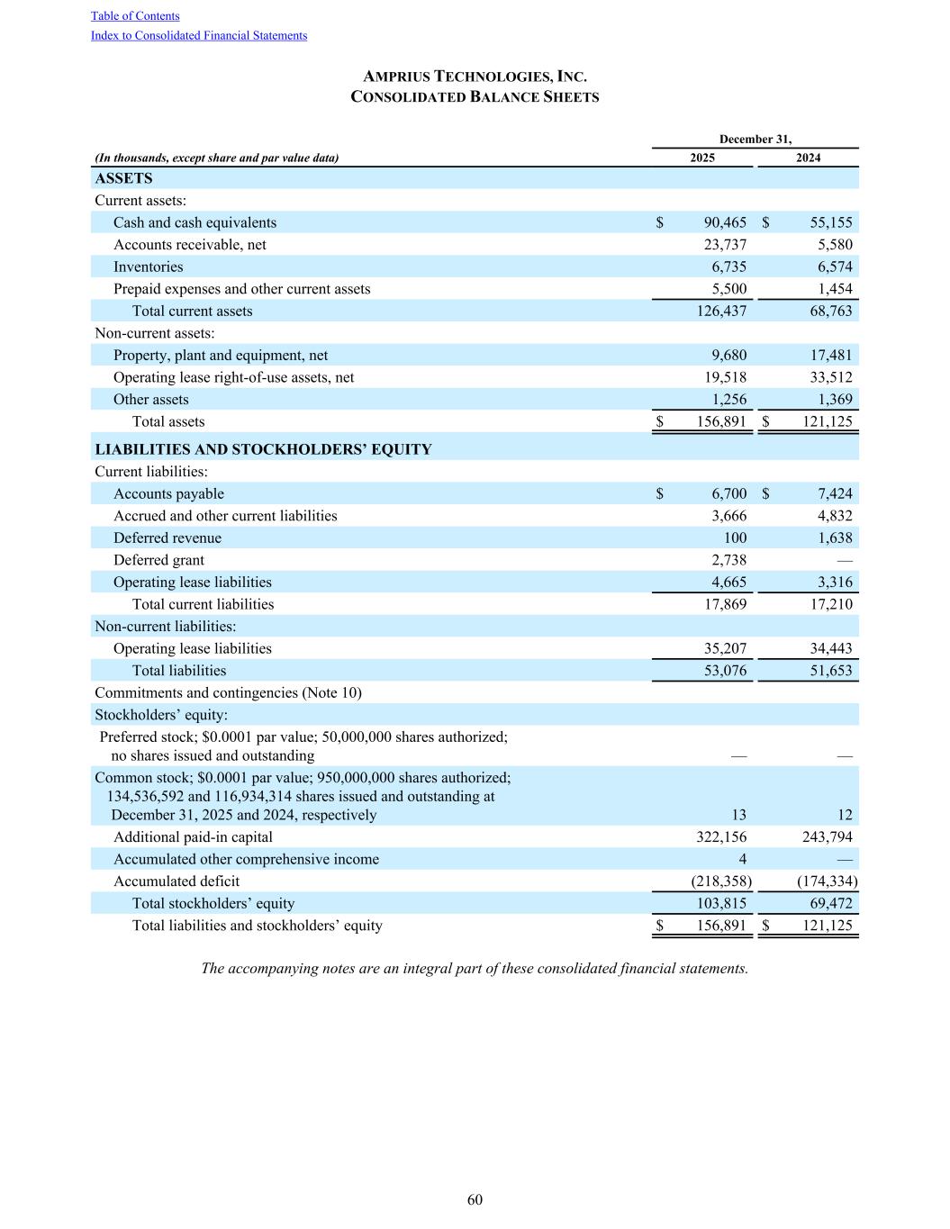 AMPRIUS TECHNOLOGIES, INC. CONSOLIDATED BALANCE SHEETS December 31, (In thousands, except share and par value data) 2025 2024 ASSETS Current assets: Cash and cash equivalents $ 90,465 $ 55,155 Accounts receivable, net 23,737 5,580 Inventories 6,735 6,574 Prepaid expenses and other current assets 5,500 1,454 Total current assets 126,437 68,763 Non-current assets: Property, plant and equipment, net 9,680 17,481 Operating lease right-of-use assets, net 19,518 33,512 Other assets 1,256 1,369 Total assets $ 156,891 $ 121,125 LIABILITIES AND STOCKHOLDERS’ EQUITY Current liabilities: Accounts payable $ 6,700 $ 7,424 Accrued and other current liabilities 3,666 4,832 Deferred revenue 100 1,638 Deferred grant 2,738 — Operating lease liabilities 4,665 3,316 Total current liabilities 17,869 17,210 Non-current liabilities: Operating lease liabilities 35,207 34,443 Total liabilities 53,076 51,653 Commitments and contingencies (Note 10) Stockholders’ equity: Preferred stock; $0.0001 par value; 50,000,000 shares authorized; no shares issued and outstanding — — Common stock; $0.0001 par value; 950,000,000 shares authorized; 134,536,592 and 116,934,314 shares issued and outstanding at December 31, 2025 and 2024, respectively 13 12 Additional paid-in capital 322,156 243,794 Accumulated other comprehensive income 4 — Accumulated deficit (218,358) (174,334) Total stockholders’ equity 103,815 69,472 Total liabilities and stockholders’ equity $ 156,891 $ 121,125 The accompanying notes are an integral part of these consolidated financial statements. Table of Contents Index to Consolidated Financial Statements 60
