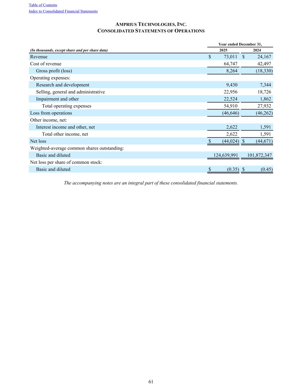 AMPRIUS TECHNOLOGIES, INC. CONSOLIDATED STATEMENTS OF OPERATIONS Year ended December 31, (In thousands, except share and per share data) 2025 2024 Revenue $ 73,011 $ 24,167 Cost of revenue 64,747 42,497 Gross profit (loss) 8,264 (18,330) Operating expenses: Research and development 9,430 7,344 Selling, general and administrative 22,956 18,726 Impairment and other 22,524 1,862 Total operating expenses 54,910 27,932 Loss from operations (46,646) (46,262) Other income, net: Interest income and other, net 2,622 1,591 Total other income, net 2,622 1,591 Net loss $ (44,024) $ (44,671) Weighted-average common shares outstanding: Basic and diluted 124,639,991 101,872,347 Net loss per share of common stock: Basic and diluted $ (0.35) $ (0.45) The accompanying notes are an integral part of these consolidated financial statements. Table of Contents Index to Consolidated Financial Statements 61