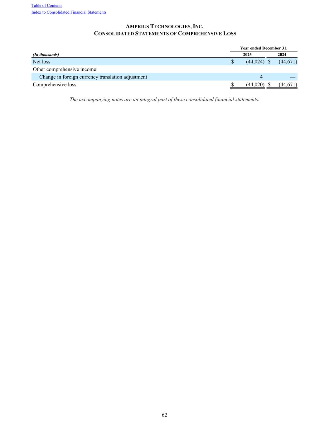 AMPRIUS TECHNOLOGIES, INC. CONSOLIDATED STATEMENTS OF COMPREHENSIVE LOSS Year ended December 31, (In thousands) 2025 2024 Net loss $ (44,024) $ (44,671) Other comprehensive income: Change in foreign currency translation adjustment 4 — Comprehensive loss $ (44,020) $ (44,671) The accompanying notes are an integral part of these consolidated financial statements. Table of Contents Index to Consolidated Financial Statements 62