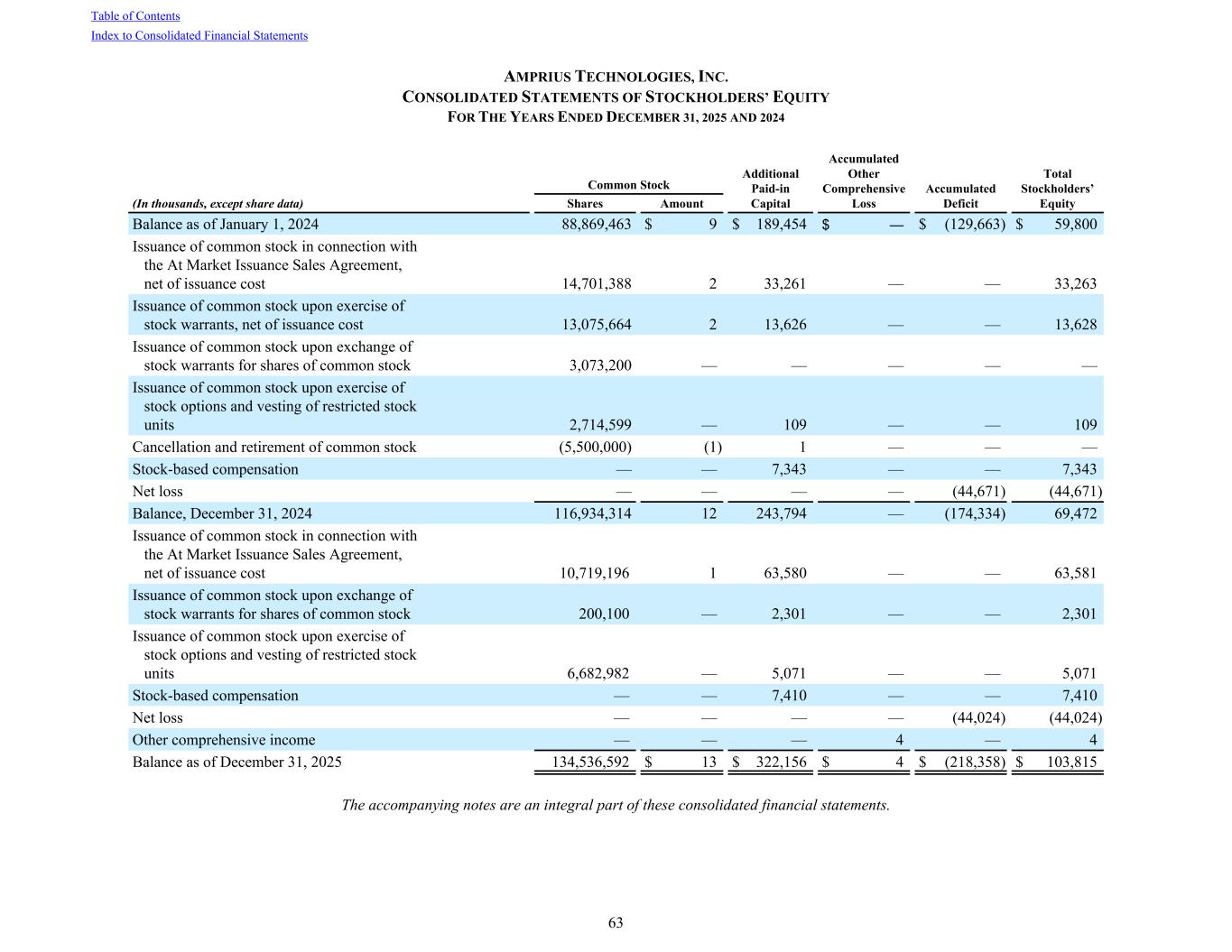 AMPRIUS TECHNOLOGIES, INC. CONSOLIDATED STATEMENTS OF STOCKHOLDERS’ EQUITY FOR THE YEARS ENDED DECEMBER 31, 2025 AND 2024 Common Stock Additional Paid-in Capital Accumulated Other Comprehensive Loss Accumulated Deficit Total Stockholders’ Equity(In thousands, except share data) Shares Amount Balance as of January 1, 2024 88,869,463 $ 9 $ 189,454 $ — $ (129,663) $ 59,800 Issuance of common stock in connection with the At Market Issuance Sales Agreement, net of issuance cost 14,701,388 2 33,261 — — 33,263 Issuance of common stock upon exercise of stock warrants, net of issuance cost 13,075,664 2 13,626 — — 13,628 Issuance of common stock upon exchange of stock warrants for shares of common stock 3,073,200 — — — — — Issuance of common stock upon exercise of stock options and vesting of restricted stock units 2,714,599 — 109 — — 109 Cancellation and retirement of common stock (5,500,000) (1) 1 — — — Stock-based compensation — — 7,343 — — 7,343 Net loss — — — — (44,671) (44,671) Balance, December 31, 2024 116,934,314 12 243,794 — (174,334) 69,472 Issuance of common stock in connection with the At Market Issuance Sales Agreement, net of issuance cost 10,719,196 1 63,580 — — 63,581 Issuance of common stock upon exchange of stock warrants for shares of common stock 200,100 — 2,301 — — 2,301 Issuance of common stock upon exercise of stock options and vesting of restricted stock units 6,682,982 — 5,071 — — 5,071 Stock-based compensation — — 7,410 — — 7,410 Net loss — — — — (44,024) (44,024) Other comprehensive income — — — 4 — 4 Balance as of December 31, 2025 134,536,592 $ 13 $ 322,156 $ 4 $ (218,358) $ 103,815 The accompanying notes are an integral part of these consolidated financial statements. Table of Contents Index to Consolidated Financial Statements 63