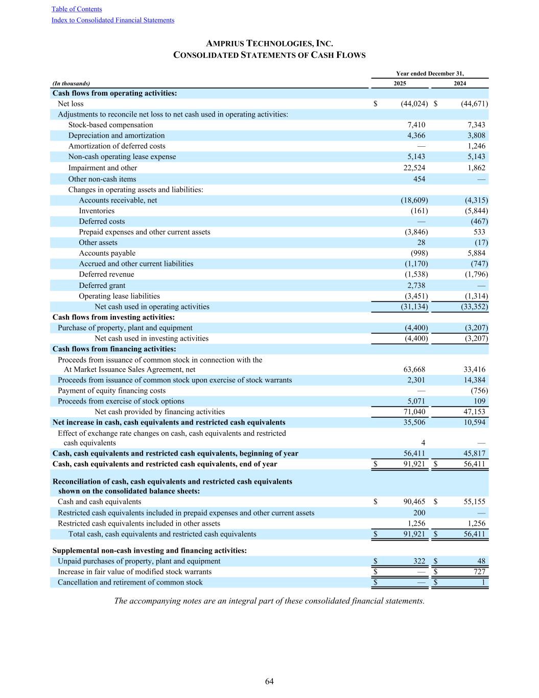 AMPRIUS TECHNOLOGIES, INC. CONSOLIDATED STATEMENTS OF CASH FLOWS Year ended December 31, (In thousands) 2025 2024 Cash flows from operating activities: Net loss $ (44,024) $ (44,671) Adjustments to reconcile net loss to net cash used in operating activities: Stock-based compensation 7,410 7,343 Depreciation and amortization 4,366 3,808 Amortization of deferred costs — 1,246 Non-cash operating lease expense 5,143 5,143 Impairment and other 22,524 1,862 Other non-cash items 454 — Changes in operating assets and liabilities: Accounts receivable, net (18,609) (4,315) Inventories (161) (5,844) Deferred costs — (467) Prepaid expenses and other current assets (3,846) 533 Other assets 28 (17) Accounts payable (998) 5,884 Accrued and other current liabilities (1,170) (747) Deferred revenue (1,538) (1,796) Deferred grant 2,738 — Operating lease liabilities (3,451) (1,314) Net cash used in operating activities (31,134) (33,352) Cash flows from investing activities: Purchase of property, plant and equipment (4,400) (3,207) Net cash used in investing activities (4,400) (3,207) Cash flows from financing activities: Proceeds from issuance of common stock in connection with the At Market Issuance Sales Agreement, net 63,668 33,416 Proceeds from issuance of common stock upon exercise of stock warrants 2,301 14,384 Payment of equity financing costs — (756) Proceeds from exercise of stock options 5,071 109 Net cash provided by financing activities 71,040 47,153 Net increase in cash, cash equivalents and restricted cash equivalents 35,506 10,594 Effect of exchange rate changes on cash, cash equivalents and restricted cash equivalents 4 — Cash, cash equivalents and restricted cash equivalents, beginning of year 56,411 45,817 Cash, cash equivalents and restricted cash equivalents, end of year $ 91,921 $ 56,411 Reconciliation of cash, cash equivalents and restricted cash equivalents shown on the consolidated balance sheets: Cash and cash equivalents $ 90,465 $ 55,155 Restricted cash equivalents included in prepaid expenses and other current assets 200 — Restricted cash equivalents included in other assets 1,256 1,256 Total cash, cash equivalents and restricted cash equivalents $ 91,921 $ 56,411 Supplemental non-cash investing and financing activities: Unpaid purchases of property, plant and equipment $ 322 $ 48 Increase in fair value of modified stock warrants $ — $ 727 Cancellation and retirement of common stock $ — $ 1 The accompanying notes are an integral part of these consolidated financial statements. Table of Contents Index to Consolidated Financial Statements 64