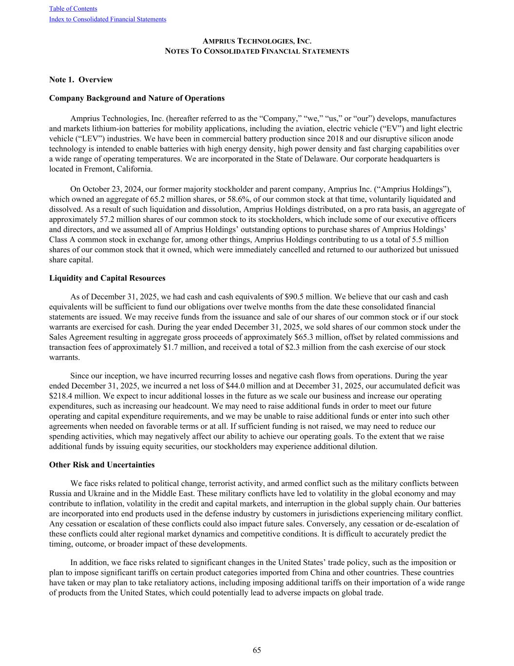 AMPRIUS TECHNOLOGIES, INC. NOTES TO CONSOLIDATED FINANCIAL STATEMENTS Note 1. Overview Company Background and Nature of Operations Amprius Technologies, Inc. (hereafter referred to as the “Company,” “we,” “us,” or “our”) develops, manufactures and markets lithium-ion batteries for mobility applications, including the aviation, electric vehicle (“EV”) and light electric vehicle (“LEV”) industries. We have been in commercial battery production since 2018 and our disruptive silicon anode technology is intended to enable batteries with high energy density, high power density and fast charging capabilities over a wide range of operating temperatures. We are incorporated in the State of Delaware. Our corporate headquarters is located in Fremont, California. On October 23, 2024, our former majority stockholder and parent company, Amprius Inc. (“Amprius Holdings”), which owned an aggregate of 65.2 million shares, or 58.6%, of our common stock at that time, voluntarily liquidated and dissolved. As a result of such liquidation and dissolution, Amprius Holdings distributed, on a pro rata basis, an aggregate of approximately 57.2 million shares of our common stock to its stockholders, which include some of our executive officers and directors, and we assumed all of Amprius Holdings’ outstanding options to purchase shares of Amprius Holdings’ Class A common stock in exchange for, among other things, Amprius Holdings contributing to us a total of 5.5 million shares of our common stock that it owned, which were immediately cancelled and returned to our authorized but unissued share capital. Liquidity and Capital Resources As of December 31, 2025, we had cash and cash equivalents of $90.5 million. We believe that our cash and cash equivalents will be sufficient to fund our obligations over twelve months from the date these consolidated financial statements are issued. We may receive funds from the issuance and sale of our shares of our common stock or if our stock warrants are exercised for cash. During the year ended December 31, 2025, we sold shares of our common stock under the Sales Agreement resulting in aggregate gross proceeds of approximately $65.3 million, offset by related commissions and transaction fees of approximately $1.7 million, and received a total of $2.3 million from the cash exercise of our stock warrants. Since our inception, we have incurred recurring losses and negative cash flows from operations. During the year ended December 31, 2025, we incurred a net loss of $44.0 million and at December 31, 2025, our accumulated deficit was $218.4 million. We expect to incur additional losses in the future as we scale our business and increase our operating expenditures, such as increasing our headcount. We may need to raise additional funds in order to meet our future operating and capital expenditure requirements, and we may be unable to raise additional funds or enter into such other agreements when needed on favorable terms or at all. If sufficient funding is not raised, we may need to reduce our spending activities, which may negatively affect our ability to achieve our operating goals. To the extent that we raise additional funds by issuing equity securities, our stockholders may experience additional dilution. Other Risk and Uncertainties We face risks related to political change, terrorist activity, and armed conflict such as the military conflicts between Russia and Ukraine and in the Middle East. These military conflicts have led to volatility in the global economy and may contribute to inflation, volatility in the credit and capital markets, and interruption in the global supply chain. Our batteries are incorporated into end products used in the defense industry by customers in jurisdictions experiencing military conflict. Any cessation or escalation of these conflicts could also impact future sales. Conversely, any cessation or de-escalation of these conflicts could alter regional market dynamics and competitive conditions. It is difficult to accurately predict the timing, outcome, or broader impact of these developments. In addition, we face risks related to significant changes in the United States’ trade policy, such as the imposition or plan to impose significant tariffs on certain product categories imported from China and other countries. These countries have taken or may plan to take retaliatory actions, including imposing additional tariffs on their importation of a wide range of products from the United States, which could potentially lead to adverse impacts on global trade. Table of Contents Index to Consolidated Financial Statements 65
