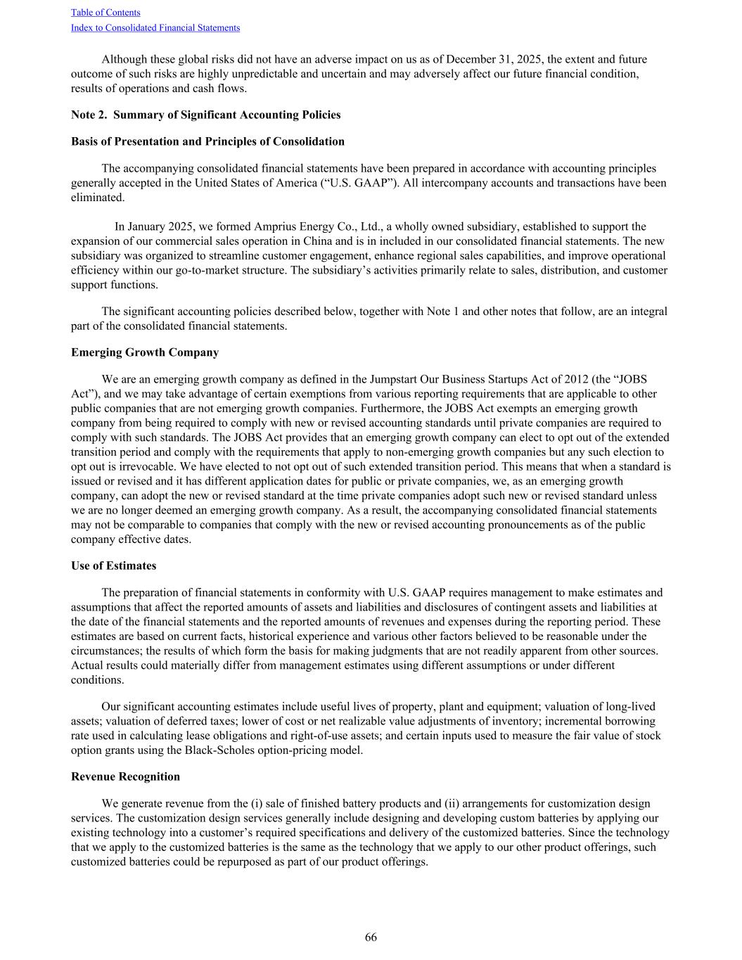 Although these global risks did not have an adverse impact on us as of December 31, 2025, the extent and future outcome of such risks are highly unpredictable and uncertain and may adversely affect our future financial condition, results of operations and cash flows. Note 2. Summary of Significant Accounting Policies Basis of Presentation and Principles of Consolidation The accompanying consolidated financial statements have been prepared in accordance with accounting principles generally accepted in the United States of America (“U.S. GAAP”). All intercompany accounts and transactions have been eliminated. In January 2025, we formed Amprius Energy Co., Ltd., a wholly owned subsidiary, established to support the expansion of our commercial sales operation in China and is in included in our consolidated financial statements. The new subsidiary was organized to streamline customer engagement, enhance regional sales capabilities, and improve operational efficiency within our go-to-market structure. The subsidiary’s activities primarily relate to sales, distribution, and customer support functions. The significant accounting policies described below, together with Note 1 and other notes that follow, are an integral part of the consolidated financial statements. Emerging Growth Company We are an emerging growth company as defined in the Jumpstart Our Business Startups Act of 2012 (the “JOBS Act”), and we may take advantage of certain exemptions from various reporting requirements that are applicable to other public companies that are not emerging growth companies. Furthermore, the JOBS Act exempts an emerging growth company from being required to comply with new or revised accounting standards until private companies are required to comply with such standards. The JOBS Act provides that an emerging growth company can elect to opt out of the extended transition period and comply with the requirements that apply to non-emerging growth companies but any such election to opt out is irrevocable. We have elected to not opt out of such extended transition period. This means that when a standard is issued or revised and it has different application dates for public or private companies, we, as an emerging growth company, can adopt the new or revised standard at the time private companies adopt such new or revised standard unless we are no longer deemed an emerging growth company. As a result, the accompanying consolidated financial statements may not be comparable to companies that comply with the new or revised accounting pronouncements as of the public company effective dates. Use of Estimates The preparation of financial statements in conformity with U.S. GAAP requires management to make estimates and assumptions that affect the reported amounts of assets and liabilities and disclosures of contingent assets and liabilities at the date of the financial statements and the reported amounts of revenues and expenses during the reporting period. These estimates are based on current facts, historical experience and various other factors believed to be reasonable under the circumstances; the results of which form the basis for making judgments that are not readily apparent from other sources. Actual results could materially differ from management estimates using different assumptions or under different conditions. Our significant accounting estimates include useful lives of property, plant and equipment; valuation of long-lived assets; valuation of deferred taxes; lower of cost or net realizable value adjustments of inventory; incremental borrowing rate used in calculating lease obligations and right-of-use assets; and certain inputs used to measure the fair value of stock option grants using the Black-Scholes option-pricing model. Revenue Recognition We generate revenue from the (i) sale of finished battery products and (ii) arrangements for customization design services. The customization design services generally include designing and developing custom batteries by applying our existing technology into a customer’s required specifications and delivery of the customized batteries. Since the technology that we apply to the customized batteries is the same as the technology that we apply to our other product offerings, such customized batteries could be repurposed as part of our product offerings. Table of Contents Index to Consolidated Financial Statements 66