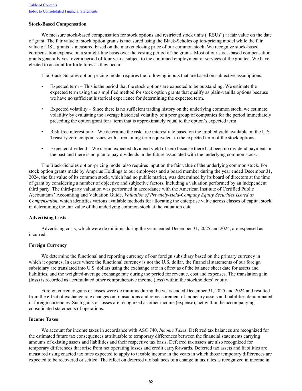 Stock-Based Compensation We measure stock-based compensation for stock options and restricted stock units (“RSUs”) at fair value on the date of grant. The fair value of stock option grants is measured using the Black-Scholes option-pricing model while the fair value of RSU grants is measured based on the market closing price of our common stock. We recognize stock-based compensation expense on a straight-line basis over the vesting period of the grants. Most of our stock-based compensation grants generally vest over a period of four years, subject to the continued employment or services of the grantee. We have elected to account for forfeitures as they occur. The Black-Scholes option-pricing model requires the following inputs that are based on subjective assumptions: • Expected term – This is the period that the stock options are expected to be outstanding. We estimate the expected term using the simplified method for stock option grants that qualify as plain-vanilla options because we have no sufficient historical experience for determining the expected term. • Expected volatility – Since there is no sufficient trading history on the underlying common stock, we estimate volatility by evaluating the average historical volatility of a peer group of companies for the period immediately preceding the option grant for a term that is approximately equal to the option’s expected term. • Risk-free interest rate – We determine the risk-free interest rate based on the implied yield available on the U.S. Treasury zero coupon issues with a remaining term equivalent to the expected term of the stock options. • Expected dividend – We use an expected dividend yield of zero because there had been no dividend payments in the past and there is no plan to pay dividends in the future associated with the underlying common stock. The Black-Scholes option-pricing model also requires input on the fair value of the underlying common stock. For stock option grants made by Amprius Holdings to our employees and a board member during the year ended December 31, 2024, the fair value of its common stock, which had no public market, was determined by its board of directors at the time of grant by considering a number of objective and subjective factors, including a valuation performed by an independent third party. The third-party valuation was performed in accordance with the American Institute of Certified Public Accountants’ Accounting and Valuation Guide, Valuation of Privately-Held-Company Equity Securities Issued as Compensation, which identifies various available methods for allocating the enterprise value across classes of capital stock in determining the fair value of the underlying common stock at the valuation date. Advertising Costs Advertising costs, which were de minimis during the years ended December 31, 2025 and 2024, are expensed as incurred. Foreign Currency We determine the functional and reporting currency of our foreign subsidiary based on the primary currency in which it operates. In cases where the functional currency is not the U.S. dollar, the financial statements of our foreign subsidiary are translated into U.S. dollars using the exchange rate in effect as of the balance sheet date for assets and liabilities, and the weighted-average exchange rate during the period for revenue, cost and expenses. The translation gain (loss) is recorded as accumulated other comprehensive income (loss) within the stockholders’ equity. Foreign currency gains or losses were de minimis during the years ended December 31, 2025 and 2024 and resulted from the effect of exchange rate changes on transactions and remeasurement of monetary assets and liabilities denominated in foreign currencies. Such gains or losses are recognized as other income (expense), net within the accompanying consolidated statements of operations. Income Taxes We account for income taxes in accordance with ASC 740, Income Taxes. Deferred tax balances are recognized for the estimated future tax consequences attributable to temporary differences between the financial statements carrying amounts of existing assets and liabilities and their respective tax basis. Deferred tax assets are also recognized for temporary differences that arise from net operating losses and credit carryforwards. Deferred tax assets and liabilities are measured using enacted tax rates expected to apply to taxable income in the years in which those temporary differences are expected to be recovered or settled. The effect on deferred tax balances of a change in tax rates is recognized in income in Table of Contents Index to Consolidated Financial Statements 68
