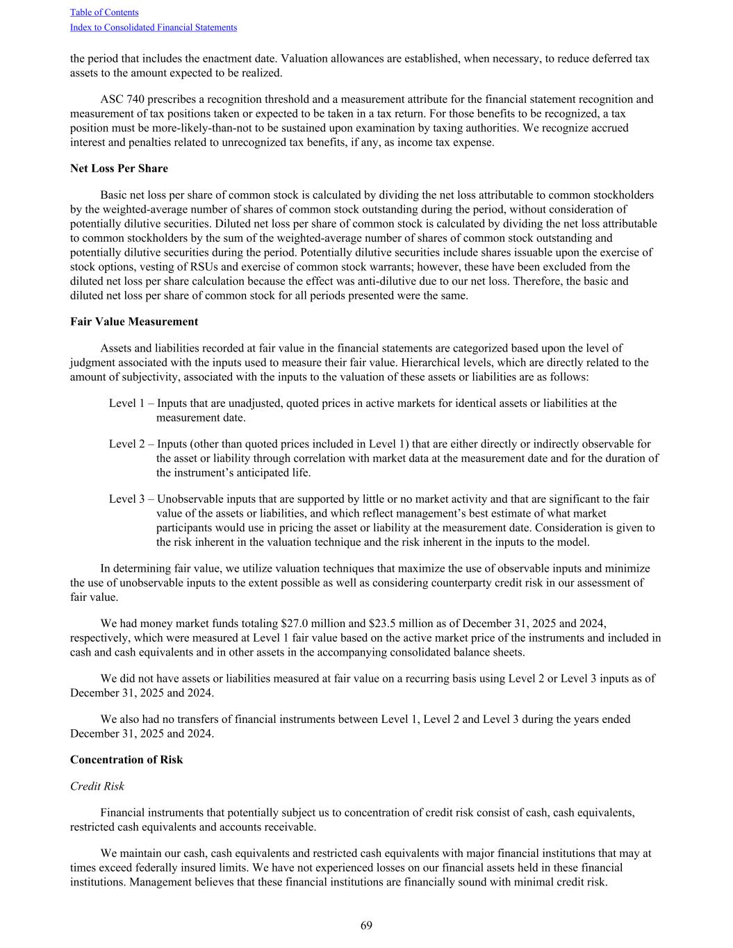 the period that includes the enactment date. Valuation allowances are established, when necessary, to reduce deferred tax assets to the amount expected to be realized. ASC 740 prescribes a recognition threshold and a measurement attribute for the financial statement recognition and measurement of tax positions taken or expected to be taken in a tax return. For those benefits to be recognized, a tax position must be more-likely-than-not to be sustained upon examination by taxing authorities. We recognize accrued interest and penalties related to unrecognized tax benefits, if any, as income tax expense. Net Loss Per Share Basic net loss per share of common stock is calculated by dividing the net loss attributable to common stockholders by the weighted-average number of shares of common stock outstanding during the period, without consideration of potentially dilutive securities. Diluted net loss per share of common stock is calculated by dividing the net loss attributable to common stockholders by the sum of the weighted-average number of shares of common stock outstanding and potentially dilutive securities during the period. Potentially dilutive securities include shares issuable upon the exercise of stock options, vesting of RSUs and exercise of common stock warrants; however, these have been excluded from the diluted net loss per share calculation because the effect was anti-dilutive due to our net loss. Therefore, the basic and diluted net loss per share of common stock for all periods presented were the same. Fair Value Measurement Assets and liabilities recorded at fair value in the financial statements are categorized based upon the level of judgment associated with the inputs used to measure their fair value. Hierarchical levels, which are directly related to the amount of subjectivity, associated with the inputs to the valuation of these assets or liabilities are as follows: Level 1 – Inputs that are unadjusted, quoted prices in active markets for identical assets or liabilities at the measurement date. Level 2 – Inputs (other than quoted prices included in Level 1) that are either directly or indirectly observable for the asset or liability through correlation with market data at the measurement date and for the duration of the instrument’s anticipated life. Level 3 – Unobservable inputs that are supported by little or no market activity and that are significant to the fair value of the assets or liabilities, and which reflect management’s best estimate of what market participants would use in pricing the asset or liability at the measurement date. Consideration is given to the risk inherent in the valuation technique and the risk inherent in the inputs to the model. In determining fair value, we utilize valuation techniques that maximize the use of observable inputs and minimize the use of unobservable inputs to the extent possible as well as considering counterparty credit risk in our assessment of fair value. We had money market funds totaling $27.0 million and $23.5 million as of December 31, 2025 and 2024, respectively, which were measured at Level 1 fair value based on the active market price of the instruments and included in cash and cash equivalents and in other assets in the accompanying consolidated balance sheets. We did not have assets or liabilities measured at fair value on a recurring basis using Level 2 or Level 3 inputs as of December 31, 2025 and 2024. We also had no transfers of financial instruments between Level 1, Level 2 and Level 3 during the years ended December 31, 2025 and 2024. Concentration of Risk Credit Risk Financial instruments that potentially subject us to concentration of credit risk consist of cash, cash equivalents, restricted cash equivalents and accounts receivable. We maintain our cash, cash equivalents and restricted cash equivalents with major financial institutions that may at times exceed federally insured limits. We have not experienced losses on our financial assets held in these financial institutions. Management believes that these financial institutions are financially sound with minimal credit risk. Table of Contents Index to Consolidated Financial Statements 69