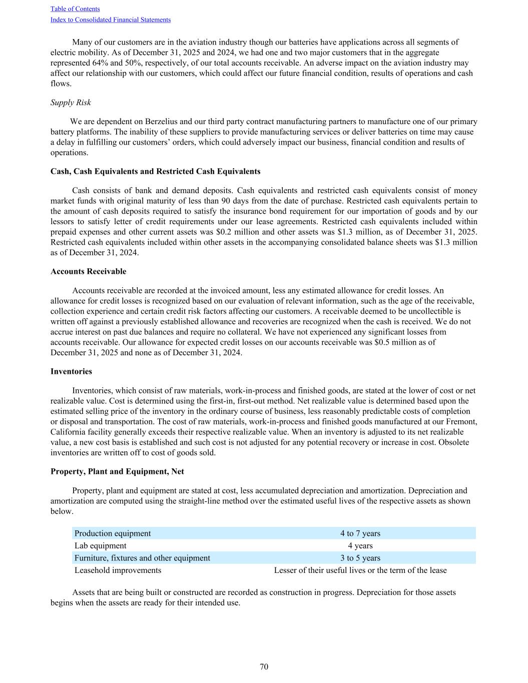 Many of our customers are in the aviation industry though our batteries have applications across all segments of electric mobility. As of December 31, 2025 and 2024, we had one and two major customers that in the aggregate represented 64% and 50%, respectively, of our total accounts receivable. An adverse impact on the aviation industry may affect our relationship with our customers, which could affect our future financial condition, results of operations and cash flows. Supply Risk We are dependent on Berzelius and our third party contract manufacturing partners to manufacture one of our primary battery platforms. The inability of these suppliers to provide manufacturing services or deliver batteries on time may cause a delay in fulfilling our customers’ orders, which could adversely impact our business, financial condition and results of operations. Cash, Cash Equivalents and Restricted Cash Equivalents Cash consists of bank and demand deposits. Cash equivalents and restricted cash equivalents consist of money market funds with original maturity of less than 90 days from the date of purchase. Restricted cash equivalents pertain to the amount of cash deposits required to satisfy the insurance bond requirement for our importation of goods and by our lessors to satisfy letter of credit requirements under our lease agreements. Restricted cash equivalents included within prepaid expenses and other current assets was $0.2 million and other assets was $1.3 million, as of December 31, 2025. Restricted cash equivalents included within other assets in the accompanying consolidated balance sheets was $1.3 million as of December 31, 2024. Accounts Receivable Accounts receivable are recorded at the invoiced amount, less any estimated allowance for credit losses. An allowance for credit losses is recognized based on our evaluation of relevant information, such as the age of the receivable, collection experience and certain credit risk factors affecting our customers. A receivable deemed to be uncollectible is written off against a previously established allowance and recoveries are recognized when the cash is received. We do not accrue interest on past due balances and require no collateral. We have not experienced any significant losses from accounts receivable. Our allowance for expected credit losses on our accounts receivable was $0.5 million as of December 31, 2025 and none as of December 31, 2024. Inventories Inventories, which consist of raw materials, work-in-process and finished goods, are stated at the lower of cost or net realizable value. Cost is determined using the first-in, first-out method. Net realizable value is determined based upon the estimated selling price of the inventory in the ordinary course of business, less reasonably predictable costs of completion or disposal and transportation. The cost of raw materials, work-in-process and finished goods manufactured at our Fremont, California facility generally exceeds their respective realizable value. When an inventory is adjusted to its net realizable value, a new cost basis is established and such cost is not adjusted for any potential recovery or increase in cost. Obsolete inventories are written off to cost of goods sold. Property, Plant and Equipment, Net Property, plant and equipment are stated at cost, less accumulated depreciation and amortization. Depreciation and amortization are computed using the straight-line method over the estimated useful lives of the respective assets as shown below. Production equipment 4 to 7 years Lab equipment 4 years Furniture, fixtures and other equipment 3 to 5 years Leasehold improvements Lesser of their useful lives or the term of the lease Assets that are being built or constructed are recorded as construction in progress. Depreciation for those assets begins when the assets are ready for their intended use. Table of Contents Index to Consolidated Financial Statements 70