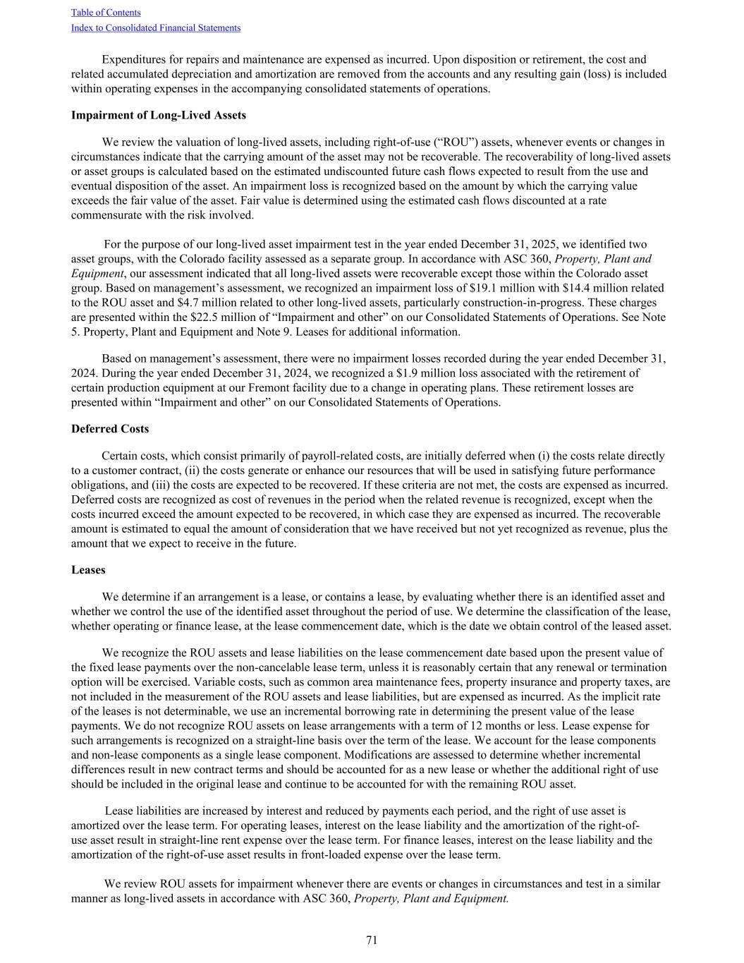 Expenditures for repairs and maintenance are expensed as incurred. Upon disposition or retirement, the cost and related accumulated depreciation and amortization are removed from the accounts and any resulting gain (loss) is included within operating expenses in the accompanying consolidated statements of operations. Impairment of Long-Lived Assets We review the valuation of long-lived assets, including right-of-use (“ROU”) assets, whenever events or changes in circumstances indicate that the carrying amount of the asset may not be recoverable. The recoverability of long-lived assets or asset groups is calculated based on the estimated undiscounted future cash flows expected to result from the use and eventual disposition of the asset. An impairment loss is recognized based on the amount by which the carrying value exceeds the fair value of the asset. Fair value is determined using the estimated cash flows discounted at a rate commensurate with the risk involved. For the purpose of our long-lived asset impairment test in the year ended December 31, 2025, we identified two asset groups, with the Colorado facility assessed as a separate group. In accordance with ASC 360, Property, Plant and Equipment, our assessment indicated that all long-lived assets were recoverable except those within the Colorado asset group. Based on management’s assessment, we recognized an impairment loss of $19.1 million with $14.4 million related to the ROU asset and $4.7 million related to other long-lived assets, particularly construction-in-progress. These charges are presented within the $22.5 million of “Impairment and other” on our Consolidated Statements of Operations. See Note 5. Property, Plant and Equipment and Note 9. Leases for additional information. Based on management’s assessment, there were no impairment losses recorded during the year ended December 31, 2024. During the year ended December 31, 2024, we recognized a $1.9 million loss associated with the retirement of certain production equipment at our Fremont facility due to a change in operating plans. These retirement losses are presented within “Impairment and other” on our Consolidated Statements of Operations. Deferred Costs Certain costs, which consist primarily of payroll-related costs, are initially deferred when (i) the costs relate directly to a customer contract, (ii) the costs generate or enhance our resources that will be used in satisfying future performance obligations, and (iii) the costs are expected to be recovered. If these criteria are not met, the costs are expensed as incurred. Deferred costs are recognized as cost of revenues in the period when the related revenue is recognized, except when the costs incurred exceed the amount expected to be recovered, in which case they are expensed as incurred. The recoverable amount is estimated to equal the amount of consideration that we have received but not yet recognized as revenue, plus the amount that we expect to receive in the future. Leases We determine if an arrangement is a lease, or contains a lease, by evaluating whether there is an identified asset and whether we control the use of the identified asset throughout the period of use. We determine the classification of the lease, whether operating or finance lease, at the lease commencement date, which is the date we obtain control of the leased asset. We recognize the ROU assets and lease liabilities on the lease commencement date based upon the present value of the fixed lease payments over the non-cancelable lease term, unless it is reasonably certain that any renewal or termination option will be exercised. Variable costs, such as common area maintenance fees, property insurance and property taxes, are not included in the measurement of the ROU assets and lease liabilities, but are expensed as incurred. As the implicit rate of the leases is not determinable, we use an incremental borrowing rate in determining the present value of the lease payments. We do not recognize ROU assets on lease arrangements with a term of 12 months or less. Lease expense for such arrangements is recognized on a straight-line basis over the term of the lease. We account for the lease components and non-lease components as a single lease component. Modifications are assessed to determine whether incremental differences result in new contract terms and should be accounted for as a new lease or whether the additional right of use should be included in the original lease and continue to be accounted for with the remaining ROU asset. Lease liabilities are increased by interest and reduced by payments each period, and the right of use asset is amortized over the lease term. For operating leases, interest on the lease liability and the amortization of the right-of- use asset result in straight-line rent expense over the lease term. For finance leases, interest on the lease liability and the amortization of the right-of-use asset results in front-loaded expense over the lease term. We review ROU assets for impairment whenever there are events or changes in circumstances and test in a similar manner as long-lived assets in accordance with ASC 360, Property, Plant and Equipment. Table of Contents Index to Consolidated Financial Statements 71