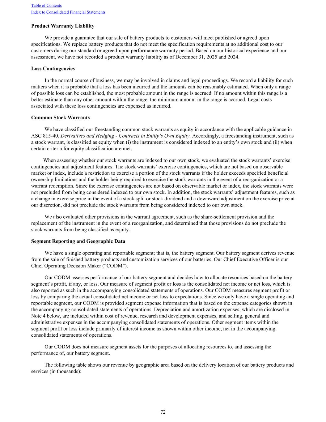 Product Warranty Liability We provide a guarantee that our sale of battery products to customers will meet published or agreed upon specifications. We replace battery products that do not meet the specification requirements at no additional cost to our customers during our standard or agreed-upon performance warranty period. Based on our historical experience and our assessment, we have not recorded a product warranty liability as of December 31, 2025 and 2024. Loss Contingencies In the normal course of business, we may be involved in claims and legal proceedings. We record a liability for such matters when it is probable that a loss has been incurred and the amounts can be reasonably estimated. When only a range of possible loss can be established, the most probable amount in the range is accrued. If no amount within this range is a better estimate than any other amount within the range, the minimum amount in the range is accrued. Legal costs associated with these loss contingencies are expensed as incurred. Common Stock Warrants We have classified our freestanding common stock warrants as equity in accordance with the applicable guidance in ASC 815-40, Derivatives and Hedging - Contracts in Entity’s Own Equity. Accordingly, a freestanding instrument, such as a stock warrant, is classified as equity when (i) the instrument is considered indexed to an entity’s own stock and (ii) when certain criteria for equity classification are met. When assessing whether our stock warrants are indexed to our own stock, we evaluated the stock warrants’ exercise contingencies and adjustment features. The stock warrants’ exercise contingencies, which are not based on observable market or index, include a restriction to exercise a portion of the stock warrants if the holder exceeds specified beneficial ownership limitations and the holder being required to exercise the stock warrants in the event of a reorganization or a warrant redemption. Since the exercise contingencies are not based on observable market or index, the stock warrants were not precluded from being considered indexed to our own stock. In addition, the stock warrants’ adjustment features, such as a change in exercise price in the event of a stock split or stock dividend and a downward adjustment on the exercise price at our discretion, did not preclude the stock warrants from being considered indexed to our own stock. We also evaluated other provisions in the warrant agreement, such as the share-settlement provision and the replacement of the instrument in the event of a reorganization, and determined that those provisions do not preclude the stock warrants from being classified as equity. Segment Reporting and Geographic Data We have a single operating and reportable segment; that is, the battery segment. Our battery segment derives revenue from the sale of finished battery products and customization services of our batteries. Our Chief Executive Officer is our Chief Operating Decision Maker (“CODM”). Our CODM assesses performance of our battery segment and decides how to allocate resources based on the battery segment’s profit, if any, or loss. Our measure of segment profit or loss is the consolidated net income or net loss, which is also reported as such in the accompanying consolidated statements of operations. Our CODM measures segment profit or loss by comparing the actual consolidated net income or net loss to expectations. Since we only have a single operating and reportable segment, our CODM is provided segment expense information that is based on the expense categories shown in the accompanying consolidated statements of operations. Depreciation and amortization expenses, which are disclosed in Note 4 below, are included within cost of revenue, research and development expenses, and selling, general and administrative expenses in the accompanying consolidated statements of operations. Other segment items within the segment profit or loss include primarily of interest income as shown within other income, net in the accompanying consolidated statements of operations. Our CODM does not measure segment assets for the purposes of allocating resources to, and assessing the performance of, our battery segment. The following table shows our revenue by geographic area based on the delivery location of our battery products and services (in thousands): Table of Contents Index to Consolidated Financial Statements 72