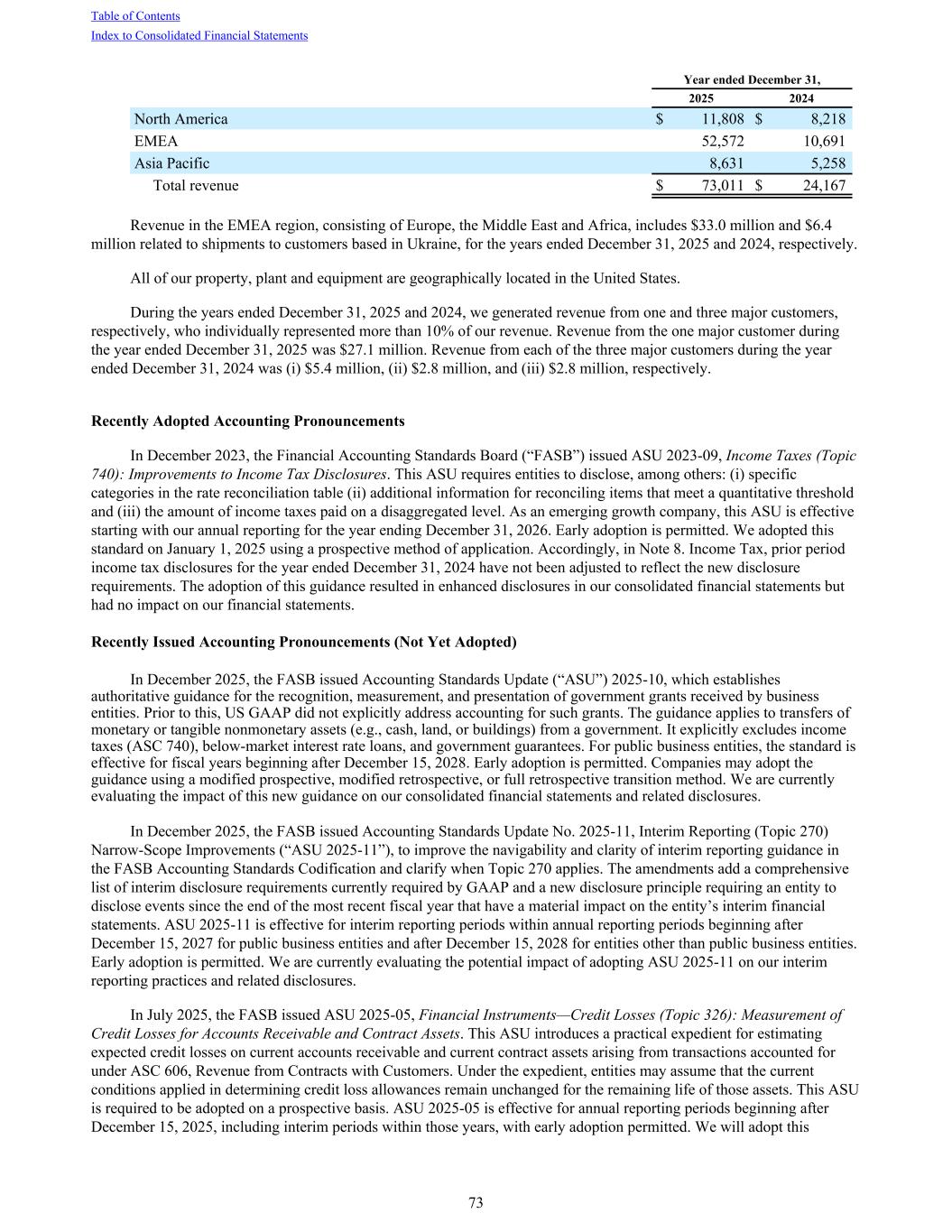 Year ended December 31, 2025 2024 North America $ 11,808 $ 8,218 EMEA 52,572 10,691 Asia Pacific 8,631 5,258 Total revenue $ 73,011 $ 24,167 Revenue in the EMEA region, consisting of Europe, the Middle East and Africa, includes $33.0 million and $6.4 million related to shipments to customers based in Ukraine, for the years ended December 31, 2025 and 2024, respectively. All of our property, plant and equipment are geographically located in the United States. During the years ended December 31, 2025 and 2024, we generated revenue from one and three major customers, respectively, who individually represented more than 10% of our revenue. Revenue from the one major customer during the year ended December 31, 2025 was $27.1 million. Revenue from each of the three major customers during the year ended December 31, 2024 was (i) $5.4 million, (ii) $2.8 million, and (iii) $2.8 million, respectively. Recently Adopted Accounting Pronouncements In December 2023, the Financial Accounting Standards Board (“FASB”) issued ASU 2023-09, Income Taxes (Topic 740): Improvements to Income Tax Disclosures. This ASU requires entities to disclose, among others: (i) specific categories in the rate reconciliation table (ii) additional information for reconciling items that meet a quantitative threshold and (iii) the amount of income taxes paid on a disaggregated level. As an emerging growth company, this ASU is effective starting with our annual reporting for the year ending December 31, 2026. Early adoption is permitted. We adopted this standard on January 1, 2025 using a prospective method of application. Accordingly, in Note 8. Income Tax, prior period income tax disclosures for the year ended December 31, 2024 have not been adjusted to reflect the new disclosure requirements. The adoption of this guidance resulted in enhanced disclosures in our consolidated financial statements but had no impact on our financial statements. Recently Issued Accounting Pronouncements (Not Yet Adopted) In December 2025, the FASB issued Accounting Standards Update (“ASU”) 2025-10, which establishes authoritative guidance for the recognition, measurement, and presentation of government grants received by business entities. Prior to this, US GAAP did not explicitly address accounting for such grants. The guidance applies to transfers of monetary or tangible nonmonetary assets (e.g., cash, land, or buildings) from a government. It explicitly excludes income taxes (ASC 740), below-market interest rate loans, and government guarantees. For public business entities, the standard is effective for fiscal years beginning after December 15, 2028. Early adoption is permitted. Companies may adopt the guidance using a modified prospective, modified retrospective, or full retrospective transition method. We are currently evaluating the impact of this new guidance on our consolidated financial statements and related disclosures. In December 2025, the FASB issued Accounting Standards Update No. 2025-11, Interim Reporting (Topic 270) Narrow-Scope Improvements (“ASU 2025-11”), to improve the navigability and clarity of interim reporting guidance in the FASB Accounting Standards Codification and clarify when Topic 270 applies. The amendments add a comprehensive list of interim disclosure requirements currently required by GAAP and a new disclosure principle requiring an entity to disclose events since the end of the most recent fiscal year that have a material impact on the entity’s interim financial statements. ASU 2025-11 is effective for interim reporting periods within annual reporting periods beginning after December 15, 2027 for public business entities and after December 15, 2028 for entities other than public business entities. Early adoption is permitted. We are currently evaluating the potential impact of adopting ASU 2025-11 on our interim reporting practices and related disclosures. In July 2025, the FASB issued ASU 2025-05, Financial Instruments—Credit Losses (Topic 326): Measurement of Credit Losses for Accounts Receivable and Contract Assets. This ASU introduces a practical expedient for estimating expected credit losses on current accounts receivable and current contract assets arising from transactions accounted for under ASC 606, Revenue from Contracts with Customers. Under the expedient, entities may assume that the current conditions applied in determining credit loss allowances remain unchanged for the remaining life of those assets. This ASU is required to be adopted on a prospective basis. ASU 2025-05 is effective for annual reporting periods beginning after December 15, 2025, including interim periods within those years, with early adoption permitted. We will adopt this Table of Contents Index to Consolidated Financial Statements 73