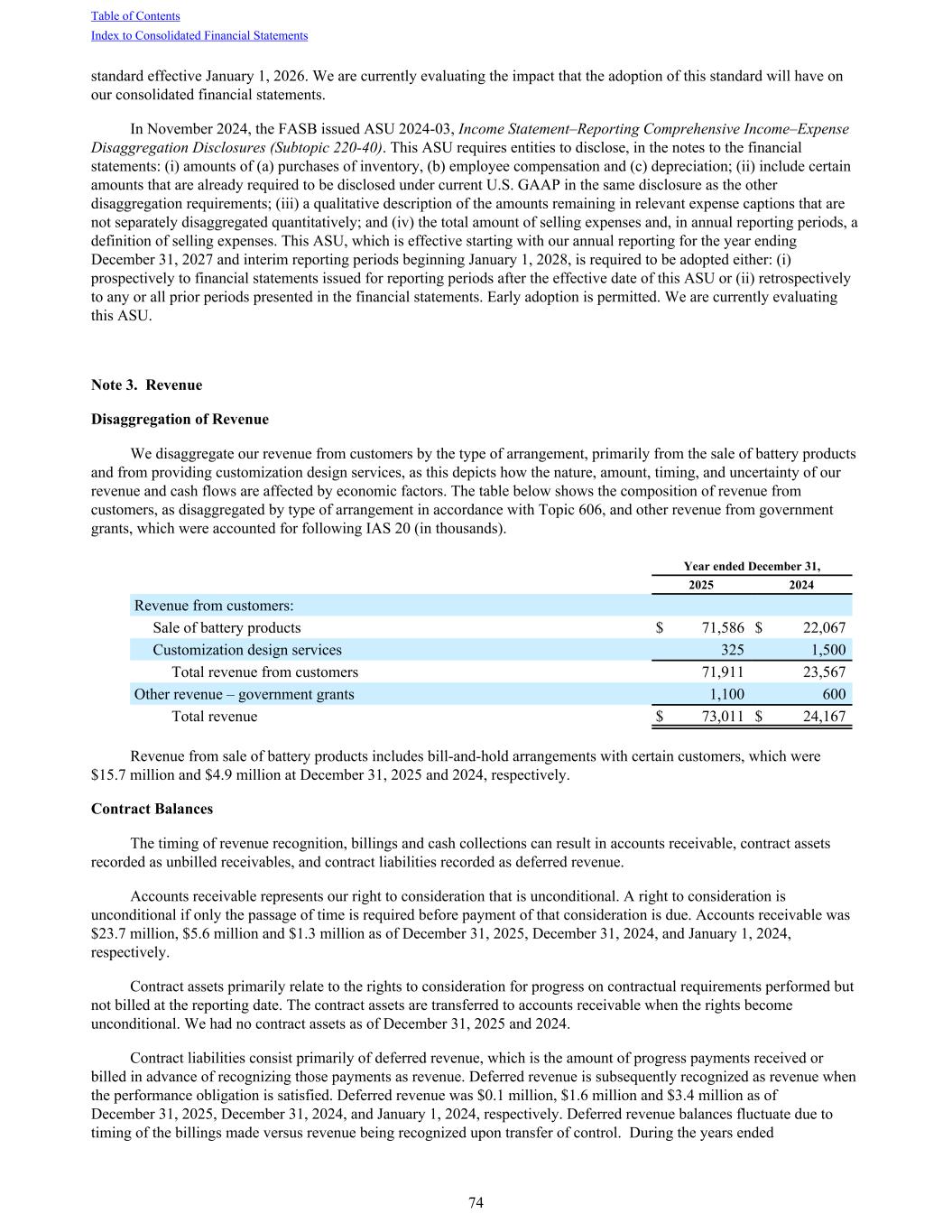 standard effective January 1, 2026. We are currently evaluating the impact that the adoption of this standard will have on our consolidated financial statements. In November 2024, the FASB issued ASU 2024-03, Income Statement–Reporting Comprehensive Income–Expense Disaggregation Disclosures (Subtopic 220-40). This ASU requires entities to disclose, in the notes to the financial statements: (i) amounts of (a) purchases of inventory, (b) employee compensation and (c) depreciation; (ii) include certain amounts that are already required to be disclosed under current U.S. GAAP in the same disclosure as the other disaggregation requirements; (iii) a qualitative description of the amounts remaining in relevant expense captions that are not separately disaggregated quantitatively; and (iv) the total amount of selling expenses and, in annual reporting periods, a definition of selling expenses. This ASU, which is effective starting with our annual reporting for the year ending December 31, 2027 and interim reporting periods beginning January 1, 2028, is required to be adopted either: (i) prospectively to financial statements issued for reporting periods after the effective date of this ASU or (ii) retrospectively to any or all prior periods presented in the financial statements. Early adoption is permitted. We are currently evaluating this ASU. Note 3. Revenue Disaggregation of Revenue We disaggregate our revenue from customers by the type of arrangement, primarily from the sale of battery products and from providing customization design services, as this depicts how the nature, amount, timing, and uncertainty of our revenue and cash flows are affected by economic factors. The table below shows the composition of revenue from customers, as disaggregated by type of arrangement in accordance with Topic 606, and other revenue from government grants, which were accounted for following IAS 20 (in thousands). Year ended December 31, 2025 2024 Revenue from customers: Sale of battery products $ 71,586 $ 22,067 Customization design services 325 1,500 Total revenue from customers 71,911 23,567 Other revenue – government grants 1,100 600 Total revenue $ 73,011 $ 24,167 Revenue from sale of battery products includes bill-and-hold arrangements with certain customers, which were $15.7 million and $4.9 million at December 31, 2025 and 2024, respectively. Contract Balances The timing of revenue recognition, billings and cash collections can result in accounts receivable, contract assets recorded as unbilled receivables, and contract liabilities recorded as deferred revenue. Accounts receivable represents our right to consideration that is unconditional. A right to consideration is unconditional if only the passage of time is required before payment of that consideration is due. Accounts receivable was $23.7 million, $5.6 million and $1.3 million as of December 31, 2025, December 31, 2024, and January 1, 2024, respectively. Contract assets primarily relate to the rights to consideration for progress on contractual requirements performed but not billed at the reporting date. The contract assets are transferred to accounts receivable when the rights become unconditional. We had no contract assets as of December 31, 2025 and 2024. Contract liabilities consist primarily of deferred revenue, which is the amount of progress payments received or billed in advance of recognizing those payments as revenue. Deferred revenue is subsequently recognized as revenue when the performance obligation is satisfied. Deferred revenue was $0.1 million, $1.6 million and $3.4 million as of December 31, 2025, December 31, 2024, and January 1, 2024, respectively. Deferred revenue balances fluctuate due to timing of the billings made versus revenue being recognized upon transfer of control. During the years ended Table of Contents Index to Consolidated Financial Statements 74