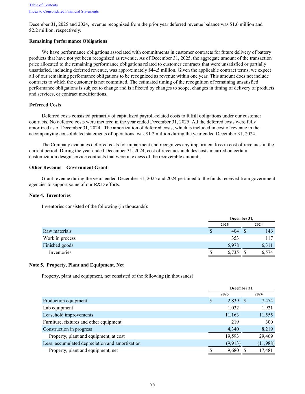 December 31, 2025 and 2024, revenue recognized from the prior year deferred revenue balance was $1.6 million and $2.2 million, respectively. Remaining Performance Obligations We have performance obligations associated with commitments in customer contracts for future delivery of battery products that have not yet been recognized as revenue. As of December 31, 2025, the aggregate amount of the transaction price allocated to the remaining performance obligations related to customer contracts that were unsatisfied or partially unsatisfied, including deferred revenue, was approximately $44.5 million. Given the applicable contract terms, we expect all of our remaining performance obligations to be recognized as revenue within one year. This amount does not include contracts to which the customer is not committed. The estimated timing of the recognition of remaining unsatisfied performance obligations is subject to change and is affected by changes to scope, changes in timing of delivery of products and services, or contract modifications. Deferred Costs Deferred costs consisted primarily of capitalized payroll-related costs to fulfill obligations under our customer contracts, No deferred costs were incurred in the year ended December 31, 2025. All the deferred costs were fully amortized as of December 31, 2024. The amortization of deferred costs, which is included in cost of revenue in the accompanying consolidated statements of operations, was $1.2 million during the year ended December 31, 2024. The Company evaluates deferred costs for impairment and recognizes any impairment loss in cost of revenues in the current period. During the year ended December 31, 2024, cost of revenues includes costs incurred on certain customization design service contracts that were in excess of the recoverable amount. Other Revenue – Government Grant Grant revenue during the years ended December 31, 2025 and 2024 pertained to the funds received from government agencies to support some of our R&D efforts. Note 4. Inventories Inventories consisted of the following (in thousands): December 31, 2025 2024 Raw materials $ 404 $ 146 Work in process 353 117 Finished goods 5,978 6,311 Inventories $ 6,735 $ 6,574 Note 5. Property, Plant and Equipment, Net Property, plant and equipment, net consisted of the following (in thousands): December 31, 2025 2024 Production equipment $ 2,839 $ 7,474 Lab equipment 1,032 1,921 Leasehold improvements 11,163 11,555 Furniture, fixtures and other equipment 219 300 Construction in progress 4,340 8,219 Property, plant and equipment, at cost 19,593 29,469 Less: accumulated depreciation and amortization (9,913) (11,988) Property, plant and equipment, net $ 9,680 $ 17,481 Table of Contents Index to Consolidated Financial Statements 75