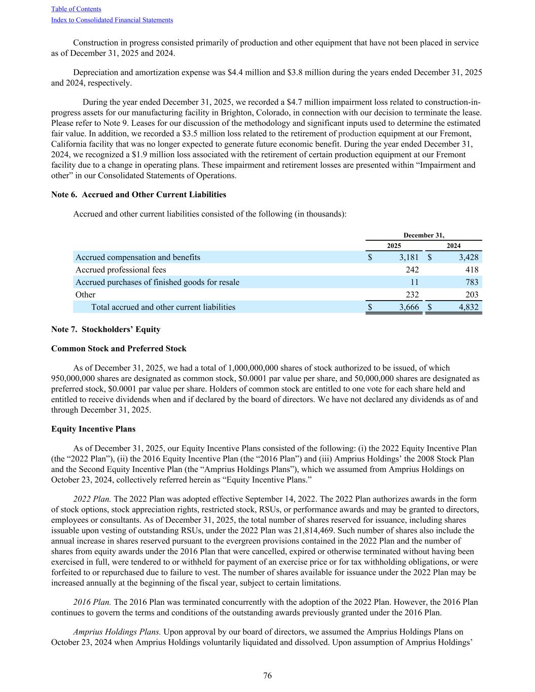 Construction in progress consisted primarily of production and other equipment that have not been placed in service as of December 31, 2025 and 2024. Depreciation and amortization expense was $4.4 million and $3.8 million during the years ended December 31, 2025 and 2024, respectively. During the year ended December 31, 2025, we recorded a $4.7 million impairment loss related to construction-in- progress assets for our manufacturing facility in Brighton, Colorado, in connection with our decision to terminate the lease. Please refer to Note 9. Leases for our discussion of the methodology and significant inputs used to determine the estimated fair value. In addition, we recorded a $3.5 million loss related to the retirement of production equipment at our Fremont, California facility that was no longer expected to generate future economic benefit. During the year ended December 31, 2024, we recognized a $1.9 million loss associated with the retirement of certain production equipment at our Fremont facility due to a change in operating plans. These impairment and retirement losses are presented within “Impairment and other” in our Consolidated Statements of Operations. Note 6. Accrued and Other Current Liabilities Accrued and other current liabilities consisted of the following (in thousands): December 31, 2025 2024 Accrued compensation and benefits $ 3,181 $ 3,428 Accrued professional fees 242 418 Accrued purchases of finished goods for resale 11 783 Other 232 203 Total accrued and other current liabilities $ 3,666 $ 4,832 Note 7. Stockholders’ Equity Common Stock and Preferred Stock As of December 31, 2025, we had a total of 1,000,000,000 shares of stock authorized to be issued, of which 950,000,000 shares are designated as common stock, $0.0001 par value per share, and 50,000,000 shares are designated as preferred stock, $0.0001 par value per share. Holders of common stock are entitled to one vote for each share held and entitled to receive dividends when and if declared by the board of directors. We have not declared any dividends as of and through December 31, 2025. Equity Incentive Plans As of December 31, 2025, our Equity Incentive Plans consisted of the following: (i) the 2022 Equity Incentive Plan (the “2022 Plan”), (ii) the 2016 Equity Incentive Plan (the “2016 Plan”) and (iii) Amprius Holdings’ the 2008 Stock Plan and the Second Equity Incentive Plan (the “Amprius Holdings Plans”), which we assumed from Amprius Holdings on October 23, 2024, collectively referred herein as “Equity Incentive Plans.” 2022 Plan. The 2022 Plan was adopted effective September 14, 2022. The 2022 Plan authorizes awards in the form of stock options, stock appreciation rights, restricted stock, RSUs, or performance awards and may be granted to directors, employees or consultants. As of December 31, 2025, the total number of shares reserved for issuance, including shares issuable upon vesting of outstanding RSUs, under the 2022 Plan was 21,814,469. Such number of shares also include the annual increase in shares reserved pursuant to the evergreen provisions contained in the 2022 Plan and the number of shares from equity awards under the 2016 Plan that were cancelled, expired or otherwise terminated without having been exercised in full, were tendered to or withheld for payment of an exercise price or for tax withholding obligations, or were forfeited to or repurchased due to failure to vest. The number of shares available for issuance under the 2022 Plan may be increased annually at the beginning of the fiscal year, subject to certain limitations. 2016 Plan. The 2016 Plan was terminated concurrently with the adoption of the 2022 Plan. However, the 2016 Plan continues to govern the terms and conditions of the outstanding awards previously granted under the 2016 Plan. Amprius Holdings Plans. Upon approval by our board of directors, we assumed the Amprius Holdings Plans on October 23, 2024 when Amprius Holdings voluntarily liquidated and dissolved. Upon assumption of Amprius Holdings’ Table of Contents Index to Consolidated Financial Statements 76