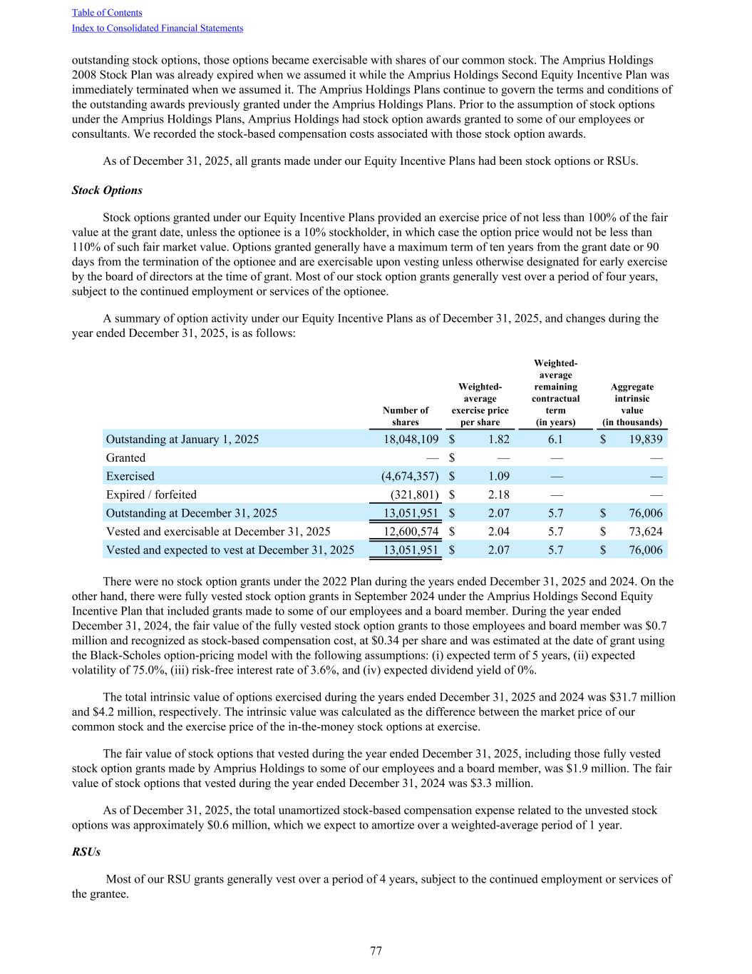 outstanding stock options, those options became exercisable with shares of our common stock. The Amprius Holdings 2008 Stock Plan was already expired when we assumed it while the Amprius Holdings Second Equity Incentive Plan was immediately terminated when we assumed it. The Amprius Holdings Plans continue to govern the terms and conditions of the outstanding awards previously granted under the Amprius Holdings Plans. Prior to the assumption of stock options under the Amprius Holdings Plans, Amprius Holdings had stock option awards granted to some of our employees or consultants. We recorded the stock-based compensation costs associated with those stock option awards. As of December 31, 2025, all grants made under our Equity Incentive Plans had been stock options or RSUs. Stock Options Stock options granted under our Equity Incentive Plans provided an exercise price of not less than 100% of the fair value at the grant date, unless the optionee is a 10% stockholder, in which case the option price would not be less than 110% of such fair market value. Options granted generally have a maximum term of ten years from the grant date or 90 days from the termination of the optionee and are exercisable upon vesting unless otherwise designated for early exercise by the board of directors at the time of grant. Most of our stock option grants generally vest over a period of four years, subject to the continued employment or services of the optionee. A summary of option activity under our Equity Incentive Plans as of December 31, 2025, and changes during the year ended December 31, 2025, is as follows: Number of shares Weighted- average exercise price per share Weighted- average remaining contractual term (in years) Aggregate intrinsic value (in thousands) Outstanding at January 1, 2025 18,048,109 $ 1.82 6.1 $ 19,839 Granted — $ — — — Exercised (4,674,357) $ 1.09 — — Expired / forfeited (321,801) $ 2.18 — — Outstanding at December 31, 2025 13,051,951 $ 2.07 5.7 $ 76,006 Vested and exercisable at December 31, 2025 12,600,574 $ 2.04 5.7 $ 73,624 Vested and expected to vest at December 31, 2025 13,051,951 $ 2.07 5.7 $ 76,006 There were no stock option grants under the 2022 Plan during the years ended December 31, 2025 and 2024. On the other hand, there were fully vested stock option grants in September 2024 under the Amprius Holdings Second Equity Incentive Plan that included grants made to some of our employees and a board member. During the year ended December 31, 2024, the fair value of the fully vested stock option grants to those employees and board member was $0.7 million and recognized as stock-based compensation cost, at $0.34 per share and was estimated at the date of grant using the Black-Scholes option-pricing model with the following assumptions: (i) expected term of 5 years, (ii) expected volatility of 75.0%, (iii) risk-free interest rate of 3.6%, and (iv) expected dividend yield of 0%. The total intrinsic value of options exercised during the years ended December 31, 2025 and 2024 was $31.7 million and $4.2 million, respectively. The intrinsic value was calculated as the difference between the market price of our common stock and the exercise price of the in-the-money stock options at exercise. The fair value of stock options that vested during the year ended December 31, 2025, including those fully vested stock option grants made by Amprius Holdings to some of our employees and a board member, was $1.9 million. The fair value of stock options that vested during the year ended December 31, 2024 was $3.3 million. As of December 31, 2025, the total unamortized stock-based compensation expense related to the unvested stock options was approximately $0.6 million, which we expect to amortize over a weighted-average period of 1 year. RSUs Most of our RSU grants generally vest over a period of 4 years, subject to the continued employment or services of the grantee. Table of Contents Index to Consolidated Financial Statements 77