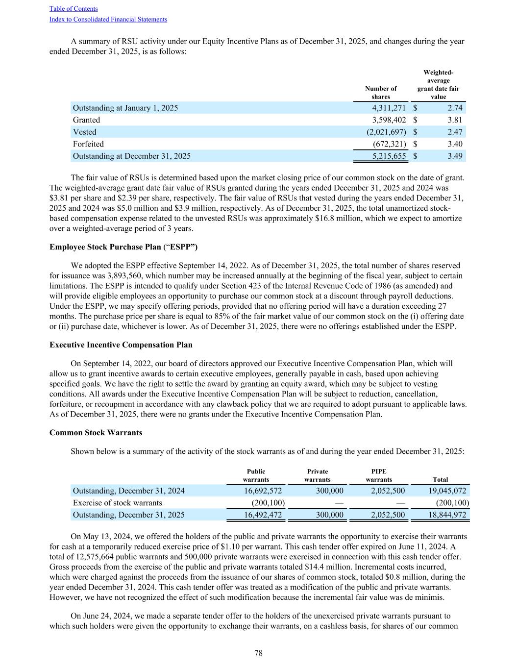 A summary of RSU activity under our Equity Incentive Plans as of December 31, 2025, and changes during the year ended December 31, 2025, is as follows: Number of shares Weighted- average grant date fair value Outstanding at January 1, 2025 4,311,271 $ 2.74 Granted 3,598,402 $ 3.81 Vested (2,021,697) $ 2.47 Forfeited (672,321) $ 3.40 Outstanding at December 31, 2025 5,215,655 $ 3.49 The fair value of RSUs is determined based upon the market closing price of our common stock on the date of grant. The weighted-average grant date fair value of RSUs granted during the years ended December 31, 2025 and 2024 was $3.81 per share and $2.39 per share, respectively. The fair value of RSUs that vested during the years ended December 31, 2025 and 2024 was $5.0 million and $3.9 million, respectively. As of December 31, 2025, the total unamortized stock- based compensation expense related to the unvested RSUs was approximately $16.8 million, which we expect to amortize over a weighted-average period of 3 years. Employee Stock Purchase Plan (“ESPP”) We adopted the ESPP effective September 14, 2022. As of December 31, 2025, the total number of shares reserved for issuance was 3,893,560, which number may be increased annually at the beginning of the fiscal year, subject to certain limitations. The ESPP is intended to qualify under Section 423 of the Internal Revenue Code of 1986 (as amended) and will provide eligible employees an opportunity to purchase our common stock at a discount through payroll deductions. Under the ESPP, we may specify offering periods, provided that no offering period will have a duration exceeding 27 months. The purchase price per share is equal to 85% of the fair market value of our common stock on the (i) offering date or (ii) purchase date, whichever is lower. As of December 31, 2025, there were no offerings established under the ESPP. Executive Incentive Compensation Plan On September 14, 2022, our board of directors approved our Executive Incentive Compensation Plan, which will allow us to grant incentive awards to certain executive employees, generally payable in cash, based upon achieving specified goals. We have the right to settle the award by granting an equity award, which may be subject to vesting conditions. All awards under the Executive Incentive Compensation Plan will be subject to reduction, cancellation, forfeiture, or recoupment in accordance with any clawback policy that we are required to adopt pursuant to applicable laws. As of December 31, 2025, there were no grants under the Executive Incentive Compensation Plan. Common Stock Warrants Shown below is a summary of the activity of the stock warrants as of and during the year ended December 31, 2025: Public warrants Private warrants PIPE warrants Total Outstanding, December 31, 2024 16,692,572 300,000 2,052,500 19,045,072 Exercise of stock warrants (200,100) — — (200,100) Outstanding, December 31, 2025 16,492,472 300,000 2,052,500 18,844,972 On May 13, 2024, we offered the holders of the public and private warrants the opportunity to exercise their warrants for cash at a temporarily reduced exercise price of $1.10 per warrant. This cash tender offer expired on June 11, 2024. A total of 12,575,664 public warrants and 500,000 private warrants were exercised in connection with this cash tender offer. Gross proceeds from the exercise of the public and private warrants totaled $14.4 million. Incremental costs incurred, which were charged against the proceeds from the issuance of our shares of common stock, totaled $0.8 million, during the year ended December 31, 2024. This cash tender offer was treated as a modification of the public and private warrants. However, we have not recognized the effect of such modification because the incremental fair value was de minimis. On June 24, 2024, we made a separate tender offer to the holders of the unexercised private warrants pursuant to which such holders were given the opportunity to exchange their warrants, on a cashless basis, for shares of our common Table of Contents Index to Consolidated Financial Statements 78