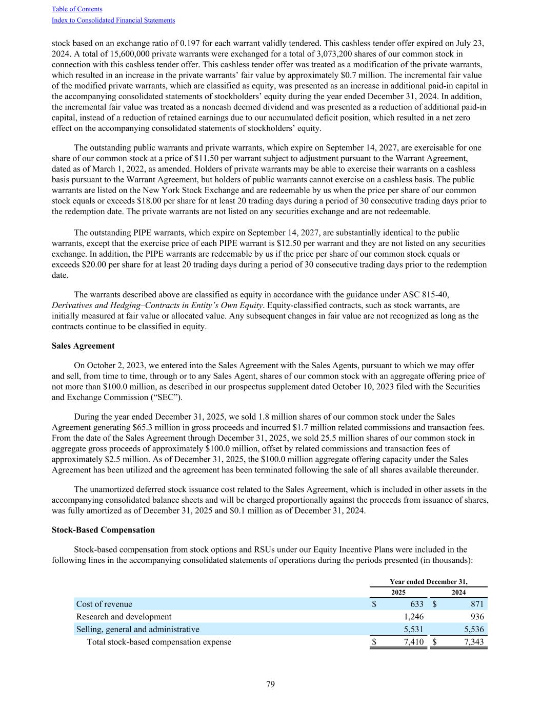 stock based on an exchange ratio of 0.197 for each warrant validly tendered. This cashless tender offer expired on July 23, 2024. A total of 15,600,000 private warrants were exchanged for a total of 3,073,200 shares of our common stock in connection with this cashless tender offer. This cashless tender offer was treated as a modification of the private warrants, which resulted in an increase in the private warrants’ fair value by approximately $0.7 million. The incremental fair value of the modified private warrants, which are classified as equity, was presented as an increase in additional paid-in capital in the accompanying consolidated statements of stockholders’ equity during the year ended December 31, 2024. In addition, the incremental fair value was treated as a noncash deemed dividend and was presented as a reduction of additional paid-in capital, instead of a reduction of retained earnings due to our accumulated deficit position, which resulted in a net zero effect on the accompanying consolidated statements of stockholders’ equity. The outstanding public warrants and private warrants, which expire on September 14, 2027, are exercisable for one share of our common stock at a price of $11.50 per warrant subject to adjustment pursuant to the Warrant Agreement, dated as of March 1, 2022, as amended. Holders of private warrants may be able to exercise their warrants on a cashless basis pursuant to the Warrant Agreement, but holders of public warrants cannot exercise on a cashless basis. The public warrants are listed on the New York Stock Exchange and are redeemable by us when the price per share of our common stock equals or exceeds $18.00 per share for at least 20 trading days during a period of 30 consecutive trading days prior to the redemption date. The private warrants are not listed on any securities exchange and are not redeemable. The outstanding PIPE warrants, which expire on September 14, 2027, are substantially identical to the public warrants, except that the exercise price of each PIPE warrant is $12.50 per warrant and they are not listed on any securities exchange. In addition, the PIPE warrants are redeemable by us if the price per share of our common stock equals or exceeds $20.00 per share for at least 20 trading days during a period of 30 consecutive trading days prior to the redemption date. The warrants described above are classified as equity in accordance with the guidance under ASC 815-40, Derivatives and Hedging–Contracts in Entity’s Own Equity. Equity-classified contracts, such as stock warrants, are initially measured at fair value or allocated value. Any subsequent changes in fair value are not recognized as long as the contracts continue to be classified in equity. Sales Agreement On October 2, 2023, we entered into the Sales Agreement with the Sales Agents, pursuant to which we may offer and sell, from time to time, through or to any Sales Agent, shares of our common stock with an aggregate offering price of not more than $100.0 million, as described in our prospectus supplement dated October 10, 2023 filed with the Securities and Exchange Commission (“SEC”). During the year ended December 31, 2025, we sold 1.8 million shares of our common stock under the Sales Agreement generating $65.3 million in gross proceeds and incurred $1.7 million related commissions and transaction fees. From the date of the Sales Agreement through December 31, 2025, we sold 25.5 million shares of our common stock in aggregate gross proceeds of approximately $100.0 million, offset by related commissions and transaction fees of approximately $2.5 million. As of December 31, 2025, the $100.0 million aggregate offering capacity under the Sales Agreement has been utilized and the agreement has been terminated following the sale of all shares available thereunder. The unamortized deferred stock issuance cost related to the Sales Agreement, which is included in other assets in the accompanying consolidated balance sheets and will be charged proportionally against the proceeds from issuance of shares, was fully amortized as of December 31, 2025 and $0.1 million as of December 31, 2024. Stock-Based Compensation Stock-based compensation from stock options and RSUs under our Equity Incentive Plans were included in the following lines in the accompanying consolidated statements of operations during the periods presented (in thousands): Year ended December 31, 2025 2024 Cost of revenue $ 633 $ 871 Research and development 1,246 936 Selling, general and administrative 5,531 5,536 Total stock-based compensation expense $ 7,410 $ 7,343 Table of Contents Index to Consolidated Financial Statements 79
