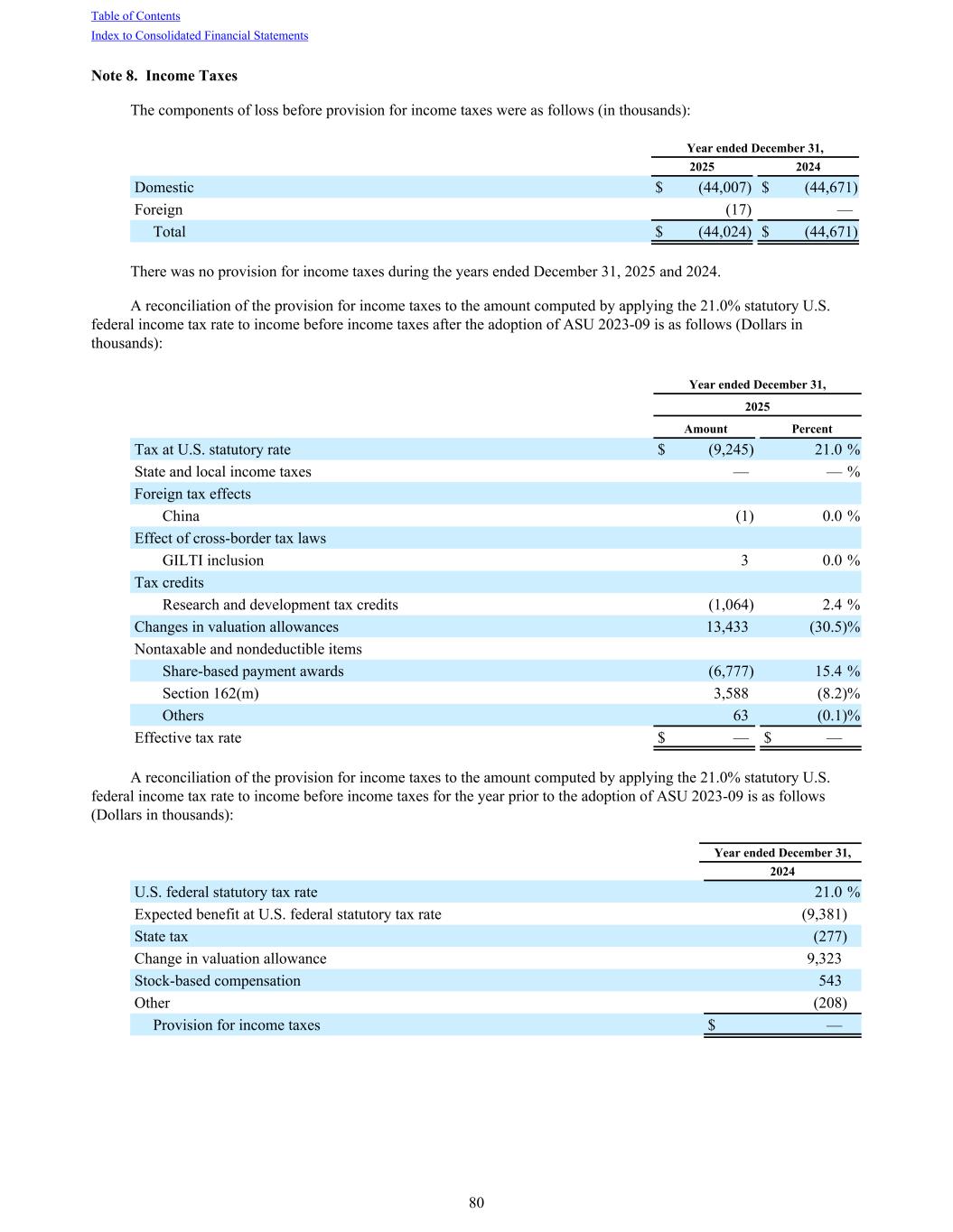 Note 8. Income Taxes The components of loss before provision for income taxes were as follows (in thousands): Year ended December 31, 2025 2024 Domestic $ (44,007) $ (44,671) Foreign (17) — Total $ (44,024) $ (44,671) There was no provision for income taxes during the years ended December 31, 2025 and 2024. A reconciliation of the provision for income taxes to the amount computed by applying the 21.0% statutory U.S. federal income tax rate to income before income taxes after the adoption of ASU 2023-09 is as follows (Dollars in thousands): Year ended December 31, 2025 Amount Percent Tax at U.S. statutory rate $ (9,245) 21.0 % State and local income taxes — — % Foreign tax effects China (1) 0.0 % Effect of cross-border tax laws GILTI inclusion 3 0.0 % Tax credits Research and development tax credits (1,064) 2.4 % Changes in valuation allowances 13,433 (30.5) % Nontaxable and nondeductible items Share-based payment awards (6,777) 15.4 % Section 162(m) 3,588 (8.2) % Others 63 (0.1) % Effective tax rate $ — $ — A reconciliation of the provision for income taxes to the amount computed by applying the 21.0% statutory U.S. federal income tax rate to income before income taxes for the year prior to the adoption of ASU 2023-09 is as follows (Dollars in thousands): Year ended December 31, 2024 U.S. federal statutory tax rate 21.0 % Expected benefit at U.S. federal statutory tax rate (9,381) State tax (277) Change in valuation allowance 9,323 Stock-based compensation 543 Other (208) Provision for income taxes $ — Table of Contents Index to Consolidated Financial Statements 80