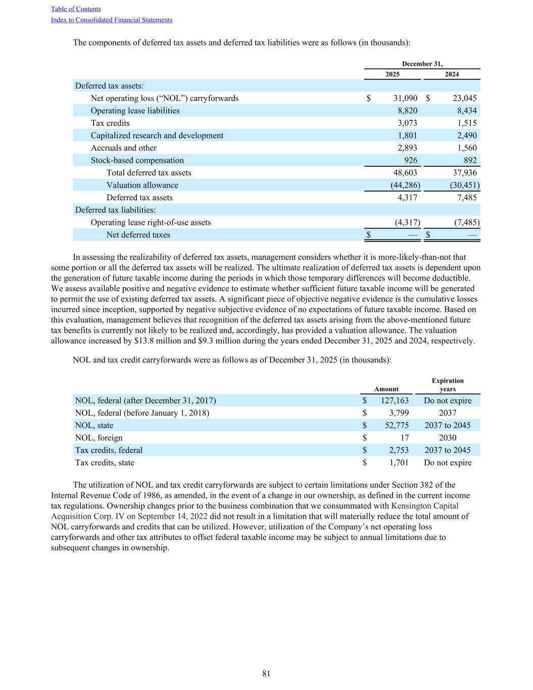 The components of deferred tax assets and deferred tax liabilities were as follows (in thousands): December 31, 2025 2024 Deferred tax assets: Net operating loss (“NOL”) carryforwards $ 31,090 $ 23,045 Operating lease liabilities 8,820 8,434 Tax credits 3,073 1,515 Capitalized research and development 1,801 2,490 Accruals and other 2,893 1,560 Stock-based compensation 926 892 Total deferred tax assets 48,603 37,936 Valuation allowance (44,286) (30,451) Deferred tax assets 4,317 7,485 Deferred tax liabilities: Operating lease right-of-use assets (4,317) (7,485) Net deferred taxes $ — $ — In assessing the realizability of deferred tax assets, management considers whether it is more-likely-than-not that some portion or all the deferred tax assets will be realized. The ultimate realization of deferred tax assets is dependent upon the generation of future taxable income during the periods in which those temporary differences will become deductible. We assess available positive and negative evidence to estimate whether sufficient future taxable income will be generated to permit the use of existing deferred tax assets. A significant piece of objective negative evidence is the cumulative losses incurred since inception, supported by negative subjective evidence of no expectations of future taxable income. Based on this evaluation, management believes that recognition of the deferred tax assets arising from the above-mentioned future tax benefits is currently not likely to be realized and, accordingly, has provided a valuation allowance. The valuation allowance increased by $13.8 million and $9.3 million during the years ended December 31, 2025 and 2024, respectively. NOL and tax credit carryforwards were as follows as of December 31, 2025 (in thousands): Amount Expiration years NOL, federal (after December 31, 2017) $ 127,163 Do not expire NOL, federal (before January 1, 2018) $ 3,799 2037 NOL, state $ 52,775 2037 to 2045 NOL, foreign $ 17 2030 Tax credits, federal $ 2,753 2037 to 2045 Tax credits, state $ 1,701 Do not expire The utilization of NOL and tax credit carryforwards are subject to certain limitations under Section 382 of the Internal Revenue Code of 1986, as amended, in the event of a change in our ownership, as defined in the current income tax regulations. Ownership changes prior to the business combination that we consummated with Kensington Capital Acquisition Corp. IV on September 14, 2022 did not result in a limitation that will materially reduce the total amount of NOL carryforwards and credits that can be utilized. However, utilization of the Company’s net operating loss carryforwards and other tax attributes to offset federal taxable income may be subject to annual limitations due to subsequent changes in ownership. Table of Contents Index to Consolidated Financial Statements 81