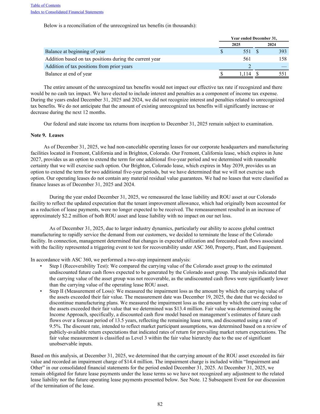 Below is a reconciliation of the unrecognized tax benefits (in thousands): Year ended December 31, 2025 2024 Balance at beginning of year $ 551 $ 393 Addition based on tax positions during the current year 561 158 Addition of tax positions from prior years 2 — Balance at end of year $ 1,114 $ 551 The entire amount of the unrecognized tax benefits would not impact our effective tax rate if recognized and there would be no cash tax impact. We have elected to include interest and penalties as a component of income tax expense. During the years ended December 31, 2025 and 2024, we did not recognize interest and penalties related to unrecognized tax benefits. We do not anticipate that the amount of existing unrecognized tax benefits will significantly increase or decrease during the next 12 months. Our federal and state income tax returns from inception to December 31, 2025 remain subject to examination. Note 9. Leases As of December 31, 2025, we had non-cancelable operating leases for our corporate headquarters and manufacturing facilities located in Fremont, California and in Brighton, Colorado. Our Fremont, California lease, which expires in June 2027, provides us an option to extend the term for one additional five-year period and we determined with reasonable certainty that we will exercise such option. Our Brighton, Colorado lease, which expires in May 2039, provides us an option to extend the term for two additional five-year periods, but we have determined that we will not exercise such option. Our operating leases do not contain any material residual value guarantees. We had no leases that were classified as finance leases as of December 31, 2025 and 2024. During the year ended December 31, 2025, we remeasured the lease liability and ROU asset at our Colorado facility to reflect the updated expectation that the tenant improvement allowance, which had originally been accounted for as a reduction of lease payments, were no longer expected to be received. The remeasurement resulted in an increase of approximately $2.2 million of both ROU asset and lease liability with no impact on our net loss. As of December 31, 2025, due to larger industry dynamics, particularly our ability to access global contract manufacturing to rapidly service the demand from our customers, we decided to terminate the lease of the Colorado facility. In connection, management determined that changes in expected utilization and forecasted cash flows associated with the facility represented a triggering event to test for recoverability under ASC 360, Property, Plant, and Equipment. In accordance with ASC 360, we performed a two-step impairment analysis: • Step I (Recoverability Test): We compared the carrying value of the Colorado asset group to the estimated undiscounted future cash flows expected to be generated by the Colorado asset group. The analysis indicated that the carrying value of the asset group was not recoverable, as the undiscounted cash flows were significantly lower than the carrying value of the operating lease ROU asset. • Step II (Measurement of Loss): We measured the impairment loss as the amount by which the carrying value of the assets exceeded their fair value. The measurement date was December 19, 2025, the date that we decided to discontinue manufacturing plans. We measured the impairment loss as the amount by which the carrying value of the assets exceeded their fair value that we determined was $13.4 million. Fair value was determined using the Income Approach, specifically, a discounted cash flow model based on management’s estimates of future cash flows over a forecast period of 13.5 years, reflecting the remaining lease term, and discounted using a rate of 9.5%. The discount rate, intended to reflect market participant assumptions, was determined based on a review of publicly-available return expectations that indicated rates of return for prevailing market return expectations. The fair value measurement is classified as Level 3 within the fair value hierarchy due to the use of significant unobservable inputs. Based on this analysis, at December 31, 2025, we determined that the carrying amount of the ROU asset exceeded its fair value and recorded an impairment charge of $14.4 million. The impairment charge is included within “Impairment and Other” in our consolidated financial statements for the period ended December 31, 2025. At December 31, 2025, we remain obligated for future lease payments under the lease terms so we have not recognized any adjustment to the related lease liability nor the future operating lease payments presented below. See Note. 12 Subsequent Event for our discussion of the termination of the lease. Table of Contents Index to Consolidated Financial Statements 82
