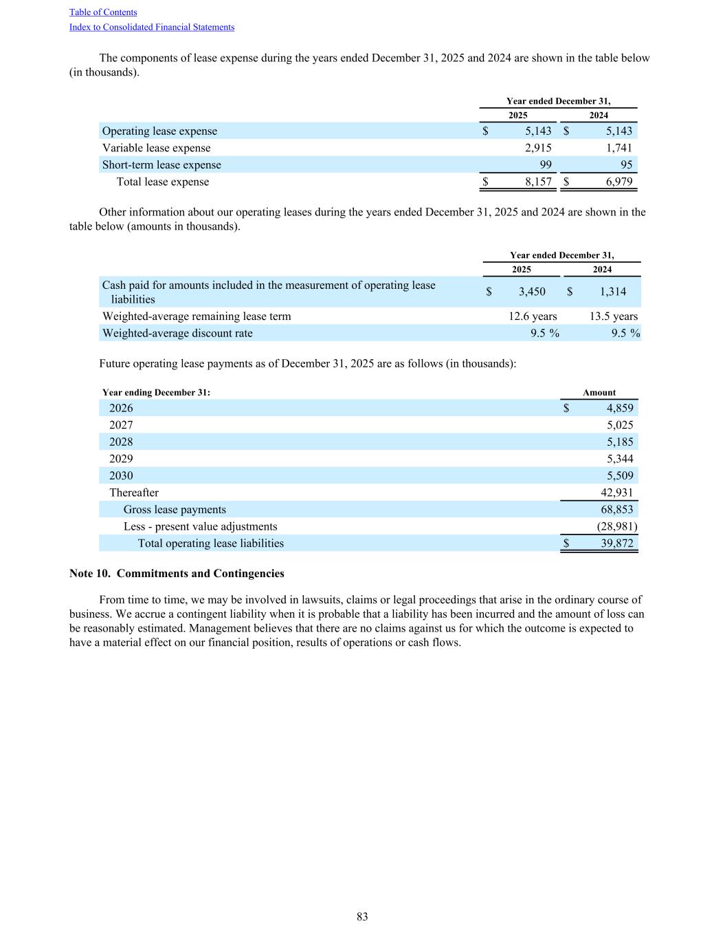 The components of lease expense during the years ended December 31, 2025 and 2024 are shown in the table below (in thousands). Year ended December 31, 2025 2024 Operating lease expense $ 5,143 $ 5,143 Variable lease expense 2,915 1,741 Short-term lease expense 99 95 Total lease expense $ 8,157 $ 6,979 Other information about our operating leases during the years ended December 31, 2025 and 2024 are shown in the table below (amounts in thousands). Year ended December 31, 2025 2024 Cash paid for amounts included in the measurement of operating lease liabilities $ 3,450 $ 1,314 Weighted-average remaining lease term 12.6 years 13.5 years Weighted-average discount rate 9.5 % 9.5 % Future operating lease payments as of December 31, 2025 are as follows (in thousands): Year ending December 31: Amount 2026 $ 4,859 2027 5,025 2028 5,185 2029 5,344 2030 5,509 Thereafter 42,931 Gross lease payments 68,853 Less - present value adjustments (28,981) Total operating lease liabilities $ 39,872 Note 10. Commitments and Contingencies From time to time, we may be involved in lawsuits, claims or legal proceedings that arise in the ordinary course of business. We accrue a contingent liability when it is probable that a liability has been incurred and the amount of loss can be reasonably estimated. Management believes that there are no claims against us for which the outcome is expected to have a material effect on our financial position, results of operations or cash flows. Table of Contents Index to Consolidated Financial Statements 83