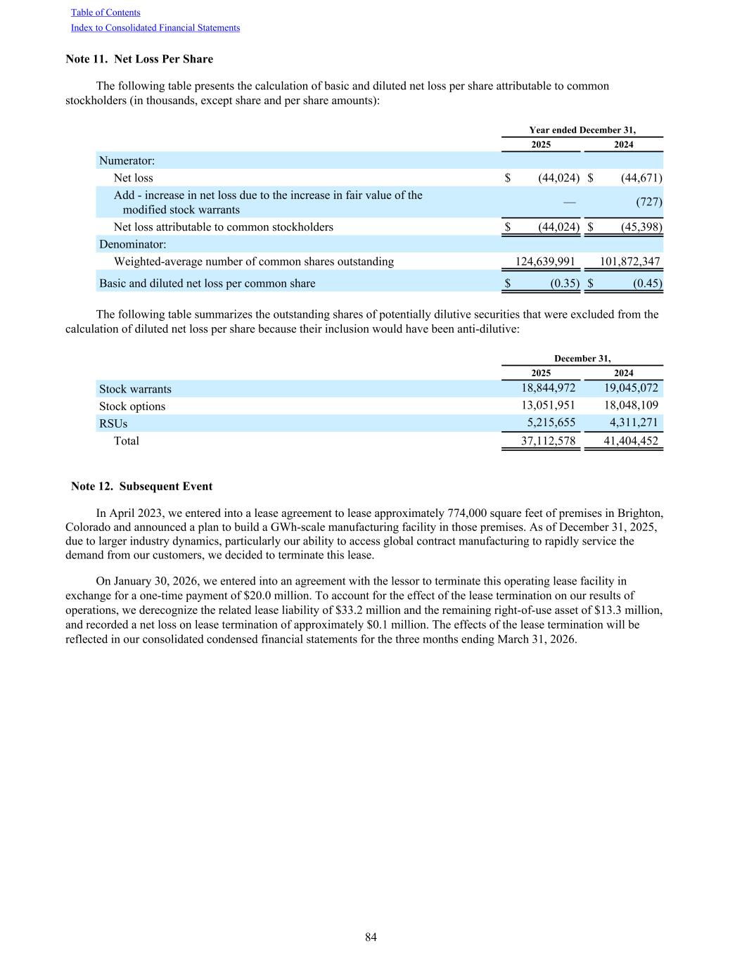 Note 11. Net Loss Per Share The following table presents the calculation of basic and diluted net loss per share attributable to common stockholders (in thousands, except share and per share amounts): Year ended December 31, 2025 2024 Numerator: Net loss $ (44,024) $ (44,671) Add - increase in net loss due to the increase in fair value of the modified stock warrants — (727) Net loss attributable to common stockholders $ (44,024) $ (45,398) Denominator: Weighted-average number of common shares outstanding 124,639,991 101,872,347 Basic and diluted net loss per common share $ (0.35) $ (0.45) The following table summarizes the outstanding shares of potentially dilutive securities that were excluded from the calculation of diluted net loss per share because their inclusion would have been anti-dilutive: December 31, 2025 2024 Stock warrants 18,844,972 19,045,072 Stock options 13,051,951 18,048,109 RSUs 5,215,655 4,311,271 Total 37,112,578 41,404,452 Note 12. Subsequent Event In April 2023, we entered into a lease agreement to lease approximately 774,000 square feet of premises in Brighton, Colorado and announced a plan to build a GWh-scale manufacturing facility in those premises. As of December 31, 2025, due to larger industry dynamics, particularly our ability to access global contract manufacturing to rapidly service the demand from our customers, we decided to terminate this lease. On January 30, 2026, we entered into an agreement with the lessor to terminate this operating lease facility in exchange for a one-time payment of $20.0 million. To account for the effect of the lease termination on our results of operations, we derecognize the related lease liability of $33.2 million and the remaining right-of-use asset of $13.3 million, and recorded a net loss on lease termination of approximately $0.1 million. The effects of the lease termination will be reflected in our consolidated condensed financial statements for the three months ending March 31, 2026. Table of Contents Index to Consolidated Financial Statements 84