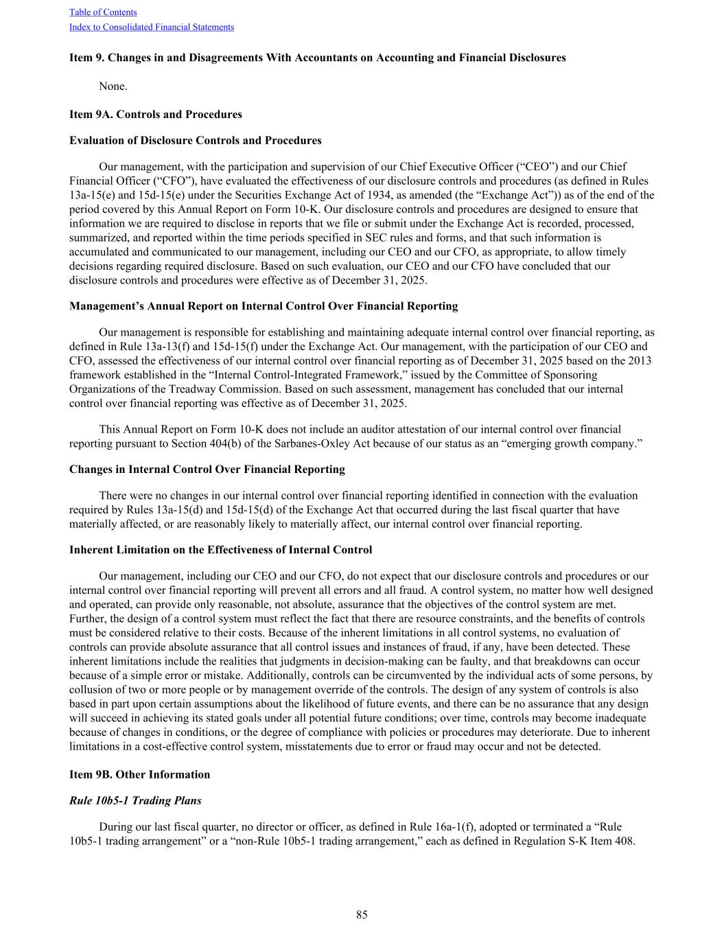 Item 9. Changes in and Disagreements With Accountants on Accounting and Financial Disclosures None. Item 9A. Controls and Procedures Evaluation of Disclosure Controls and Procedures Our management, with the participation and supervision of our Chief Executive Officer (“CEO”) and our Chief Financial Officer (“CFO”), have evaluated the effectiveness of our disclosure controls and procedures (as defined in Rules 13a-15(e) and 15d-15(e) under the Securities Exchange Act of 1934, as amended (the “Exchange Act”)) as of the end of the period covered by this Annual Report on Form 10-K. Our disclosure controls and procedures are designed to ensure that information we are required to disclose in reports that we file or submit under the Exchange Act is recorded, processed, summarized, and reported within the time periods specified in SEC rules and forms, and that such information is accumulated and communicated to our management, including our CEO and our CFO, as appropriate, to allow timely decisions regarding required disclosure. Based on such evaluation, our CEO and our CFO have concluded that our disclosure controls and procedures were effective as of December 31, 2025. Management’s Annual Report on Internal Control Over Financial Reporting Our management is responsible for establishing and maintaining adequate internal control over financial reporting, as defined in Rule 13a-13(f) and 15d-15(f) under the Exchange Act. Our management, with the participation of our CEO and CFO, assessed the effectiveness of our internal control over financial reporting as of December 31, 2025 based on the 2013 framework established in the “Internal Control-Integrated Framework,” issued by the Committee of Sponsoring Organizations of the Treadway Commission. Based on such assessment, management has concluded that our internal control over financial reporting was effective as of December 31, 2025. This Annual Report on Form 10-K does not include an auditor attestation of our internal control over financial reporting pursuant to Section 404(b) of the Sarbanes-Oxley Act because of our status as an “emerging growth company.” Changes in Internal Control Over Financial Reporting There were no changes in our internal control over financial reporting identified in connection with the evaluation required by Rules 13a-15(d) and 15d-15(d) of the Exchange Act that occurred during the last fiscal quarter that have materially affected, or are reasonably likely to materially affect, our internal control over financial reporting. Inherent Limitation on the Effectiveness of Internal Control Our management, including our CEO and our CFO, do not expect that our disclosure controls and procedures or our internal control over financial reporting will prevent all errors and all fraud. A control system, no matter how well designed and operated, can provide only reasonable, not absolute, assurance that the objectives of the control system are met. Further, the design of a control system must reflect the fact that there are resource constraints, and the benefits of controls must be considered relative to their costs. Because of the inherent limitations in all control systems, no evaluation of controls can provide absolute assurance that all control issues and instances of fraud, if any, have been detected. These inherent limitations include the realities that judgments in decision-making can be faulty, and that breakdowns can occur because of a simple error or mistake. Additionally, controls can be circumvented by the individual acts of some persons, by collusion of two or more people or by management override of the controls. The design of any system of controls is also based in part upon certain assumptions about the likelihood of future events, and there can be no assurance that any design will succeed in achieving its stated goals under all potential future conditions; over time, controls may become inadequate because of changes in conditions, or the degree of compliance with policies or procedures may deteriorate. Due to inherent limitations in a cost-effective control system, misstatements due to error or fraud may occur and not be detected. Item 9B. Other Information Rule 10b5-1 Trading Plans During our last fiscal quarter, no director or officer, as defined in Rule 16a-1(f), adopted or terminated a “Rule 10b5-1 trading arrangement” or a “non-Rule 10b5-1 trading arrangement,” each as defined in Regulation S-K Item 408. Table of Contents Index to Consolidated Financial Statements 85