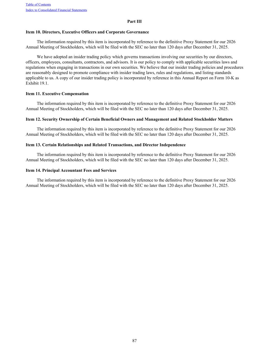 Part III Item 10. Directors, Executive Officers and Corporate Governance The information required by this item is incorporated by reference to the definitive Proxy Statement for our 2026 Annual Meeting of Stockholders, which will be filed with the SEC no later than 120 days after December 31, 2025. We have adopted an insider trading policy which governs transactions involving our securities by our directors, officers, employees, consultants, contractors, and advisors. It is our policy to comply with applicable securities laws and regulations when engaging in transactions in our own securities. We believe that our insider trading policies and procedures are reasonably designed to promote compliance with insider trading laws, rules and regulations, and listing standards applicable to us. A copy of our insider trading policy is incorporated by reference in this Annual Report on Form 10-K as Exhibit 19.1. Item 11. Executive Compensation The information required by this item is incorporated by reference to the definitive Proxy Statement for our 2026 Annual Meeting of Stockholders, which will be filed with the SEC no later than 120 days after December 31, 2025. Item 12. Security Ownership of Certain Beneficial Owners and Management and Related Stockholder Matters The information required by this item is incorporated by reference to the definitive Proxy Statement for our 2026 Annual Meeting of Stockholders, which will be filed with the SEC no later than 120 days after December 31, 2025. Item 13. Certain Relationships and Related Transactions, and Director Independence The information required by this item is incorporated by reference to the definitive Proxy Statement for our 2026 Annual Meeting of Stockholders, which will be filed with the SEC no later than 120 days after December 31, 2025. Item 14. Principal Accountant Fees and Services The information required by this item is incorporated by reference to the definitive Proxy Statement for our 2026 Annual Meeting of Stockholders, which will be filed with the SEC no later than 120 days after December 31, 2025. Table of Contents Index to Consolidated Financial Statements 87
