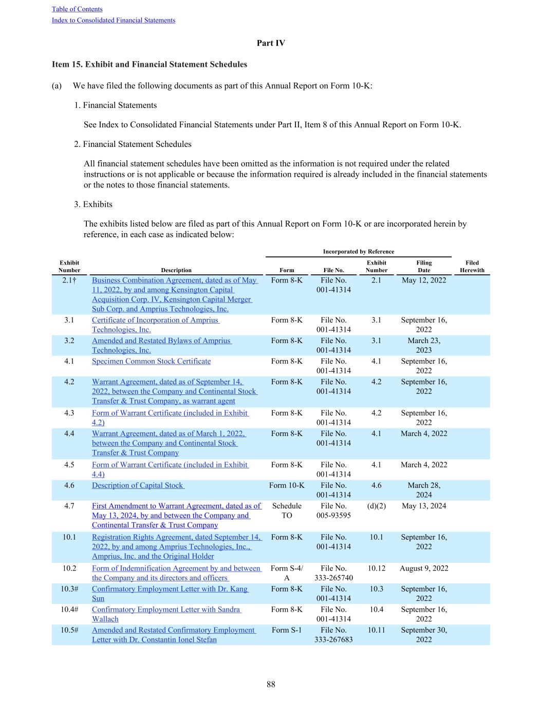 Part IV Item 15. Exhibit and Financial Statement Schedules (a) We have filed the following documents as part of this Annual Report on Form 10-K: 1. Financial Statements See Index to Consolidated Financial Statements under Part II, Item 8 of this Annual Report on Form 10-K. 2. Financial Statement Schedules All financial statement schedules have been omitted as the information is not required under the related instructions or is not applicable or because the information required is already included in the financial statements or the notes to those financial statements. 3. Exhibits The exhibits listed below are filed as part of this Annual Report on Form 10-K or are incorporated herein by reference, in each case as indicated below: 2.1† Business Combination Agreement, dated as of May 11, 2022, by and among Kensington Capital Acquisition Corp. IV, Kensington Capital Merger Sub Corp. and Amprius Technologies, Inc. Form 8-K File No. 001-41314 2.1 May 12, 2022 3.1 Certificate of Incorporation of Amprius Technologies, Inc. Form 8-K File No. 001-41314 3.1 September 16, 2022 3.2 Amended and Restated Bylaws of Amprius Technologies, Inc. Form 8-K File No. 001-41314 3.1 March 23, 2023 4.1 Specimen Common Stock Certificate Form 8-K File No. 001-41314 4.1 September 16, 2022 4.2 Warrant Agreement, dated as of September 14, 2022, between the Company and Continental Stock Transfer & Trust Company, as warrant agent Form 8-K File No. 001-41314 4.2 September 16, 2022 4.3 Form of Warrant Certificate (included in Exhibit 4.2) Form 8-K File No. 001-41314 4.2 September 16, 2022 4.4 Warrant Agreement, dated as of March 1, 2022, between the Company and Continental Stock Transfer & Trust Company Form 8-K File No. 001-41314 4.1 March 4, 2022 4.5 Form of Warrant Certificate (included in Exhibit 4.4) Form 8-K File No. 001-41314 4.1 March 4, 2022 4.6 Description of Capital Stock Form 10-K File No. 001-41314 4.6 March 28, 2024 4.7 First Amendment to Warrant Agreement, dated as of May 13, 2024, by and between the Company and Continental Transfer & Trust Company Schedule TO File No. 005-93595 (d)(2) May 13, 2024 10.1 Registration Rights Agreement, dated September 14, 2022, by and among Amprius Technologies, Inc., Amprius, Inc. and the Original Holder Form 8-K File No. 001-41314 10.1 September 16, 2022 10.2 Form of Indemnification Agreement by and between the Company and its directors and officers Form S-4/ A File No. 333-265740 10.12 August 9, 2022 10.3# Confirmatory Employment Letter with Dr. Kang Sun Form 8-K File No. 001-41314 10.3 September 16, 2022 10.4# Confirmatory Employment Letter with Sandra Wallach Form 8-K File No. 001-41314 10.4 September 16, 2022 10.5# Amended and Restated Confirmatory Employment Letter with Dr. Constantin Ionel Stefan Form S-1 File No. 333-267683 10.11 September 30, 2022 Incorporated by Reference Exhibit Number Description Form File No. Exhibit Number Filing Date Filed Herewith Table of Contents Index to Consolidated Financial Statements 88