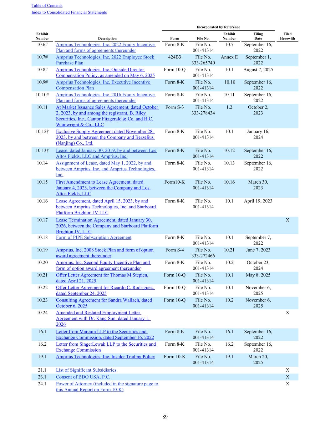 10.6# Amprius Technologies, Inc. 2022 Equity Incentive Plan and forms of agreements thereunder Form 8-K File No. 001-41314 10.7 September 16, 2022 10.7# Amprius Technologies, Inc. 2022 Employee Stock Purchase Plan 424B3 File No. 333-265740 Annex E September 1, 2022 10.8# Amprius Technologies, Inc. Outside Director Compensation Policy, as amended on May 6, 2025 Form 10-Q File No. 001-41314 10.1 August 7, 2025 10.9# Amprius Technologies, Inc. Executive Incentive Compensation Plan Form 8-K File No. 001-41314 10.10 September 16, 2022 10.10# Amprius Technologies, Inc. 2016 Equity Incentive Plan and forms of agreements thereunder Form 8-K File No. 001-41314 10.11 September 16, 2022 10.11 At Market Issuance Sales Agreement, dated October 2, 2023, by and among the registrant, B. Riley Securities, Inc., Cantor Fitzgerald & Co. and H.C. Wainwright & Co., LLC Form S-3 File No. 333-278434 1.2 October 2, 2023 10.12† Exclusive Supply Agreement dated November 28, 2023, by and between the Company and Berzelius (Nanjing) Co., Ltd. Form 8-K File No. 001-41314 10.1 January 16, 2024 10.13† Lease, dated January 30, 2019, by and between Los Altos Fields, LLC and Amprius, Inc. Form 8-K File No. 001-41314 10.12 September 16, 2022 10.14 Assignment of Lease, dated May 1, 2022, by and between Amprius, Inc. and Amprius Technologies, Inc. Form 8-K File No. 001-41314 10.13 September 16, 2022 10.15 First Amendment to Lease Agreement, dated January 4, 2023, between the Company and Los Altos Fields, LLC Form10-K File No. 001-41314 10.16 March 30, 2023 10.16 Lease Agreement, dated April 15, 2023, by and between Amprius Technologies, Inc. and Starboard Platform Brighton JV LLC Form 8-K File No. 001-41314 10.1 April 19, 2023 10.17 Lease Termination Agreement, dated January 30, 2026, between the Company and Starboard Platform Brighton JV, LLC X 10.18 Form of PIPE Subscription Agreement Form 8-K File No. 001-41314 10.1 September 7, 2022 10.19 Amprius, Inc. 2008 Stock Plan and form of option award agreement thereunder Form S-4 File No. 333-272466 10.21 June 7, 2023 10.20 Amprius, Inc. Second Equity Incentive Plan and form of option award agreement thereunder Form 8-K File No. 001-41314 10.2 October 23, 2024 10.21 Offer Letter Agreement for Thomas M Stepien, dated April 21, 2025 Form 10-Q File No. 001-41314 10.1 May 8, 2025 10.22 Offer Letter Agreement for Ricardo C. Rodriguez, dated September 24, 2025 Form 10-Q File No. 001-41314 10.1 November 6, 2025 10.23 Consulting Agreement for Sandra Wallach, dated October 6, 2025 Form 10-Q File No. 001-41314 10.2 November 6, 2025 10.24 Amended and Restated Employment Letter Agreement with Dr. Kang Sun, dated January 1, 2026 X 16.1 Letter from Marcum LLP to the Securities and Exchange Commission, dated September 16, 2022 Form 8-K File No. 001-41314 16.1 September 16, 2022 16.2 Letter from SingerLewak LLP to the Securities and Exchange Commission Form 8-K File No. 001-41314 16.2 September 16, 2022 19.1 Amprius Technologies, Inc. Insider Trading Policy Form 10-K File No. 001-41314 19.1 March 20, 2025 21.1 List of Significant Subsidiaries X 23.1 Consent of BDO USA, P.C. X 24.1 Power of Attorney (included in the signature page to this Annual Report on Form 10-K) X Incorporated by Reference Exhibit Number Description Form File No. Exhibit Number Filing Date Filed Herewith Table of Contents Index to Consolidated Financial Statements 89