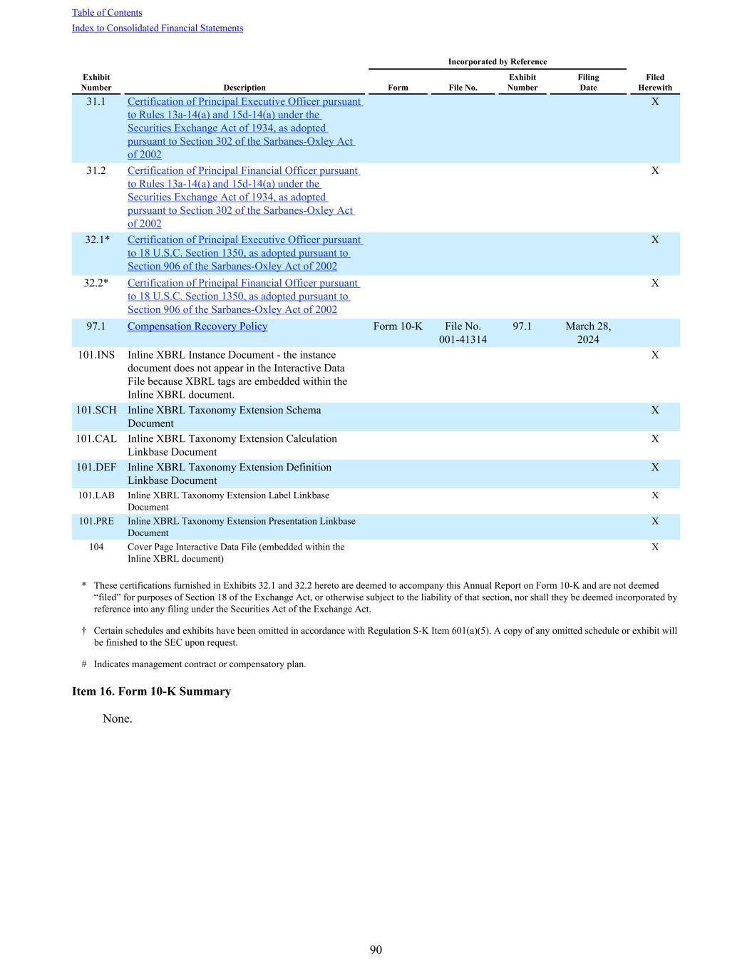 31.1 Certification of Principal Executive Officer pursuant to Rules 13a-14(a) and 15d-14(a) under the Securities Exchange Act of 1934, as adopted pursuant to Section 302 of the Sarbanes-Oxley Act of 2002 X 31.2 Certification of Principal Financial Officer pursuant to Rules 13a-14(a) and 15d-14(a) under the Securities Exchange Act of 1934, as adopted pursuant to Section 302 of the Sarbanes-Oxley Act of 2002 X 32.1* Certification of Principal Executive Officer pursuant to 18 U.S.C. Section 1350, as adopted pursuant to Section 906 of the Sarbanes-Oxley Act of 2002 X 32.2* Certification of Principal Financial Officer pursuant to 18 U.S.C. Section 1350, as adopted pursuant to Section 906 of the Sarbanes-Oxley Act of 2002 X 97.1 Compensation Recovery Policy Form 10-K File No. 001-41314 97.1 March 28, 2024 101.INS Inline XBRL Instance Document - the instance document does not appear in the Interactive Data File because XBRL tags are embedded within the Inline XBRL document. X 101.SCH Inline XBRL Taxonomy Extension Schema Document X 101.CAL Inline XBRL Taxonomy Extension Calculation Linkbase Document X 101.DEF Inline XBRL Taxonomy Extension Definition Linkbase Document X 101.LAB Inline XBRL Taxonomy Extension Label Linkbase Document X 101.PRE Inline XBRL Taxonomy Extension Presentation Linkbase Document X 104 Cover Page Interactive Data File (embedded within the Inline XBRL document) X Incorporated by Reference Exhibit Number Description Form File No. Exhibit Number Filing Date Filed Herewith * These certifications furnished in Exhibits 32.1 and 32.2 hereto are deemed to accompany this Annual Report on Form 10-K and are not deemed “filed” for purposes of Section 18 of the Exchange Act, or otherwise subject to the liability of that section, nor shall they be deemed incorporated by reference into any filing under the Securities Act of the Exchange Act. † Certain schedules and exhibits have been omitted in accordance with Regulation S-K Item 601(a)(5). A copy of any omitted schedule or exhibit will be finished to the SEC upon request. # Indicates management contract or compensatory plan. Item 16. Form 10-K Summary None. Table of Contents Index to Consolidated Financial Statements 90