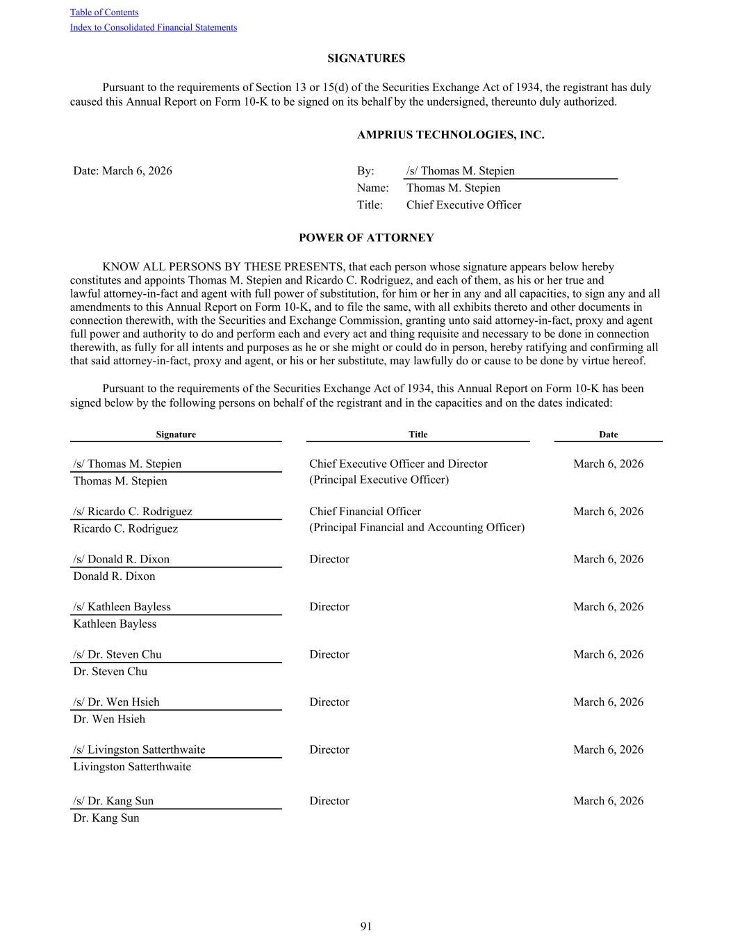 SIGNATURES Pursuant to the requirements of Section 13 or 15(d) of the Securities Exchange Act of 1934, the registrant has duly caused this Annual Report on Form 10-K to be signed on its behalf by the undersigned, thereunto duly authorized. AMPRIUS TECHNOLOGIES, INC. Date: March 6, 2026 By: /s/ Thomas M. Stepien Name: Thomas M. Stepien Title: Chief Executive Officer POWER OF ATTORNEY KNOW ALL PERSONS BY THESE PRESENTS, that each person whose signature appears below hereby constitutes and appoints Thomas M. Stepien and Ricardo C. Rodriguez, and each of them, as his or her true and lawful attorney-in-fact and agent with full power of substitution, for him or her in any and all capacities, to sign any and all amendments to this Annual Report on Form 10-K, and to file the same, with all exhibits thereto and other documents in connection therewith, with the Securities and Exchange Commission, granting unto said attorney-in-fact, proxy and agent full power and authority to do and perform each and every act and thing requisite and necessary to be done in connection therewith, as fully for all intents and purposes as he or she might or could do in person, hereby ratifying and confirming all that said attorney-in-fact, proxy and agent, or his or her substitute, may lawfully do or cause to be done by virtue hereof. Pursuant to the requirements of the Securities Exchange Act of 1934, this Annual Report on Form 10-K has been signed below by the following persons on behalf of the registrant and in the capacities and on the dates indicated: Signature Title Date /s/ Thomas M. Stepien Chief Executive Officer and Director March 6, 2026 Thomas M. Stepien (Principal Executive Officer) /s/ Ricardo C. Rodriguez Chief Financial Officer March 6, 2026 Ricardo C. Rodriguez (Principal Financial and Accounting Officer) /s/ Donald R. Dixon Director March 6, 2026 Donald R. Dixon /s/ Kathleen Bayless Director March 6, 2026 Kathleen Bayless /s/ Dr. Steven Chu Director March 6, 2026 Dr. Steven Chu /s/ Dr. Wen Hsieh Director March 6, 2026 Dr. Wen Hsieh /s/ Livingston Satterthwaite Director March 6, 2026 Livingston Satterthwaite /s/ Dr. Kang Sun Director March 6, 2026 Dr. Kang Sun Table of Contents Index to Consolidated Financial Statements 91