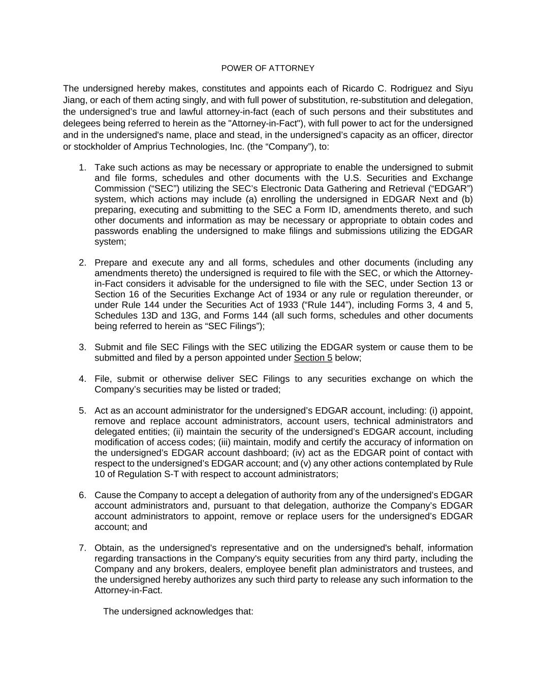 POWER OF ATTORNEY The undersigned hereby makes, constitutes and appoints each of Ricardo C. Rodriguez and Siyu Jiang, or each of them acting singly, and with full power of substitution, re-substitution and delegation, the undersigned’s true and lawful attorney-in-fact (each of such persons and their substitutes and delegees being referred to herein as the "Attorney-in-Fact"), with full power to act for the undersigned and in the undersigned's name, place and stead, in the undersigned’s capacity as an officer, director or stockholder of Amprius Technologies, Inc. (the “Company”), to: 1. Take such actions as may be necessary or appropriate to enable the undersigned to submit and file forms, schedules and other documents with the U.S. Securities and Exchange Commission (“SEC”) utilizing the SEC’s Electronic Data Gathering and Retrieval (“EDGAR”) system, which actions may include (a) enrolling the undersigned in EDGAR Next and (b) preparing, executing and submitting to the SEC a Form ID, amendments thereto, and such other documents and information as may be necessary or appropriate to obtain codes and passwords enabling the undersigned to make filings and submissions utilizing the EDGAR system; 2. Prepare and execute any and all forms, schedules and other documents (including any amendments thereto) the undersigned is required to file with the SEC, or which the Attorney- in-Fact considers it advisable for the undersigned to file with the SEC, under Section 13 or Section 16 of the Securities Exchange Act of 1934 or any rule or regulation thereunder, or under Rule 144 under the Securities Act of 1933 (“Rule 144”), including Forms 3, 4 and 5, Schedules 13D and 13G, and Forms 144 (all such forms, schedules and other documents being referred to herein as “SEC Filings”); 3. Submit and file SEC Filings with the SEC utilizing the EDGAR system or cause them to be submitted and filed by a person appointed under Section 5 below; 4. File, submit or otherwise deliver SEC Filings to any securities exchange on which the Company’s securities may be listed or traded; 5. Act as an account administrator for the undersigned’s EDGAR account, including: (i) appoint, remove and replace account administrators, account users, technical administrators and delegated entities; (ii) maintain the security of the undersigned’s EDGAR account, including modification of access codes; (iii) maintain, modify and certify the accuracy of information on the undersigned’s EDGAR account dashboard; (iv) act as the EDGAR point of contact with respect to the undersigned’s EDGAR account; and (v) any other actions contemplated by Rule 10 of Regulation S-T with respect to account administrators; 6. Cause the Company to accept a delegation of authority from any of the undersigned’s EDGAR account administrators and, pursuant to that delegation, authorize the Company’s EDGAR account administrators to appoint, remove or replace users for the undersigned’s EDGAR account; and 7. Obtain, as the undersigned's representative and on the undersigned's behalf, information regarding transactions in the Company's equity securities from any third party, including the Company and any brokers, dealers, employee benefit plan administrators and trustees, and the undersigned hereby authorizes any such third party to release any such information to the Attorney-in-Fact. The undersigned acknowledges that:
